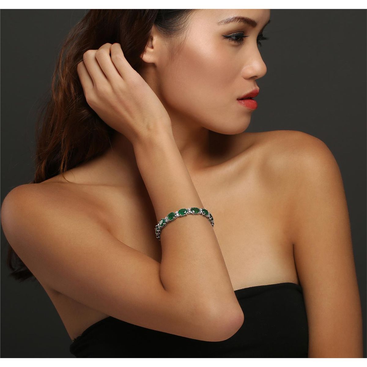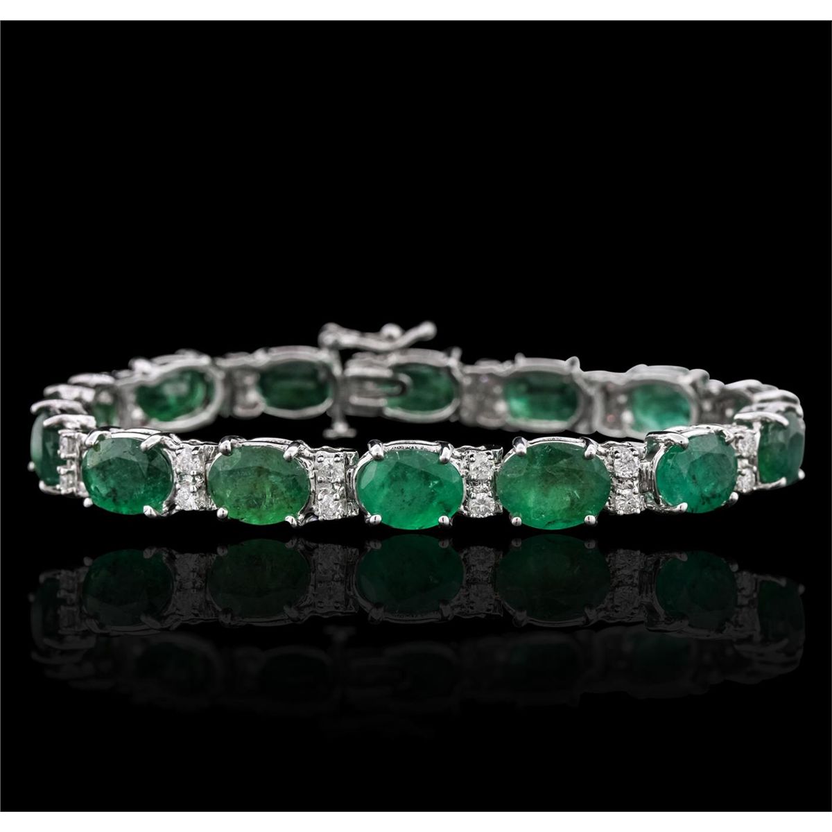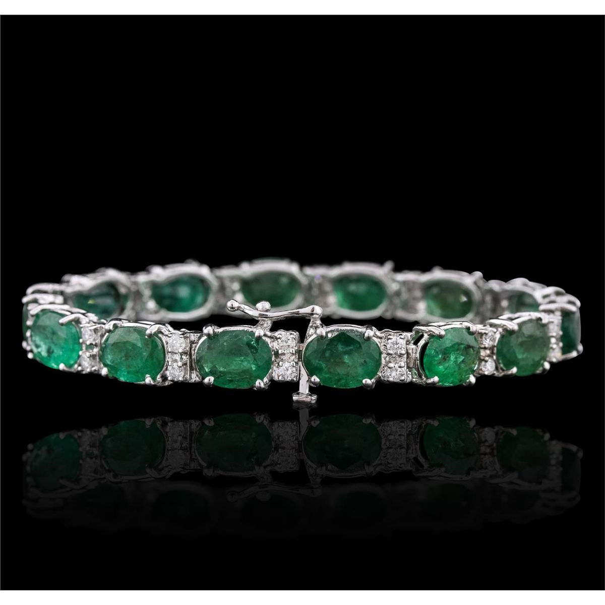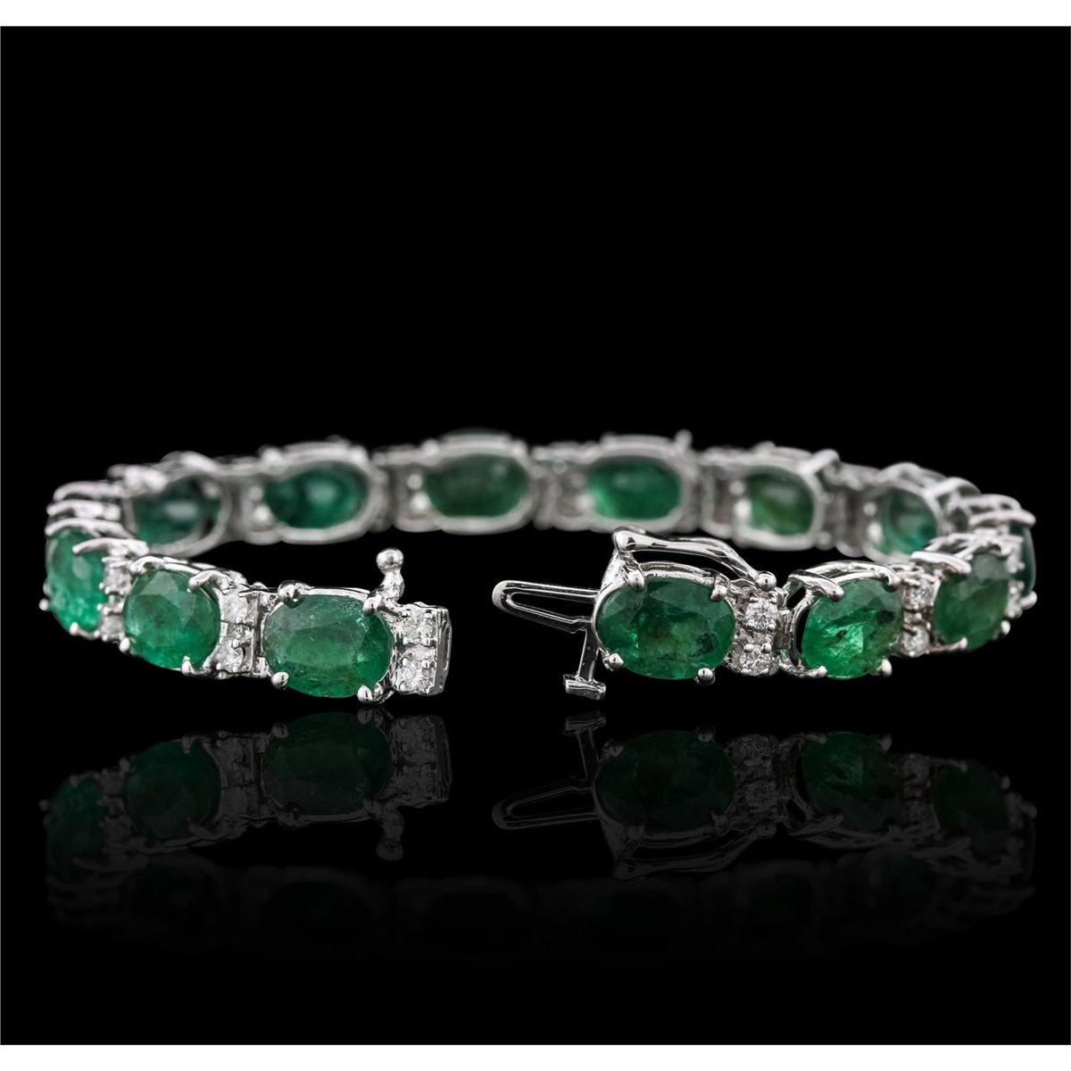 14KT White Gold 18.48ctw Emerald and Diamond Bracelet. One electronically tested 14KT white gold ladies combination cast & assembled bracelet with a bright polish finish. Measurements: 7" in length. Identified with markings of "14K". Condition is new. Containing: Fourteen prong set oval modified brilliant cut natural emeralds, measuring 8.80 x 6.80 x 3.98mm, approximate total weight of 18.48ct., clarity is heavily included, type III, medium light, very slightly grayish, green color, (GIA G 4/3), cut is good. Twenty-Eight prong set round brilliant cut diamonds, measuring 2.20 - 2.20 x 1.32mm (depth est.) approximate total weight of 28 Stones = 1.26ct. Clarity: I-1 to I-2. Color: I - J, Cut is Good. Colored gemstones are presumed to have been subjected to commonly used enhancement processes. All diamonds and colored gemstones are graded in the mounting, unless otherwise stated. Total Weight of Colored Stones 18.48ct. Total Weight of Diamonds 1.26ct. Total Weight of Bracelet 19.20 grams. GGL Appraised at $26,590.00.
