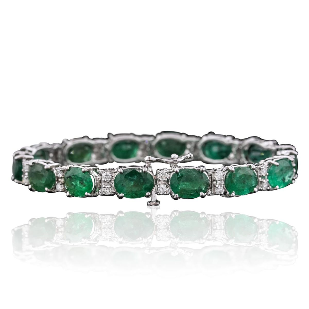 14KT White Gold 18.48ctw Emerald and Diamond Bracelet. One electronically tested 14KT white gold ladies combination cast & assembled bracelet with a bright polish finish. Measurements: 7" in length. Identified with markings of "14K". Condition is new. Containing: Fourteen prong set oval modified brilliant cut natural emeralds, measuring 8.80 x 6.80 x 3.98mm, approximate total weight of 18.48ct., clarity is heavily included, type III, medium light, very slightly grayish, green color, (GIA G 4/3), cut is good. Twenty-Eight prong set round brilliant cut diamonds, measuring 2.20 - 2.20 x 1.32mm (depth est.) approximate total weight of 28 Stones = 1.26ct. Clarity: I-1 to I-2. Color: I - J, Cut is Good. Colored gemstones are presumed to have been subjected to commonly used enhancement processes. All diamonds and colored gemstones are graded in the mounting, unless otherwise stated. Total Weight of Colored Stones 18.48ct. Total Weight of Diamonds 1.26ct. Total Weight of Bracelet 19.20 grams. GGL Appraised at $26,590.00.