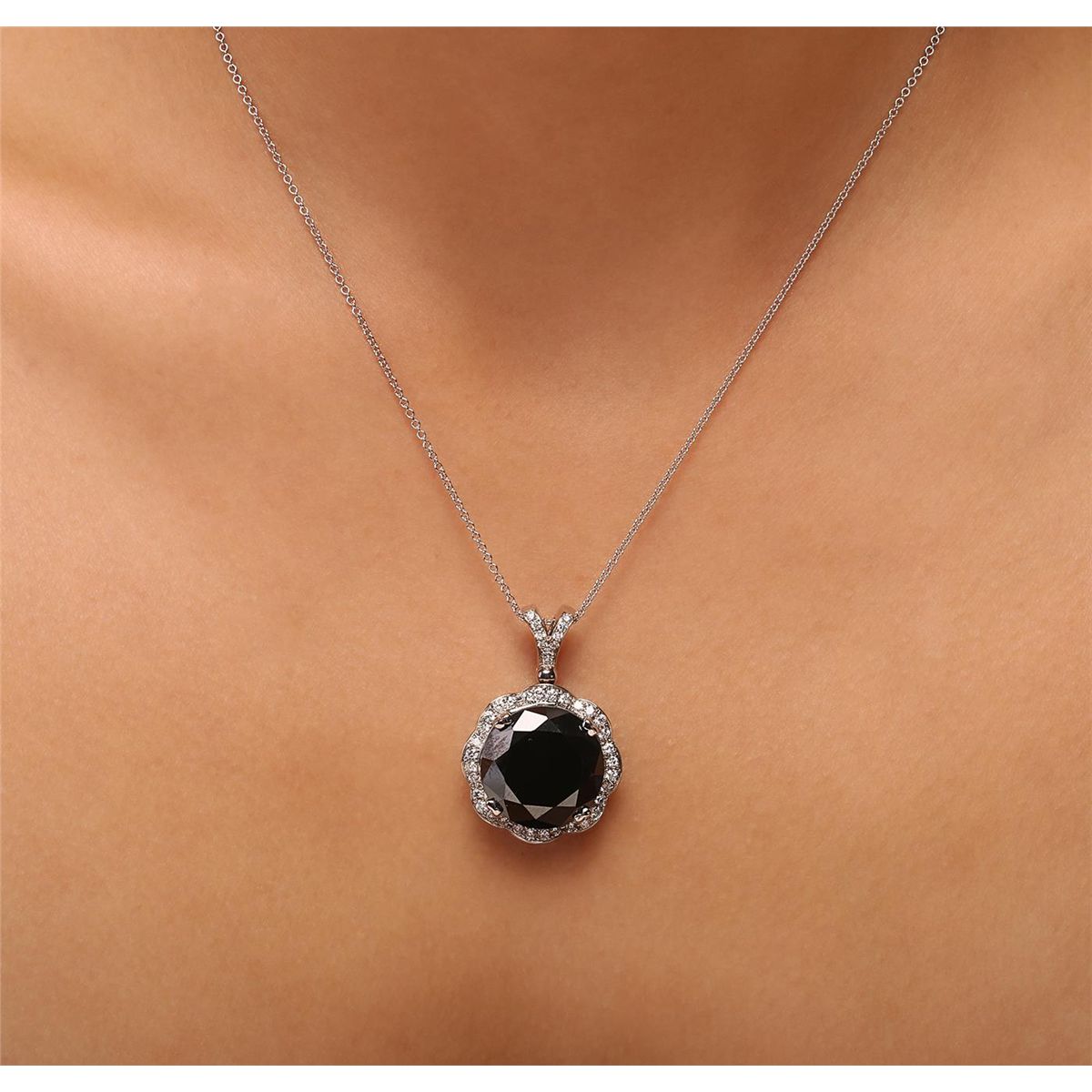 One electronically tested 14KT white gold Ladies combination cast & assembled pendant & chain 16.0" long, small cable link with a lobster claw clasp with a bright polish finish. Condition is new. Identified with markings of "14K". Containing: One prong set round brilliant cut diamond, measuring 17.33 - 17.23 x 9.90mm (depth est.) approximate weight of 18.03ct. Cut is Good. The color of the stone has been irradiated. Forty-Two prong set round brilliant cut diamonds, measuring 1.60 - 1.60 x 0.96mm (depth est.) approximate. Total Weight of 42 Stones = 0.63ct. Clarity: SI-2 to I-1. Color: I - J, Cut is Good. All diamonds are graded in the mounting, unless otherwise stated. Total Weight of Diamonds 18.66ct. Total Weight of Pendant & Chain 13.30 grams.. GGL Appraised at $22,870.00.
