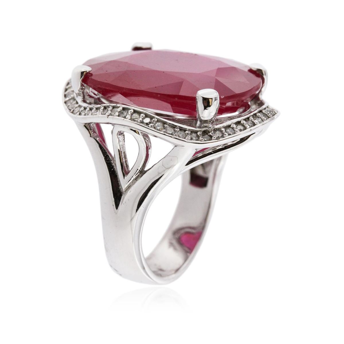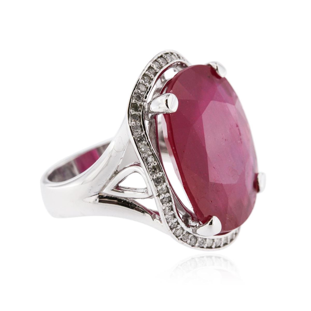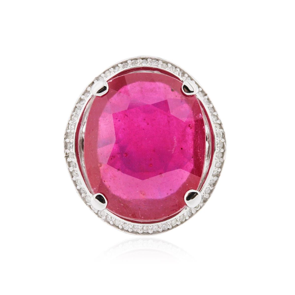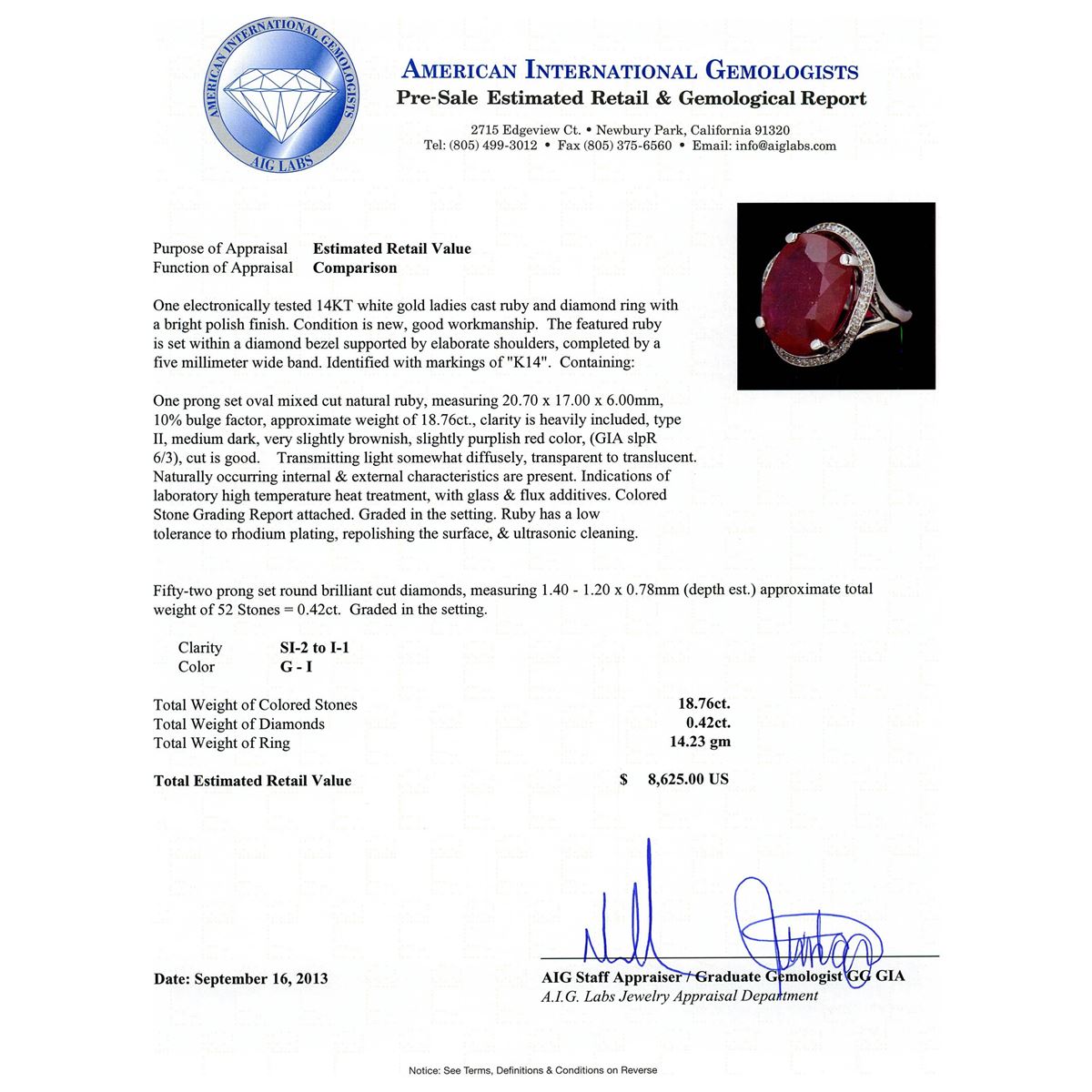 One electronically tested 14KT white gold ladies cast ruby and diamond ring with a bright polish finish. Condition is new, good workmanship. The featured ruby is set within a diamond bezel supported by elaborate shoulders, completed by a five millimeter wide band. Identified with markings of "K14". Containing: One prong set oval mixed cut natural ruby, measuring 20.70 x 17.00 x 6.00mm, 10% bulge factor, approximate weight of 18.76ct., clarity is heavily included, type II, medium dark, very slightly brownish, slightly purplish red color, (GIA slpR 6/3), cut is good. Transmitting light somewhat diffusely, transparent to translucent. Naturally occurring internal & external characteristics are present. Indications of laboratory high temperature heat treatment, with glass & flux additives. Colored Stone Grading Report attached. Graded in the setting. Ruby has a low tolerance to rhodium plating, repolishing the surface, & ultrasonic cleaning. Fifty-two prong set round brilliant cut diamonds, measuring 1.40 - 1.20 x 0.78mm (depth est.) approximate total weight of 52 Stones = 0.42ct. Graded in the setting. Clarity SI-2 to I- 1. Color G - I. Total Weight of Colored Stones 18.76ct. Total Weight of Diamonds 0.42ct. Total Weight of Ring 14.23gm. AIG Appraised at $8,625.00.
