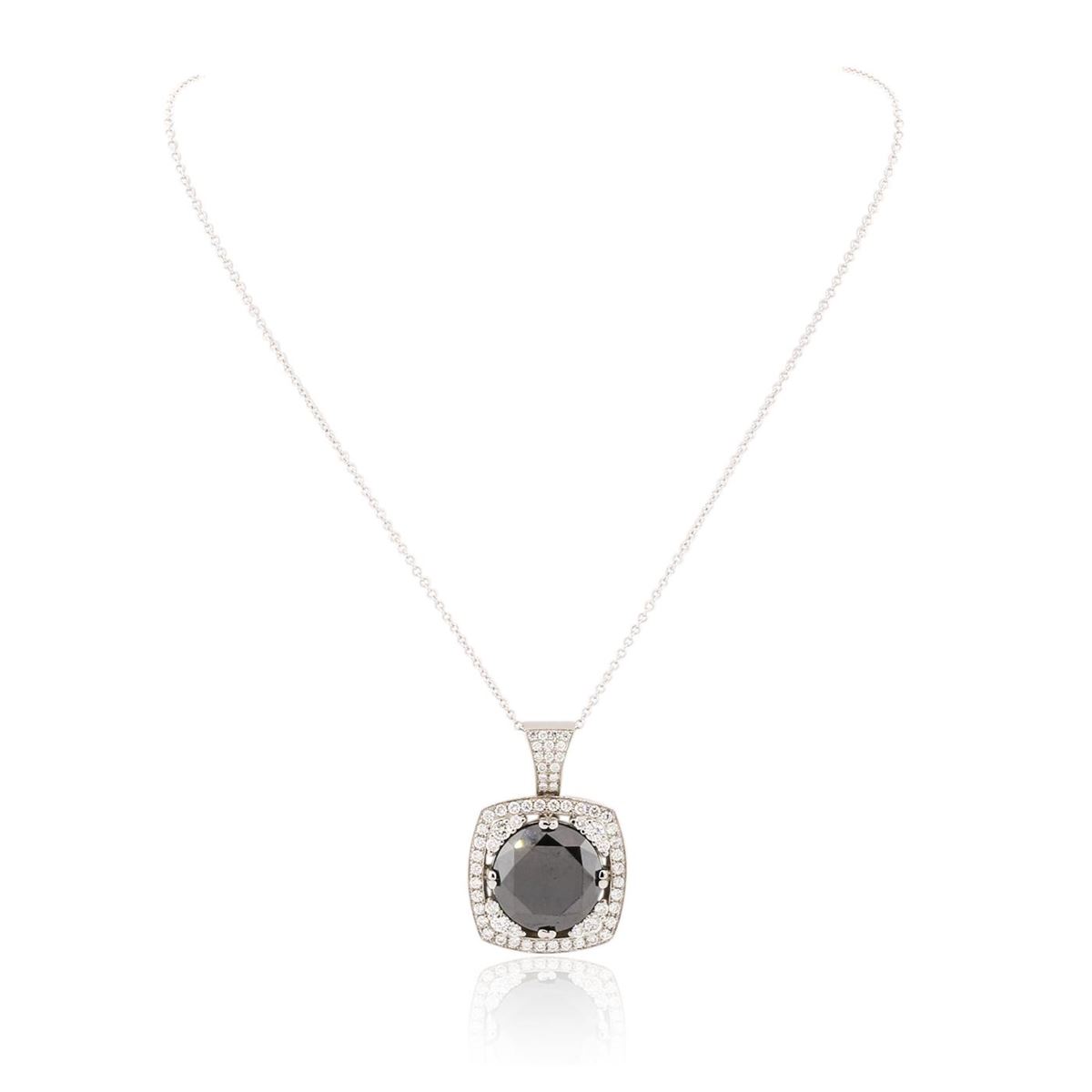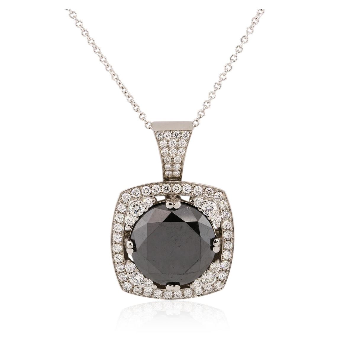 One electronically tested 14KT white gold ladies cast & assembled black and white diamond pendant with chain. The pendant features a black diamond set within a white diamond bezel, completed by a white diamond set bail. The pendant is supported by a sixteen inch length 14KT white gold designer style link chain, terminating in a lobster claw clasp. Bright polish finish. Identified with markings of "14K". Condition is good. Containing: One prong set round brilliant cut diamond, measuring 17.00 - 16.90 x 8.90mm (depth est.), 8.00% GTCF approximate weight of 16.94ct. Indications of multiple laboratory enhancements. The specific gravity of black diamond is 3.120 to 3.165. Diamond tester results are non-reactive. Graded in the setting. Clarity Declasse. Color: Fancy Black; Irradiated. Depth: 52.5%. Table: 67.8%. Sixty-One prong set round brilliant cut diamonds, measuring 1.90 - 1.70 x 1.08mm (depth est.) approximate total weight of 61 Stones = 1.40ct. Graded in the setting. Clarity: VS-2 to SI-2. Color: G - I Four prong set round brilliant cut diamonds, measuring 3.10 - 3.00 x 1.83mm (depth est.) approximate total weight of 4 Stones = 0.50ct. Graded in the setting. Clarity: SI-1 to SI-2. Color: H - I. Total Weight of Diamonds 18.84ct. Total Weight of Pendant With Chain 17.47 grams. AIG Appraised at $18,680.00.