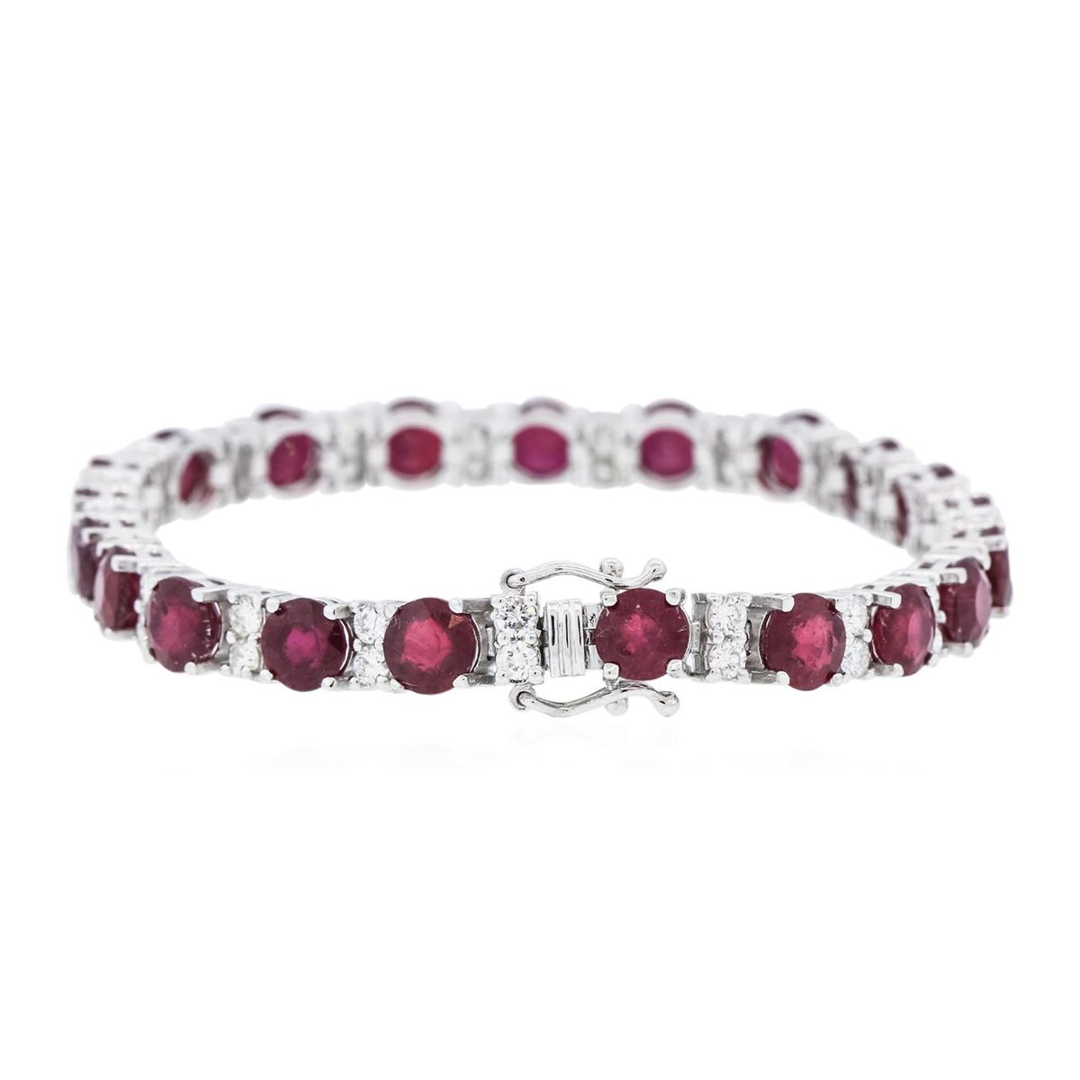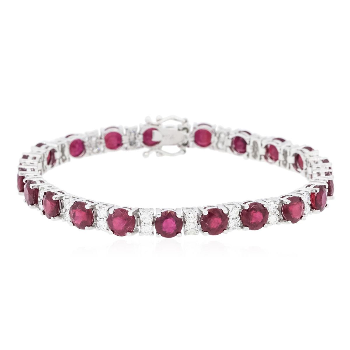 One electronically tested 14KT white gold ladies combination cast & assembled ruby and diamond bracelet with a hidden box clasp with safety closer with a bright polish finish. Measurements: 7.25" in length Identified with markings of "14K". Condition is new. Containing: Twenty-one prong set round modified brilliant cut natural rubies, measuring 5.89 - 5.89 x 4.06 mm, approximate total weight of 18.90ct., clarity is heavily included, medium dark, moderately strong, slightly purplish red color, (GIA slpR 6/4), cut is good. Forty-Two prong set round brilliant cut diamonds, measuring 2.40 - 2.40 x 1.44mm (depth est.) approximate total weight of 42 Stones = 2.13ct. Clarity: SI-1 to I-1. Color: I - J, Cut is Good. Colored gemstones are presumed to have been subjected to commonly used enhancement processes. All diamonds and colored gemstones are graded in the mounting, unless otherwise stated. Total Weight of Colored Stones 18.90ct. Total Weight of Diamonds 2.13ct. Total Weight of Bracelet 20.80 grams. GGL Appraised at $16,970.00.