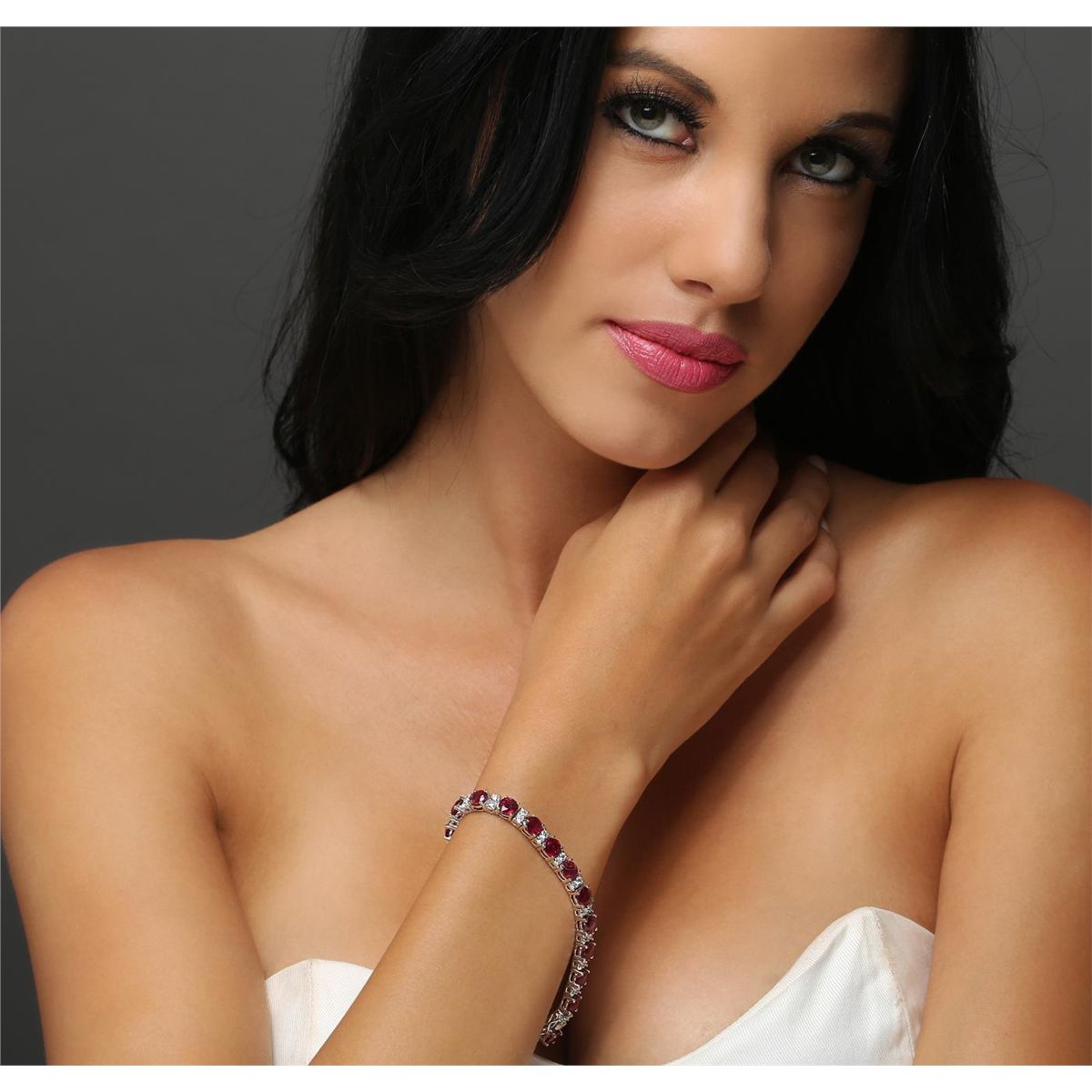 One electronically tested 14KT white gold ladies combination cast & assembled ruby and diamond bracelet with a hidden box clasp with safety closer with a bright polish finish. Measurements: 7.25" in length Identified with markings of "14K". Condition is new. Containing: Twenty-one prong set round modified brilliant cut natural rubies, measuring 5.89 - 5.89 x 4.06 mm, approximate total weight of 18.90ct., clarity is heavily included, medium dark, moderately strong, slightly purplish red color, (GIA slpR 6/4), cut is good. Forty-Two prong set round brilliant cut diamonds, measuring 2.40 - 2.40 x 1.44mm (depth est.) approximate total weight of 42 Stones = 2.13ct. Clarity: SI-1 to I-1. Color: I - J, Cut is Good. Colored gemstones are presumed to have been subjected to commonly used enhancement processes. All diamonds and colored gemstones are graded in the mounting, unless otherwise stated. Total Weight of Colored Stones 18.90ct. Total Weight of Diamonds 2.13ct. Total Weight of Bracelet 20.80 grams. GGL Appraised at $16,970.00.