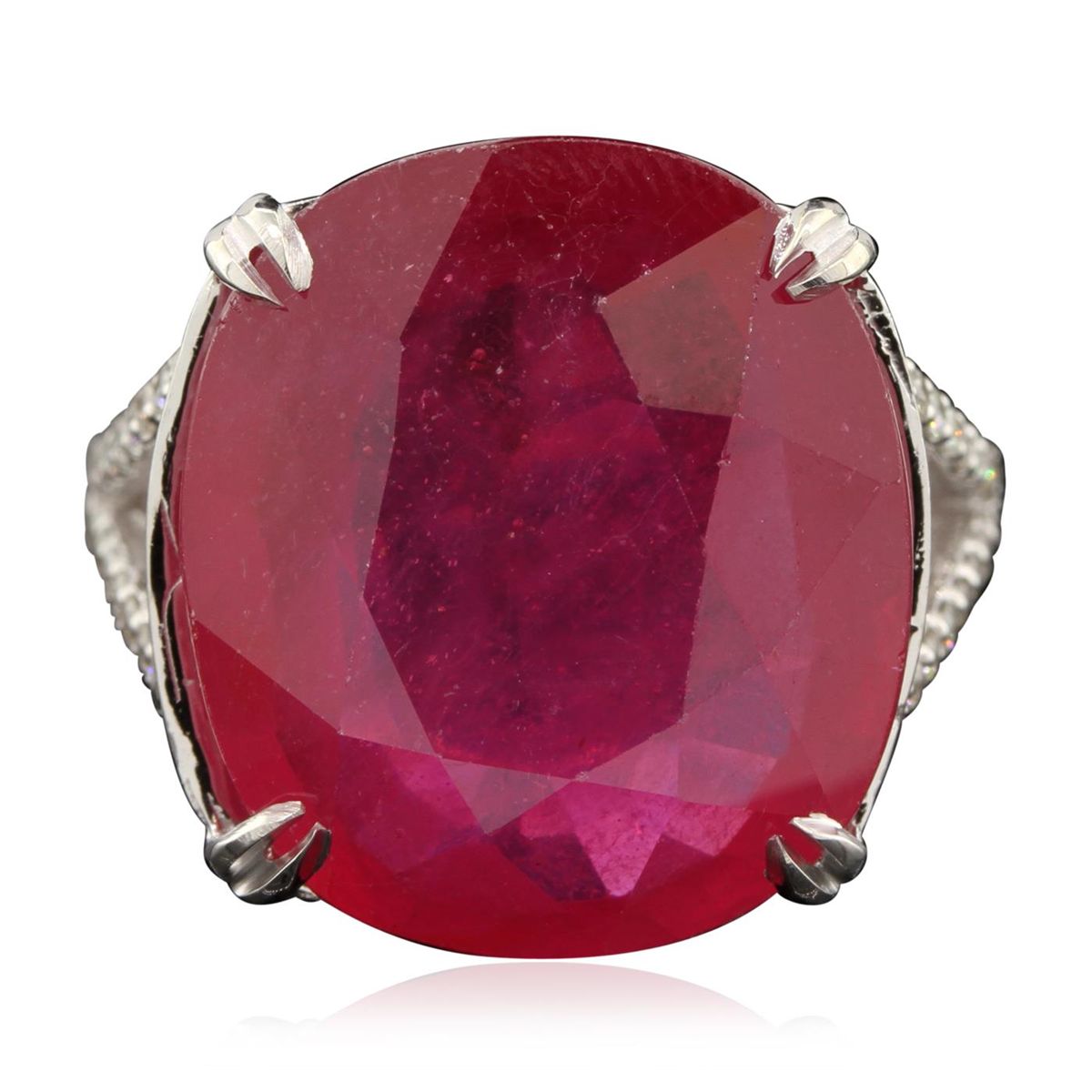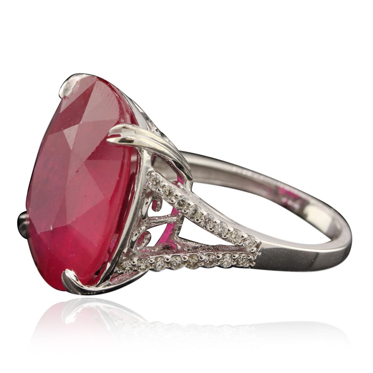 One electronically tested 14KT white gold Ladies combination cast & assembled cocktail ring with a bright polish finish. Identified with markings of "14K". Condition is excellent. Containing: One prong set square cushion modified brilliant cut natural ruby, measuring 17.80 x 15.70 x 7.17mm, approximate weight of 18.92ct., clarity is heavily included, type II, medium dark, moderately strong, strongly purplish red color, (GIA stpR 6/4), cut is good. Indications of heat treatment with glass and flux residue. Colored gemstones are presumed to have been subjected to commonly used and possible undetectable color/clarity enhancement processes. Thirty-Two prong set round brilliant cut diamonds, measuring 1.20 - 1.20 x 0.72mm (depth est.) approximate total weight of 32 Stones = 0.26ct. Clarity of SI-1 to SI-2, Color of G - H. Total Weight of Colored Stones 18.92ct. Total Weight of Diamonds 0.26ct. Total Weight of Ring 8.70gm. GGL Appraised at $8,200.00.