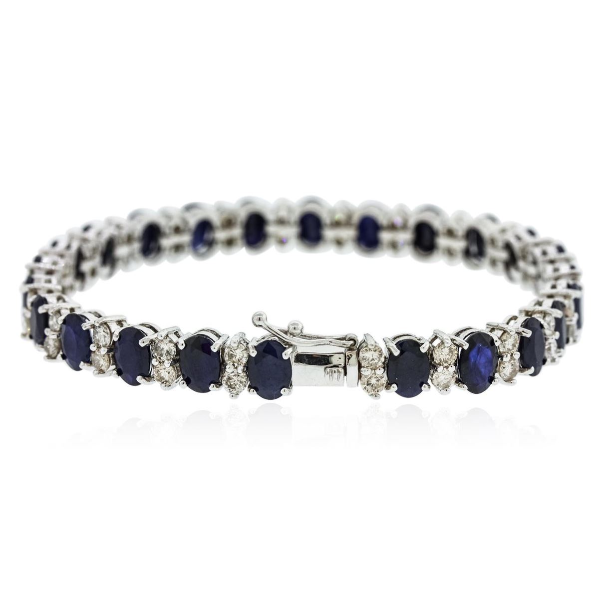 One electronically tested 14KT white gold Ladies combination cast & assembled bracelet with a hidden box clasp with a bright polish finish. Measurements: 7.5" in length. Condition is excellent. Containing: Twenty-four prong set oval modified brilliant cut natural blue sapphires, measuring 6.90 x 5.70 x 2.50mm, approximate total weight of 18.96ct., clarity is heavily included, type II, dark, moderately strong, blue color, (GIA B 7/4), cut is good. Colored gemstones are presumed to have been subjected to commonly used and possible undetectable color/clarity enhancement processes. Forty-Eight prong set round brilliant cut diamonds, measuring 2.90 - 2.90 x 1.74mm (depth est.) approximate total weight of 48 Stones = 4.28ct. Clarity of I-1 to I-2, Color of K - L, Cut is Good. Total Weight of Colored Stones 18.96ct. Total Weight of Diamonds 4.28ct. Total Weight of Bracelet 25.20gm. GGL Appraised at $18,875.00.
