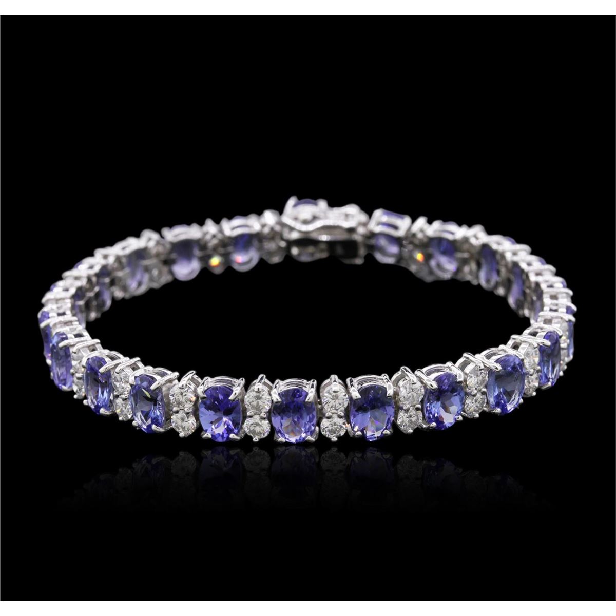One electronically tested 14KT white gold ladies combination cast & assembled tanzanite and diamond bracelet with a hidden box clasp with a bright polish finish. Measurements: 7" in length. Condition is new. Containing: Twenty-two prong set oval modified brilliant cut natural tanzanites, measuring 7.00 x 5.00 x 3.62mm, approximate total weight of 19.14ct., clarity is eye clean, type I, medium light, very slightly grayish, violet color, (GIA V 4/3), cut is good. Forty-Four prong set round brilliant cut diamonds, measuring 3.00 - 3.00 x 1.80mm (depth est.) approximate total weight of 44 Stones = 4.35ct. Clarity: SI-1 to I-1. Color: I - J, Cut is Good. Colored gemstones are presumed to have been subjected to commonly used enhancement processes. All diamonds and colored gemstones are graded in the mounting, unless otherwise stated. Total Weight of Colored Stones 19.14ct. Total Weight of Diamonds 4.35ct. Total Weight of Bracelet 18.90 grams. GGL Appraised at $20,165.00.