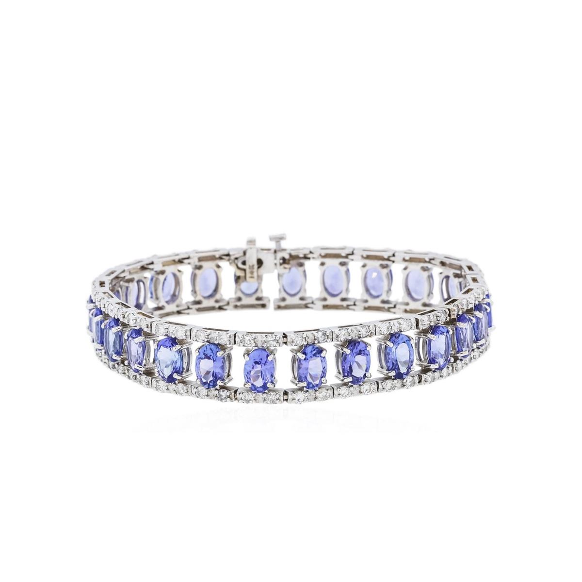 One electronically tested 14KT white gold ladies combination cast & assembled tanzanite and diamond bracelet with a hidden box clasp with a bright polish finish. Measurements: 7" in length. Identified with markings of "14K". Condition is new. Containing: Twenty-five prong set oval modified brilliant cut natural tanzanites, measuring 6.95 x 5.06 x 3.28mm, approximate total weight of 19.75ct., clarity is eye clean, type I, medium, moderately strong, violet color, (GIA V 5/4), cut is good. One Hundred prong set round brilliant cut diamonds, measuring 1.50 - 1.50 x 0.90mm (depth est.) approximate total weight of 100 Stones = 1.23ct. Clarity: SI-2 to I-2. Color: I - J, Cut is Good. Colored gemstones are presumed to have been subjected to commonly used enhancement processes. All diamonds and colored gemstones are graded in the mounting, unless otherwise stated. Total Weight of Colored Stones 19.75ct. Total Weight of Diamonds 1.23ct. Total Weight of Bracelet 27.30 grams. GGL Appraised at $25,880.00.