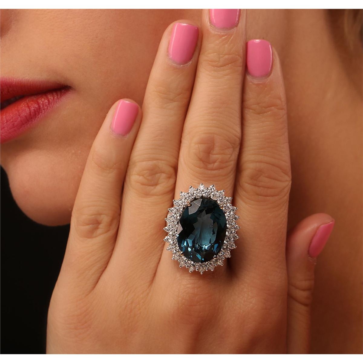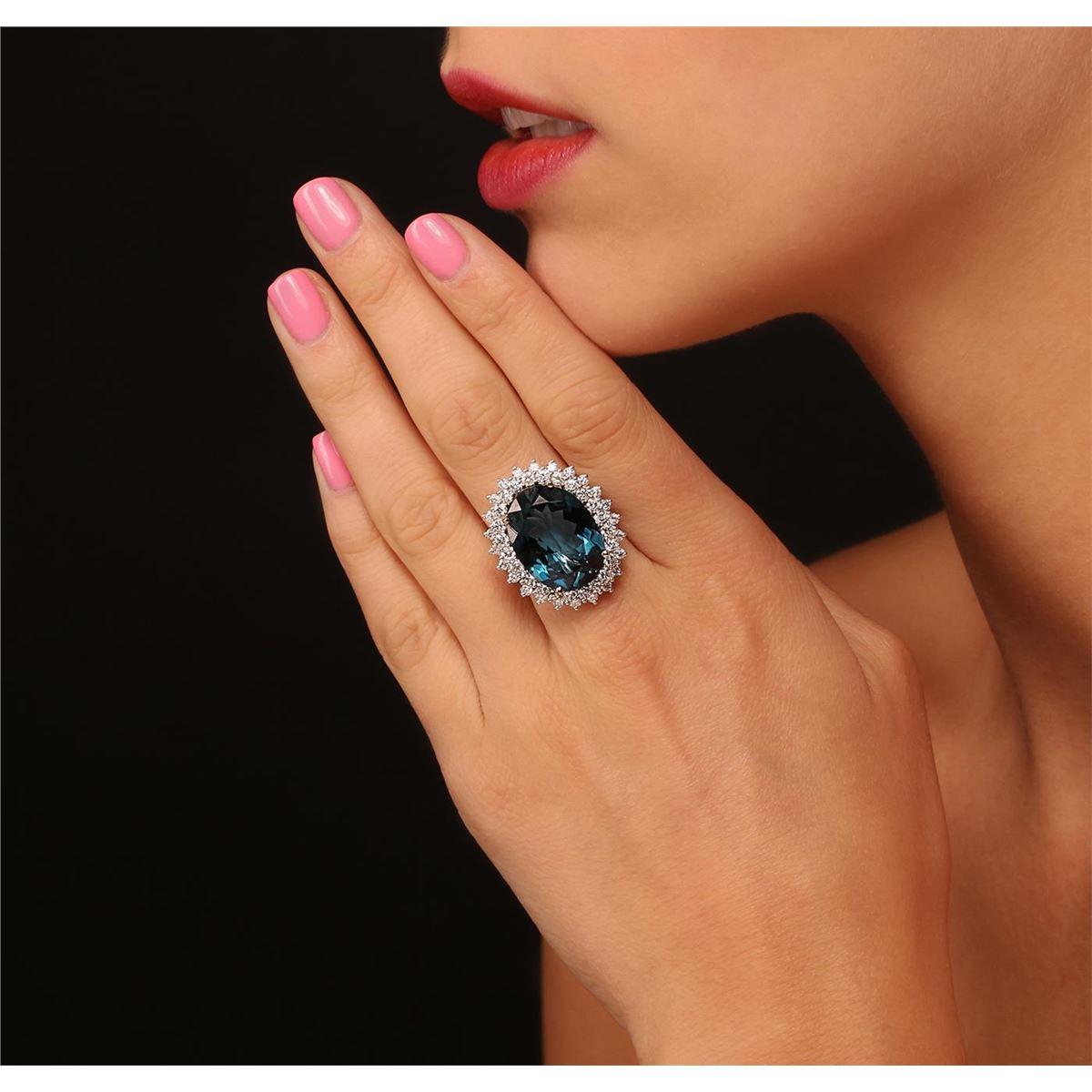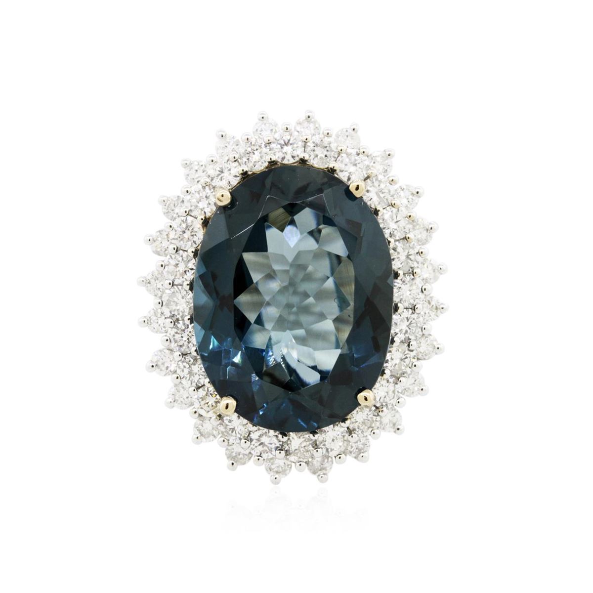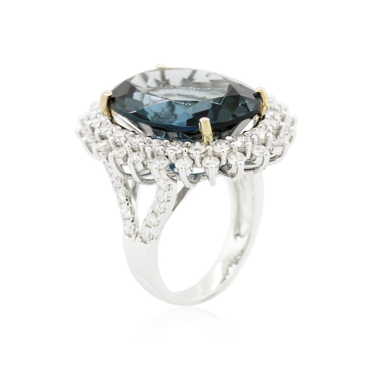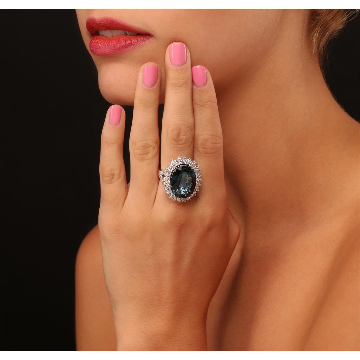 One electronically tested 14KT white gold ladies cast blue topaz and diamond ring with a bright polish finish. Condition is new, good workmanship. The featured blue topaz is set within a two tiered diamond lattice gallery, supported by diamond set split shoulders and completed by a three millimeter wide band. Identified with markings of "14K". Containing: One prong set oval mixed cut natural blue topaz, measuring 19.80 x 14.90 x 8.40mm, 8%. bulge factor, approximate weight of 19.77ct., clarity is eye clean, type I, medium, very slightly grayish, very slightly greenish blue color, (GIA vslgB 5/3), cut is good. Transmitting light with no distortion, transparent. Graded in the setting. A deposit of a thin layer has been applied to the topaz to produce the intense color effect. The process utilizes a very high temperature treatment, diffusion of ions into the topaz, plus in some cases neutron bombardment has been used to create the color center. Diffusion processes causes the added ions to become part of the crystal surface with no distinct boundary. Do not put a gem treated in this manner into an ultrasonic cleaner. Sixty-Eight prong set round brilliant cut diamonds, measuring 2.00 - 1.60 x 1.08mm (depth est.) approximate. Total Weight of 68 Stones = 1.84ct. Graded in the setting. Clarity: I-1 to I-2. Color: G - I. Total Weight of Colored Stones 19.77ct. Total Weight of Diamonds 1.84ct. Total Weight of Ring 12.60grams. AIG Appraised at $6,385.00.