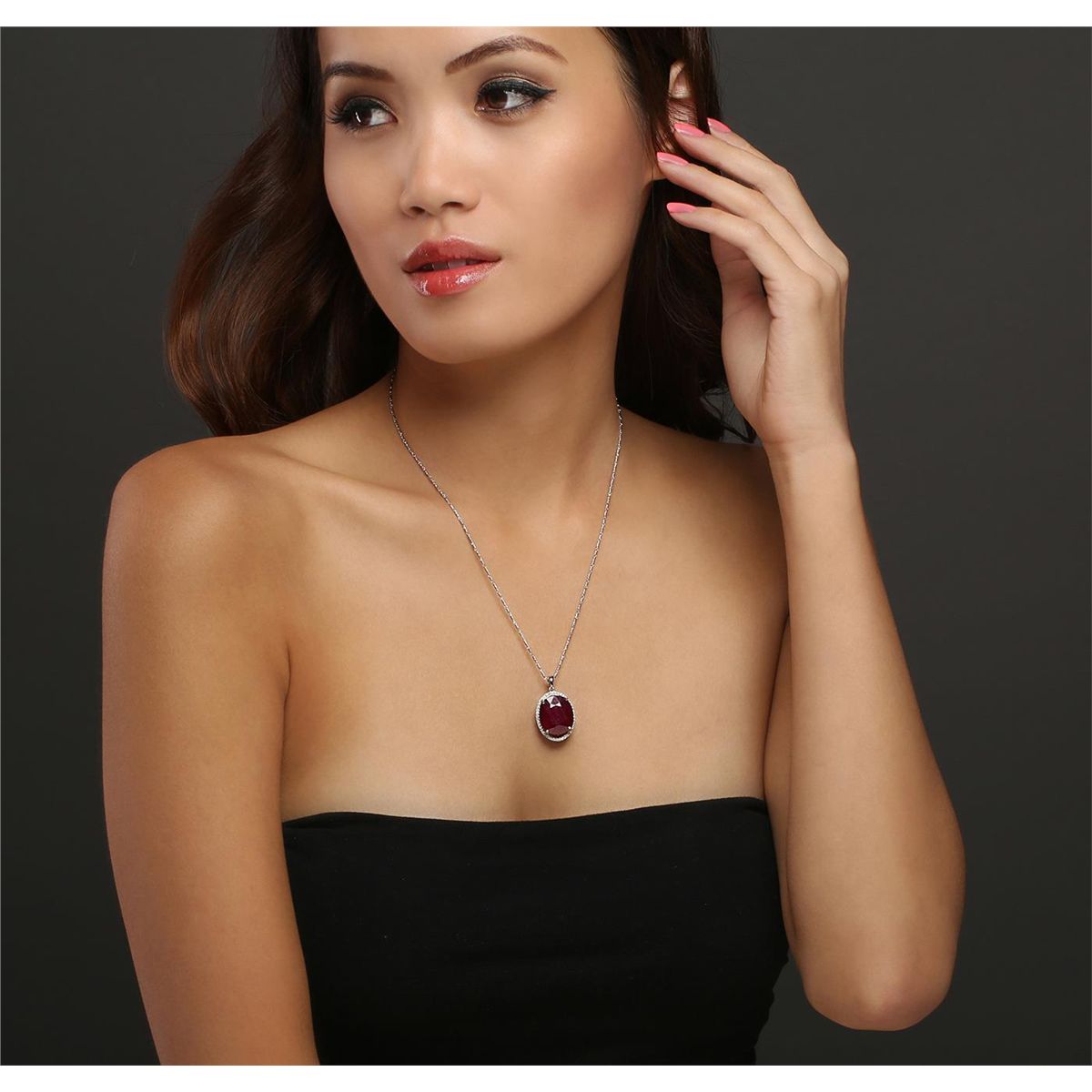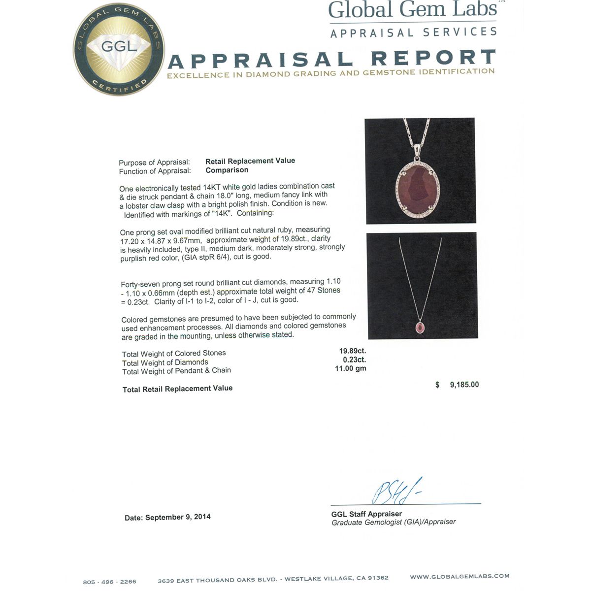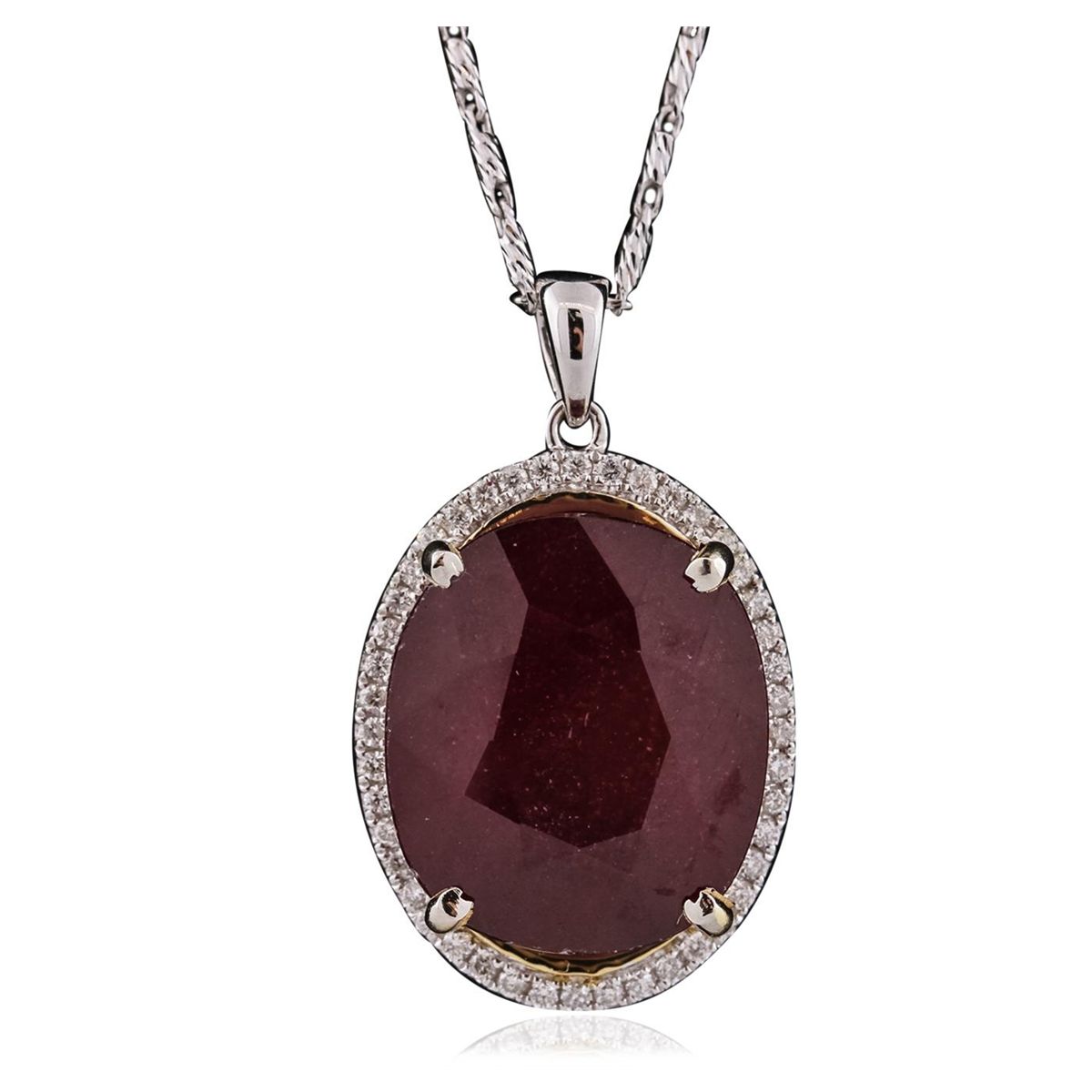One electronically tested 14KT white gold ladies combination cast & die struck pendant & chain 18.0" long, medium fancy link with a lobster claw clasp with a bright polish finish. Identified with markings of "14K". Condition is new. Containing: One prong set oval modified brilliant cut natural ruby, measuring 17.20 x 14.87 x 9.67mm, approximate weight of 19.89ct., clarity is heavily included, type II, medium dark, moderately strong, strongly purplish red color, (GIA stpR 6/4), cut is good. Forty-Seven prong set round brilliant cut diamonds, measuring 1.10 - 1.10 x 0.66mm (depth est.) approximate total weight of 47 Stones = 0.23ct. Clarity: I-1 to I-2. Color: I - J, Cut is Good. Colored gemstones are presumed to have been subjected to commonly used enhancement processes. All diamonds and colored gemstones are graded in the mounting, unless otherwise stated. Total Weight of Colored Stones 19.89ct. Total Weight of Diamonds 0.23ct. Total Weight of Pendant & Chain 11.00 grams. GGL Appraised at $9,185.00.