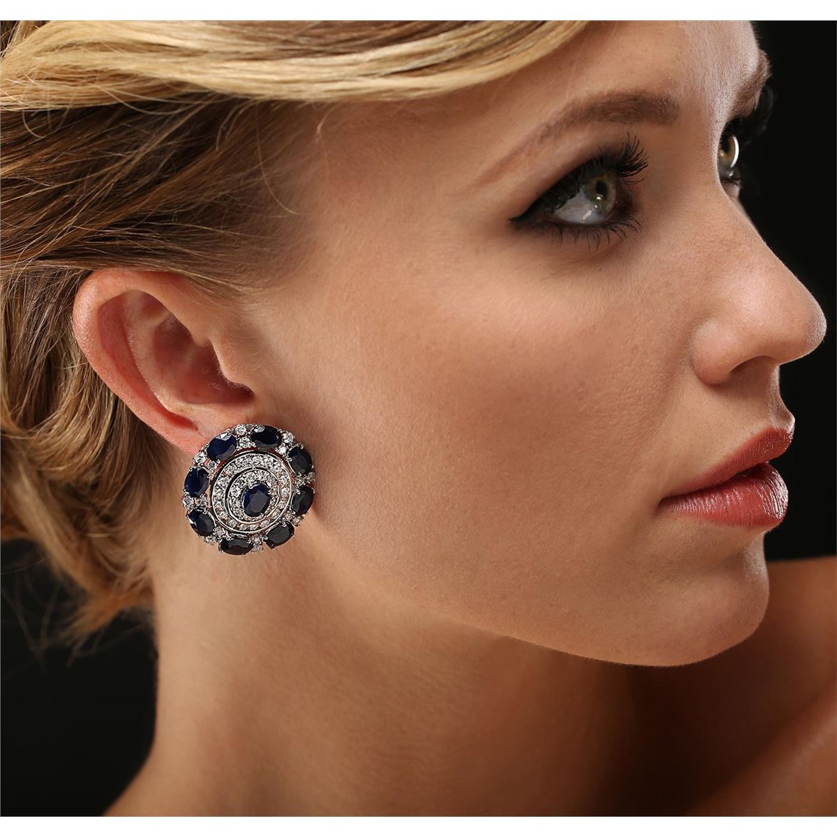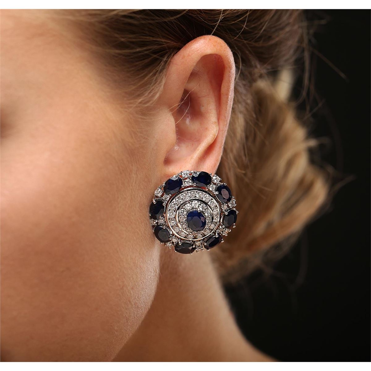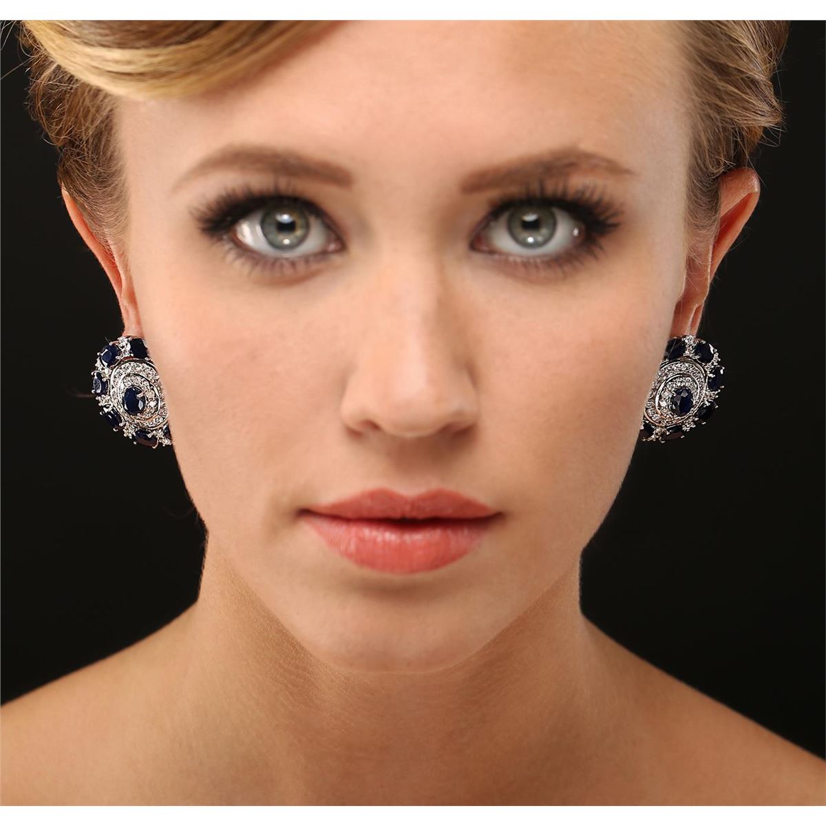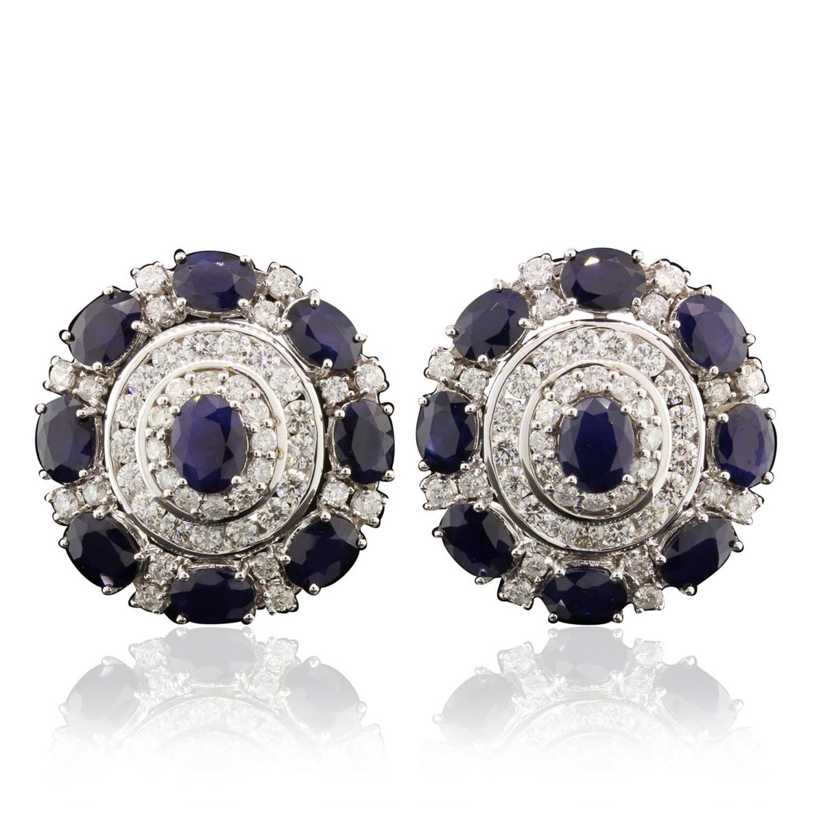 One pair electronically tested 14KT white gold ladies cast & assembled sapphire and diamond earrings with omega backs. Each earring features a sapphire and diamond floret. Bright polish finish. Identified with markings of "K14". Condition is new, good workmanship. Containing: Eighteen prong set oval mixed cut natural blue sapphires, measuring 7.80 x 5.80 x 3.50mm, approximate. Total Weight of 19.90ct., clarity is severely included, type II, dark, strong, violetish blue color, (GIA vB 7/5), cut is good. Transmitting light very diffusely, opaque. Naturally occurring internal & external characteristics are present. Indications of multiple laboratory enhancements, including high temperature heat treatment. Measurements & the color grade are an average for the group. Graded in the setting. Ninety prong and channel set round brilliant cut diamonds, measuring 2.80 - 2.30 x 1.53mm (depth est.) approximate. Total Weight of 90 Stones = 5.76ct. Graded in the setting. Clarity: SI-2 to I-2 . Color: F - H. Total Weight of Colored Stones 19.90ct. Total Weight of Diamonds 5.76ct. AIG Appraised at $22,365.00.