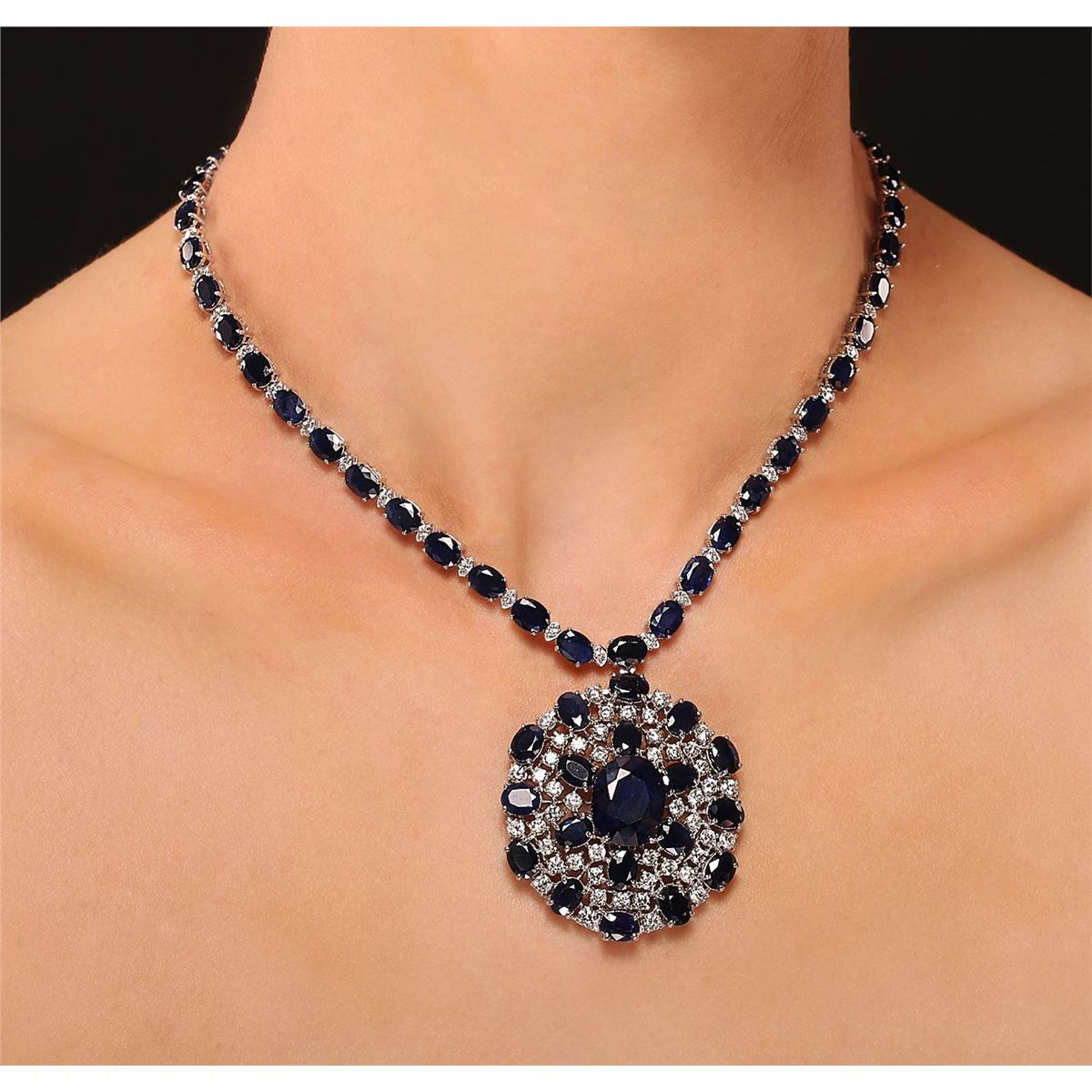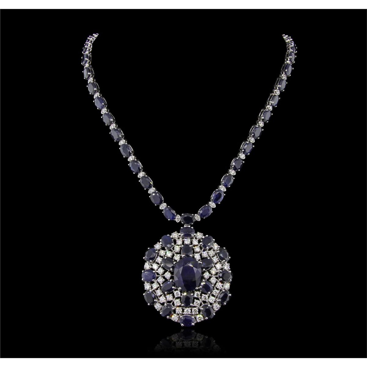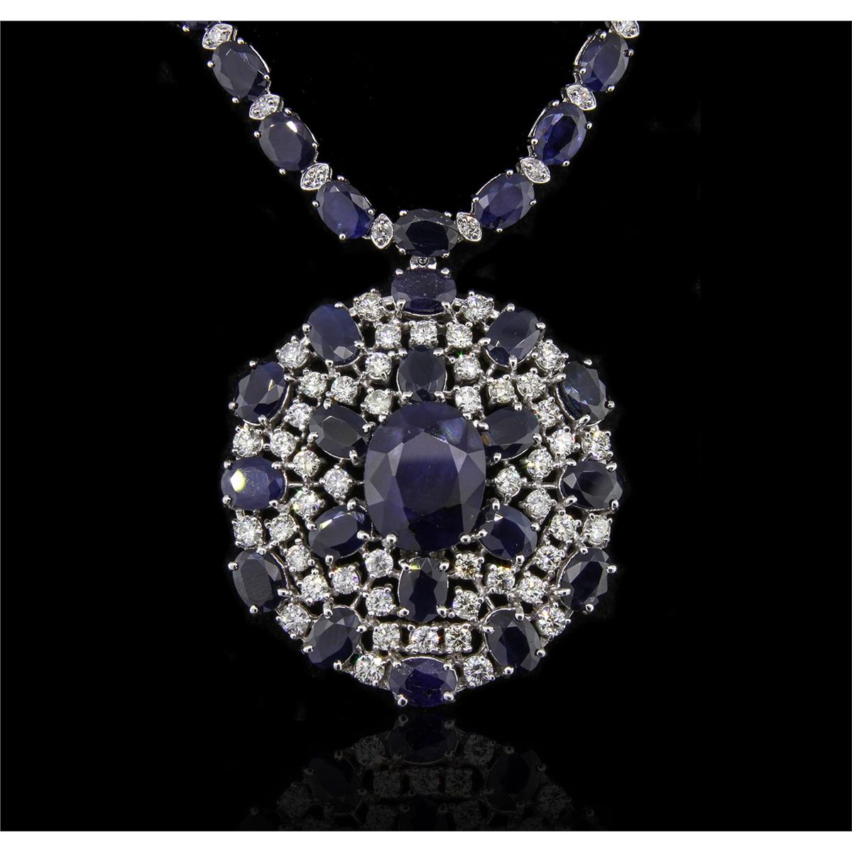 One electronically tested 14KT white gold ladies cast & assembled sapphire and diamond necklace with a bright polish finish. Condition is new, good workmanship. The sixteen inch length necklace features a pendant consisting of a sapphire set within a sapphire and diamond lattice supported by a sapphire and diamond ribbon, terminating in a concealed clasp with safety. Identified with markings of "K14". Containing: One prong set oval mixed cut natural blue sapphire, measuring 15.80 x 12.80 x 7.90mm, 8% bulge factor, approximate weight of 13.96ct, clarity is severely included, type II, dark, very slightly grayish, violetish blue color, (GIA vB 7/3), cut is good. Transmitting light very diffusely, opaque. Naturally occurring internal & external characteristics are present. Indications of multiple laboratory enhancements, including high temperature heat treatment. Colored Stone Grading Report attached. Graded in the setting. Sixty-one prong set oval mixed cut natural blue sapphires, measuring 7.00 x 5.00 x 3.30mm, 10% bulge factor, approximate. Total Weight of 64.05ct, clarity is heavily included, type II, dark, very slightly grayish, violetish blue color, (GIA vB 7/3), cut is good. Transmitting light somewhat diffusely, transparent to translucent. Naturally occurring internal & external characteristics are present. Indications of multiple laboratory enhancements, including high temperature diffusion treatment. Measurements & the color grade are an average for the group. Graded in the setting. Forty-Eight prong set round brilliant cut diamonds, measuring 3.20 - 2.80 x 1.80mm (depth est.) approximate. Total Weight of 48 Stones = 4.85ct. Graded in the setting. Clarity: SI-2 to I-2. Color: H - J Forty-Three bead set round brilliant cut diamonds, measuring 2.10 - 2.00 x 1.23mm (depth est.) approximate. Total Weight of 43 Stones = 1.45ct. Graded in the setting. Clarity: SI-2 to I-2. Color: G - I. Total Weight of Colored Stones 78.01ct. Total Weight of Diamonds 6.30ct. Total Weight of Necklace 49.19 grams. AIG Appraised at $36,575.00.