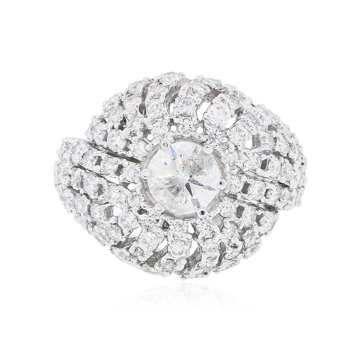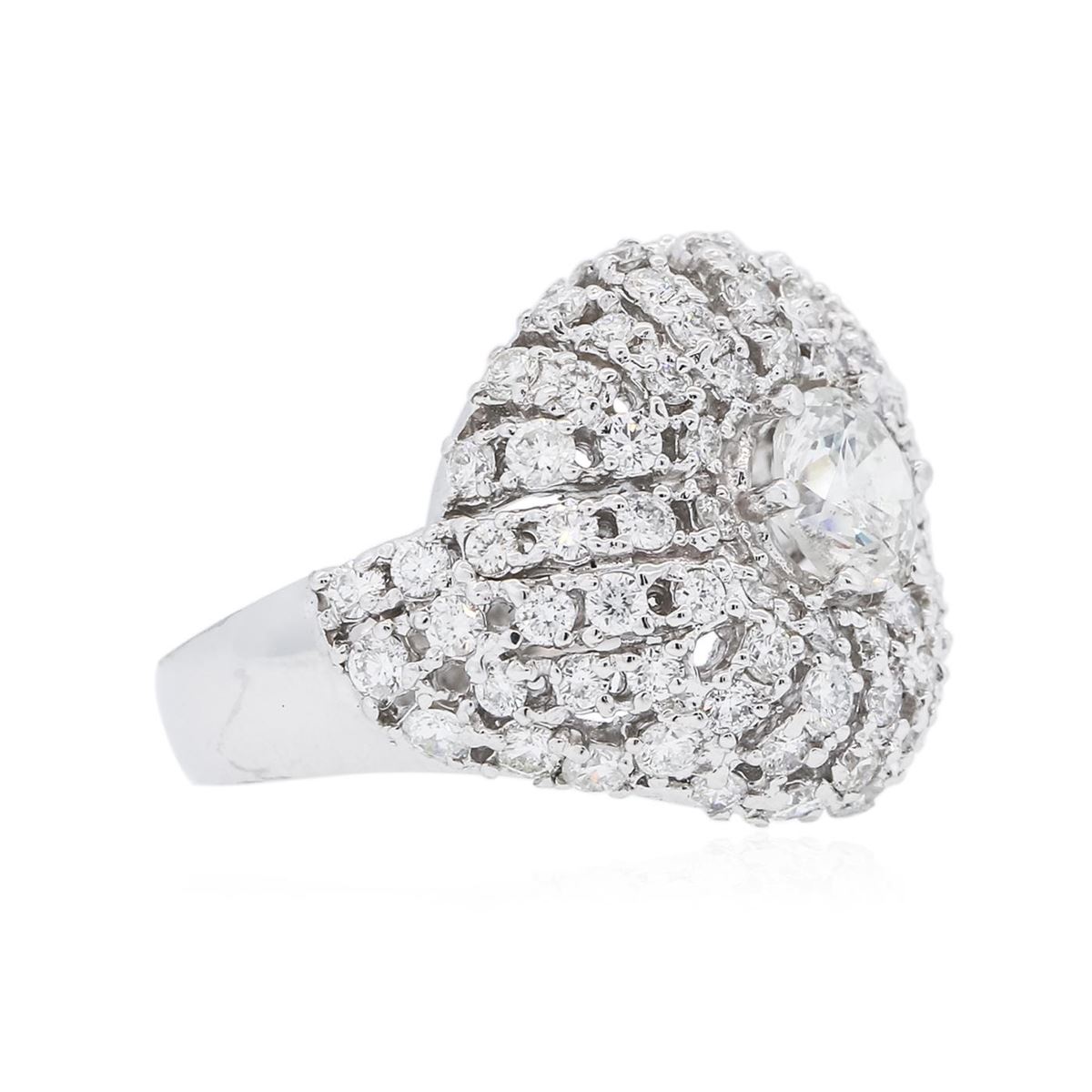 One electronically tested 14KT white gold ladies combination cast & assembled engagement ring with a flat shank with a bright polish finish. Identified with markings of "K14". Condition is new. Containing: One prong set round brilliant cut diamond, measuring 6.20 - 6.20 x 4.00mm (depth est.) approximate weight of 0.94ct. Clarity: I-2. Color: I, Cut is Good. Eighty-Six prong set round brilliant cut diamonds, measuring 1.50 - 1.50 x 0.90mm (depth est.) approximate total weight of 86 Stones = 1.06ct. Clarity: SI-1 to I-1. Color: I - J, Cut is Good. All diamonds are graded in the mounting, unless otherwise stated. Total Weight of Diamonds 2.00ct. Total Weight of Ring 8.70 grams. GGL Appraised at $11,735.00.