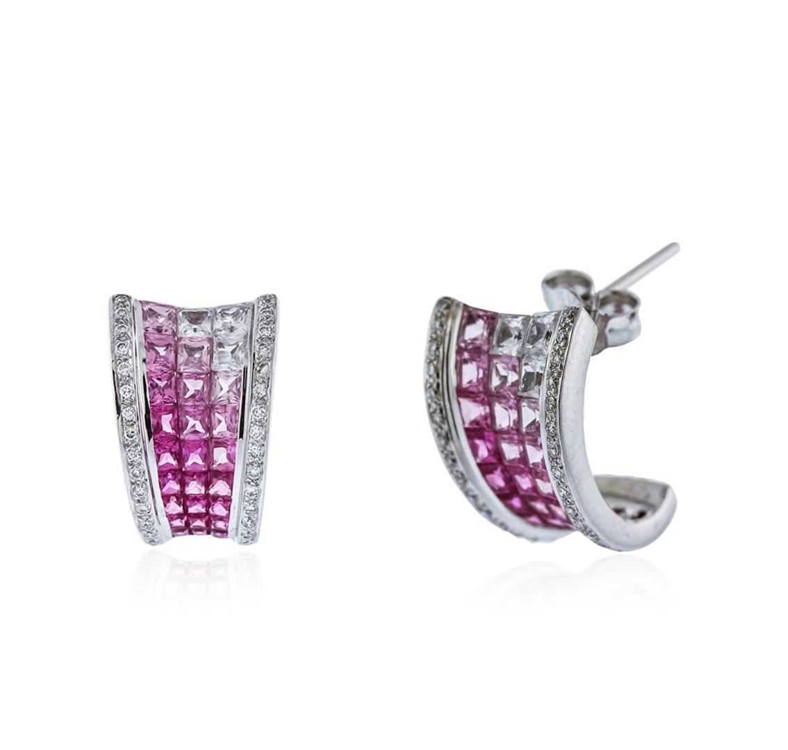 One pair of earrings featuring: 14KT white gold weighing 6.40 grams containing pink sapphires with a total weight of 2.00ct and pave set round diamonds with a total weight of 0.16ct.