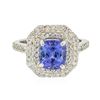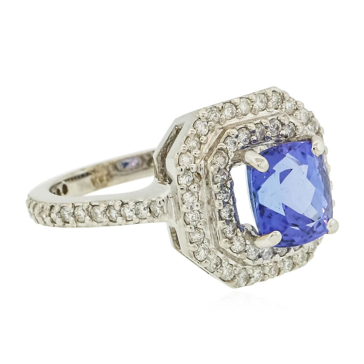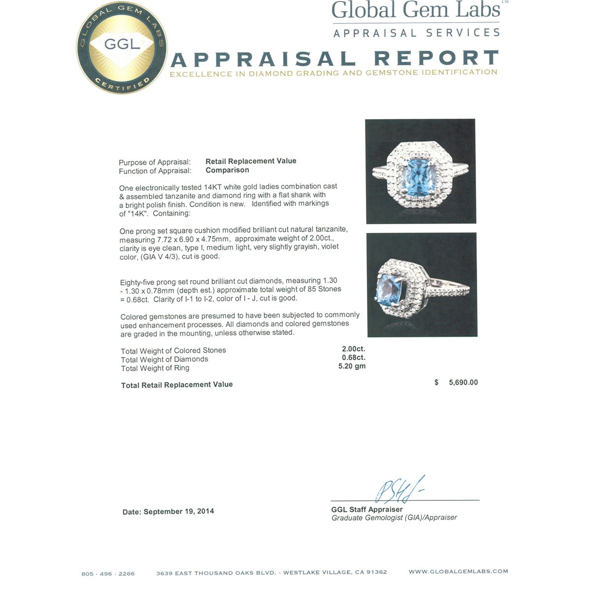 One electronically tested 14KT white gold ladies combination cast & assembled tanzanite and diamond ring with a flat shank with a bright polish finish. Identified with markings of "14K". Condition is new. Containing: One prong set square cushion modified brilliant cut natural tanzanite, measuring 7.72 x 6.90 x 4.75mm, approximate weight of 2.00ct., clarity is eye clean, type I, medium light, very slightly grayish, violet color, (GIA V 4/3), cut is good. Eighty-Five prong set round brilliant cut diamonds, measuring 1.30 - 1.30 x 0.78mm (depth est.) approximate total weight of 85 Stones = 0.68ct. Clarity: I-1 to I-2. Color: I - J, Cut is Good. Colored gemstones are presumed to have been subjected to commonly used enhancement processes. All diamonds and colored gemstones are graded in the mounting, unless otherwise stated. Total Weight of Colored Stones 2.00ct. Total Weight of Diamonds 0.68ct. Total Weight of Ring 5.20 grams. GGL Appraised at $5,690.00.