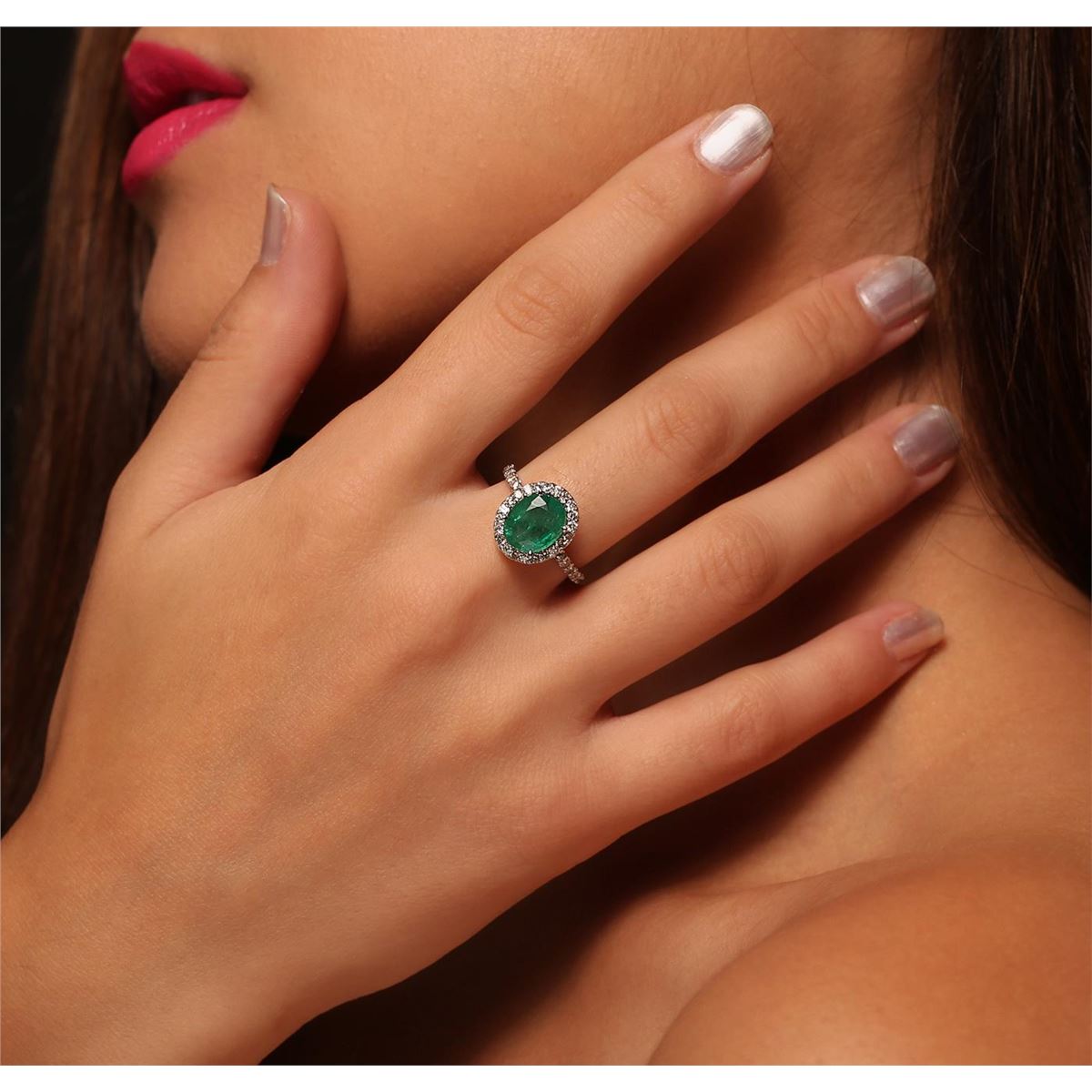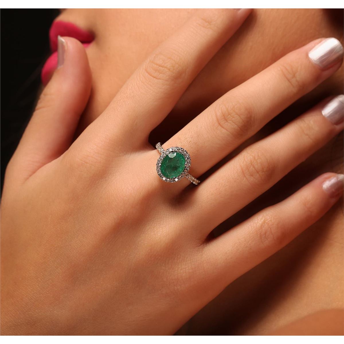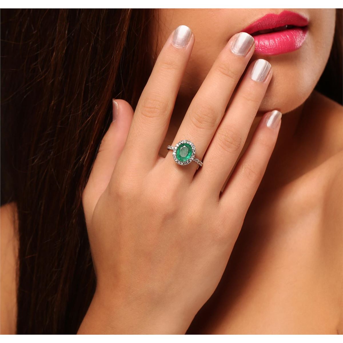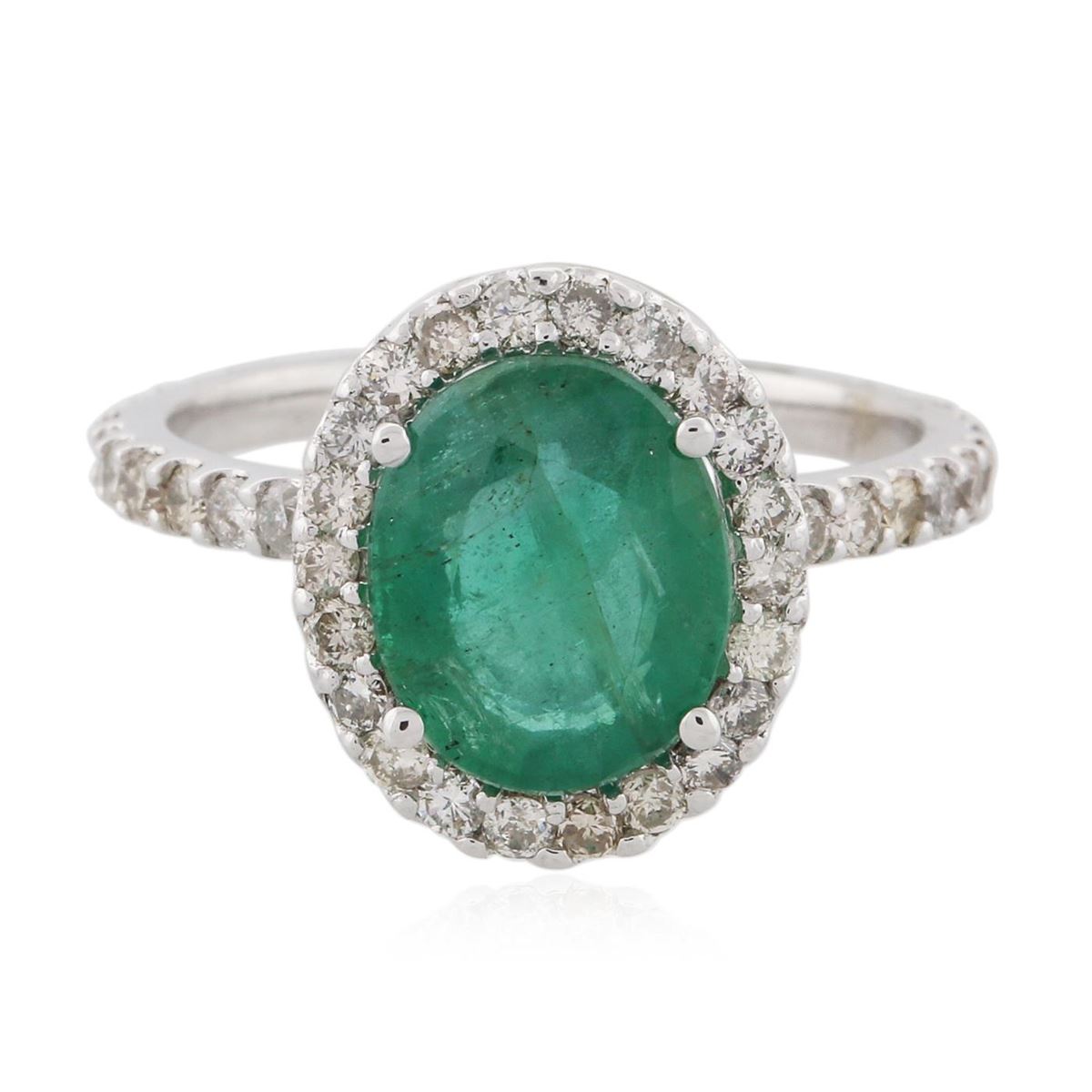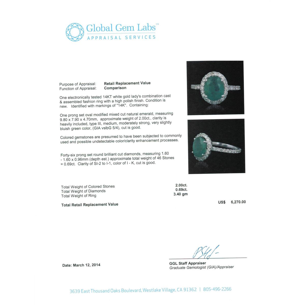 One electronically tested 14KT white gold Ladies combination cast & assembled fashion ring with a high polish finish. Condition is new. Identified with markings of "14K". Containing: One prong set oval modified mixed cut natural emerald, measuring 9.80 x 7.90 x 4.70mm, approximate weight of 2.00ct., clarity is heavily included, type III, medium, moderately strong, very slightly bluish green color, (GIA vslbG 5/4), cut is good. Colored gemstones are presumed to have been subjected to commonly used and possible undetectable color/clarity enhancement processes. Forty-Six prong set round brilliant cut diamonds, measuring 1.60 - 1.60 x 0.96mm (depth est.) approximate total weight of 46 Stones = 0.69ct. Clarity of SI-2 to I-1, Color of I - K, Cut is Good. Total Weight of Colored Stones 2.00ct. Total Weight of Diamonds 0.69ct. Total Weight of Ring 3.40 grams. GGL Appraised at $6,270.00.