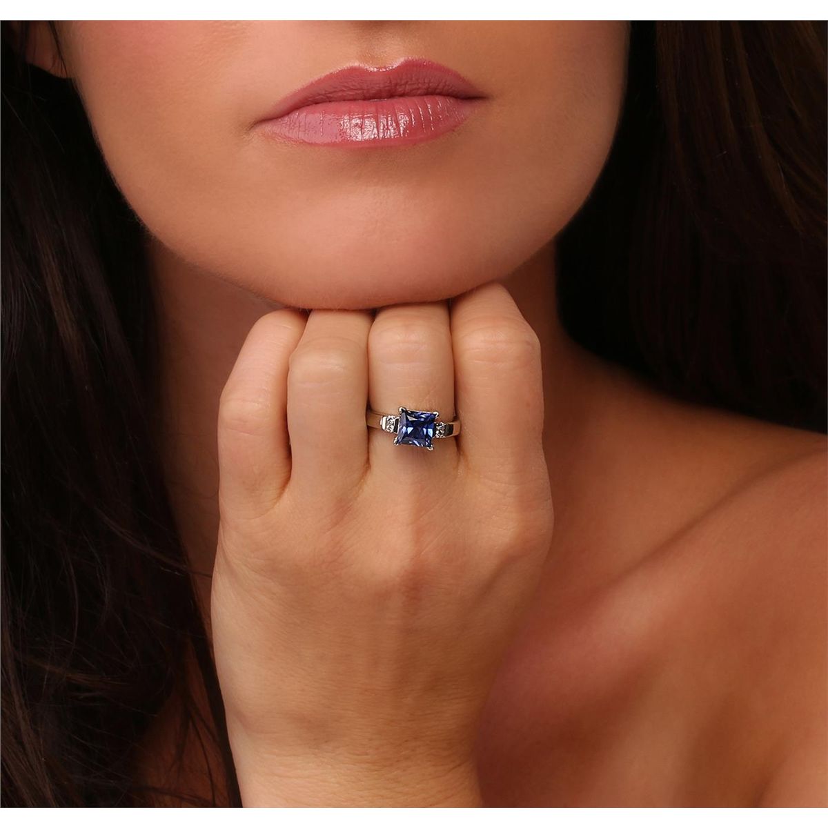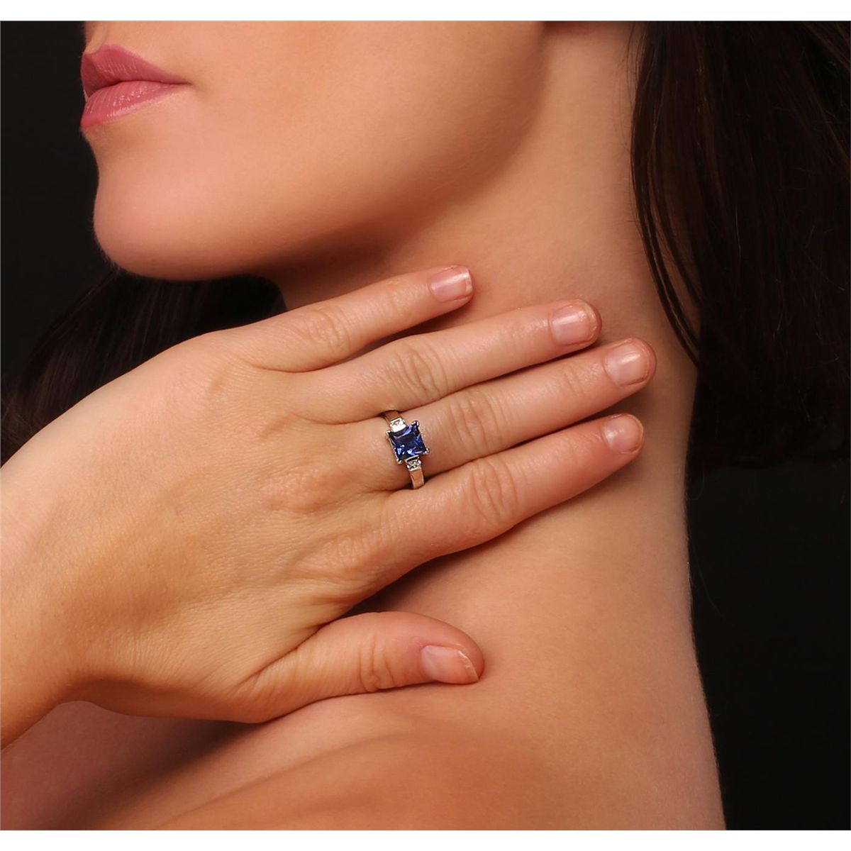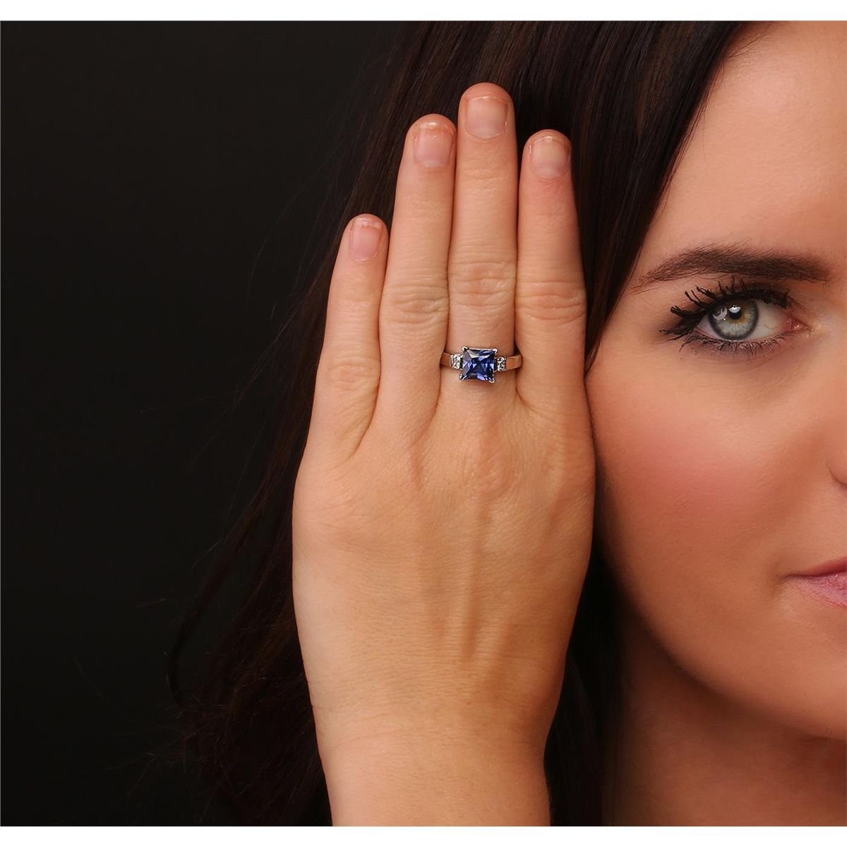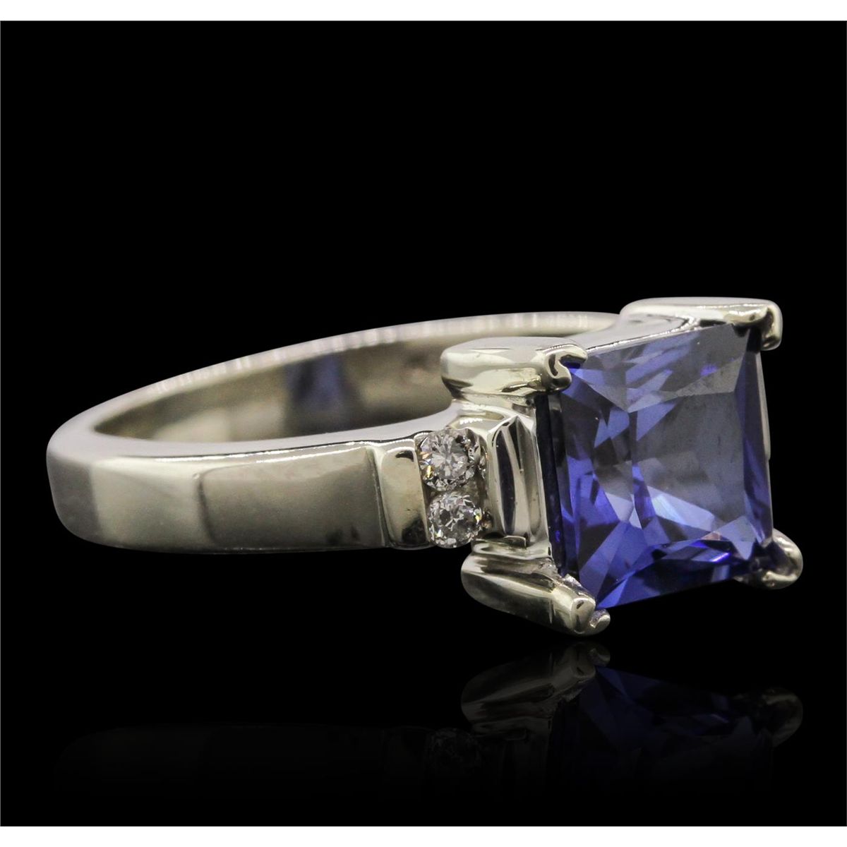 One electronically tested 14KT white gold Ladies combination cast & assembled ring with a bright polish finish. Condition is very good. Identified with markings of "14K". Containing: One prong set princess modified brilliant cut natural tanzanite, measuring 7.15 x 7.15 x 4.65mm, approximate. Total Weight of 2.00ct., clarity is eye clean, type I, medium, moderately strong, violetish blue color, (GIA vB 5/4), cut is very good. Colored gemstones are presumed to have been subjected to commonly used color/clarity enhancement processes. Four prong set round brilliant cut diamonds, measuring 1.50 - 1.50 x 0.90mm (depth est.) approximate. Total Weight of 4 Stones = 0.05ct. Clarity: I-1 to I-2. Color: I - J, Cut is Very Good. Total Weight of Colored Stones 2.00ct. Total Weight of Diamonds 0.05ct. Total Weight of Ring 4.40 grams. GGL Appraised at $4,285.00.