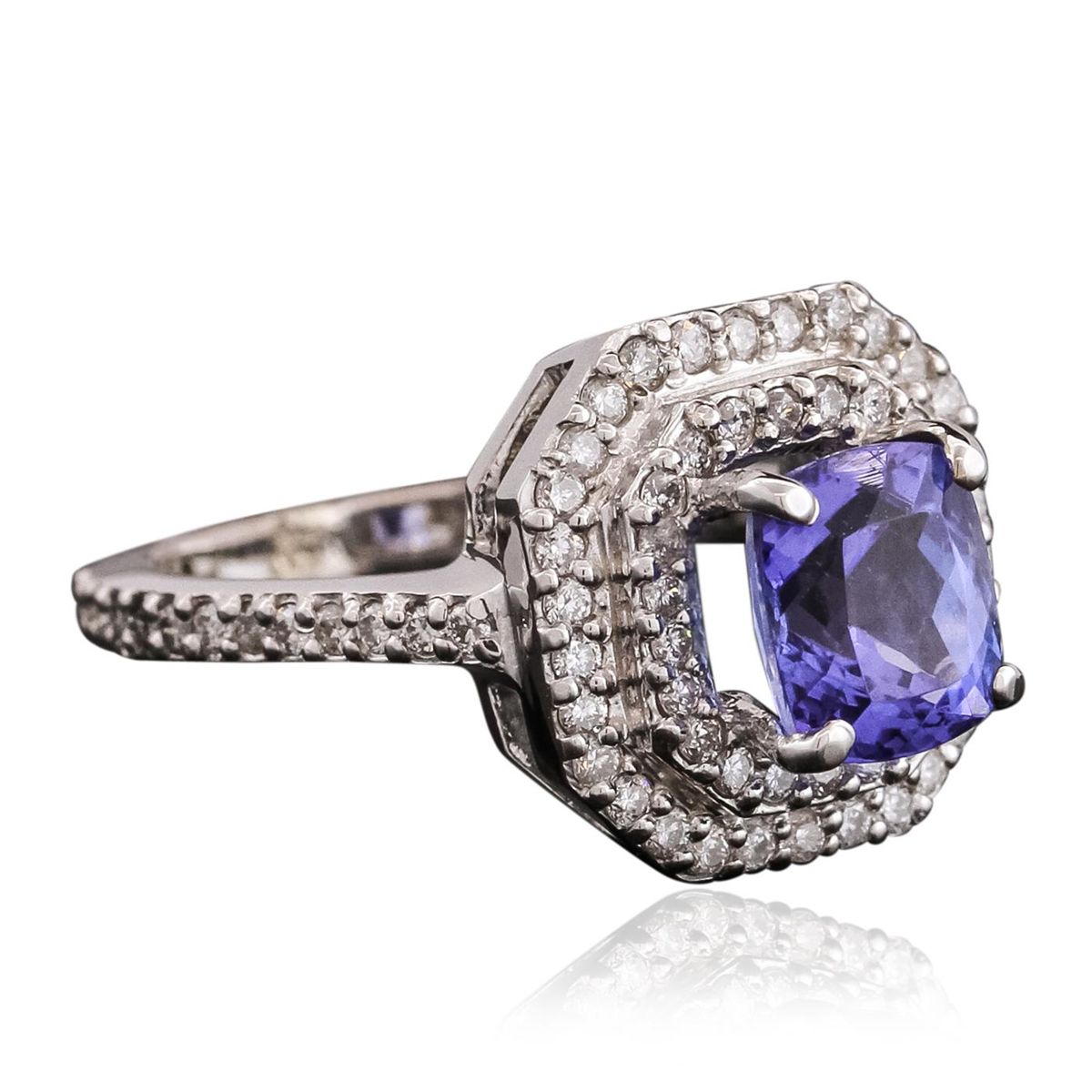 One electronically tested 14KT white gold ladies combination cast & assembled tanzanite and diamond ring with a flat shank with a bright polish finish. Identified with markings of "14K". Condition is new. Containing: One prong set square cushion modified brilliant cut natural tanzanite, measuring 7.72 x 6.90 x 4.75mm, approximate weight of 2.00ct., clarity is eye clean, type I, medium light, very slightly grayish, violet color, (GIA V 4/3), cut is good. Eighty-Five prong set round brilliant cut diamonds, measuring 1.30 - 1.30 x 0.78mm (depth est.) approximate total weight of 85 Stones = 0.68ct. Clarity: I-1 to I-2. Color: I - J, Cut is Good. Colored gemstones are presumed to have been subjected to commonly used enhancement processes. All diamonds and colored gemstones are graded in the mounting, unless otherwise stated. Total Weight of Colored Stones 2.00ct. Total Weight of Diamonds 0.68ct. Total Weight of Ring 5.20 grams. GGL Appraised at $5,690.00.
