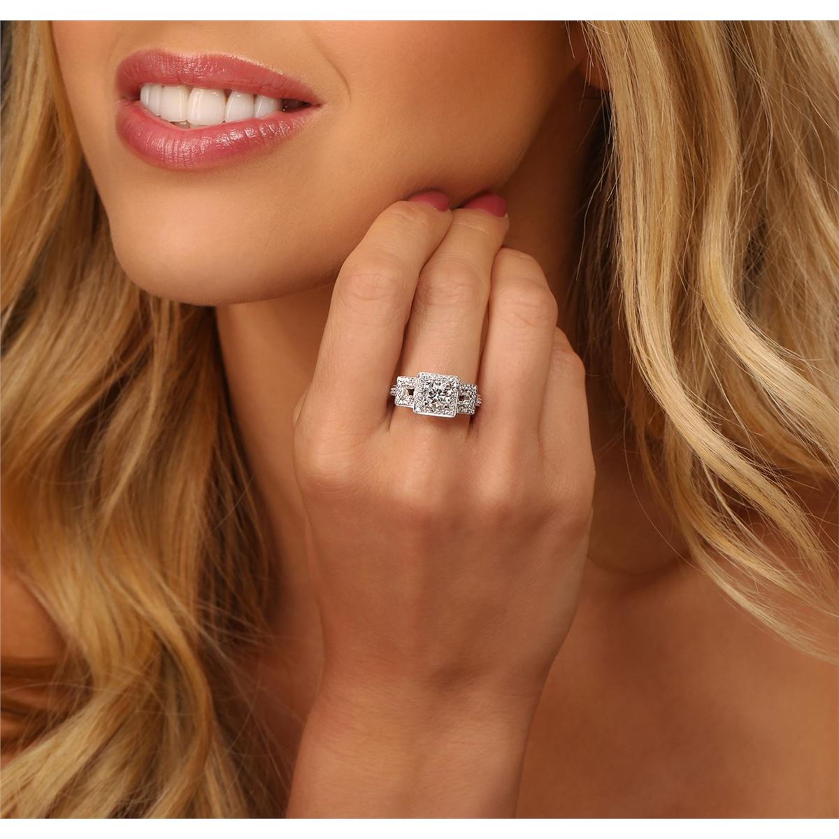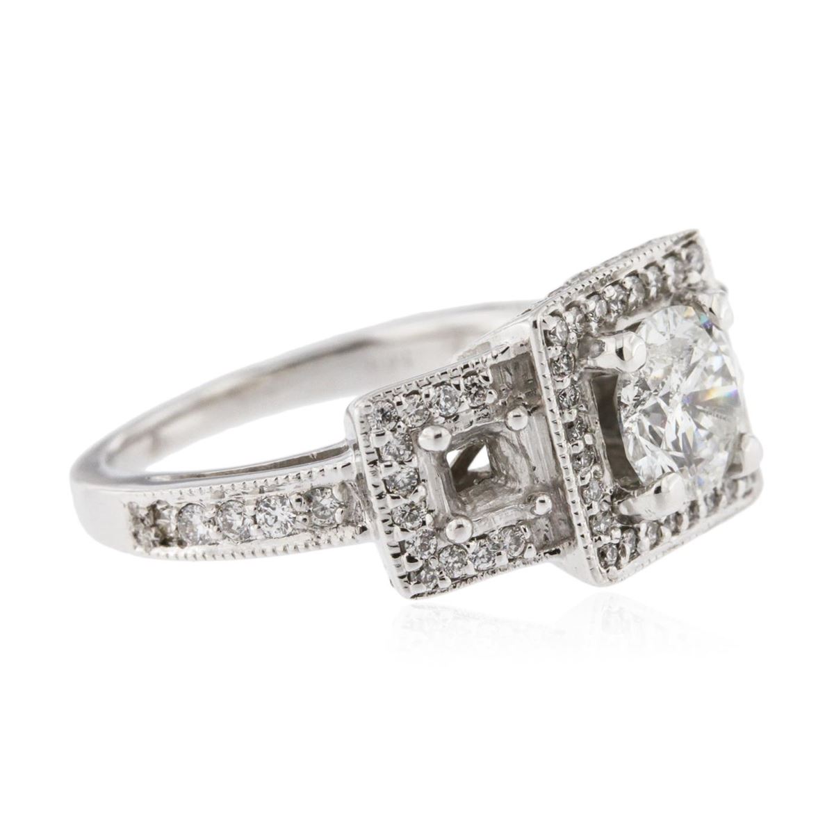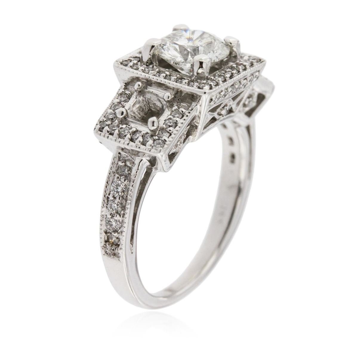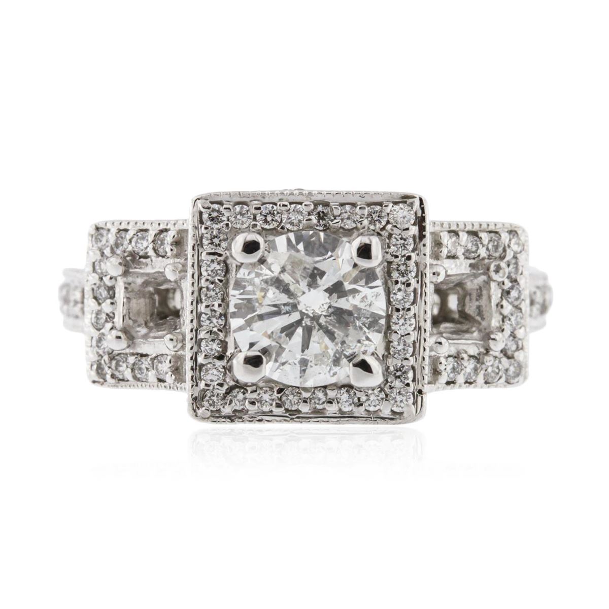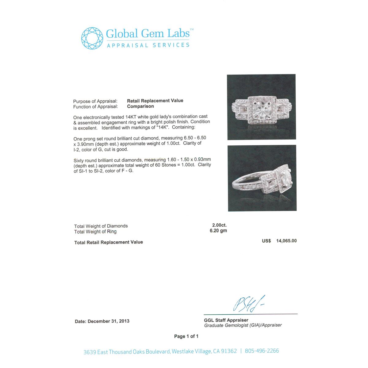 One electronically tested 14KT white gold Ladies combination cast & assembled engagement ring with a bright polish finish. Identified with markings of "14K". Condition is excellent. Containing: One prong set round brilliant cut diamond, measuring 6.50 - 6.50 x 3.90mm (depth est.) approximate weight of 1.00ct. Clarity of I-2, Color of G, Cut is Good. Sixty round brilliant cut diamonds, measuring 1.60 - 1.50 x 0.93mm (depth est.) approximate total weight of 60 Stones = 1.00ct. Clarity of SI-1 to SI-2, Color of F - G. Total Weight of Diamonds 2.00ct. Total Weight of Ring 6.20gm. GGL Appraised at $14,065.00.