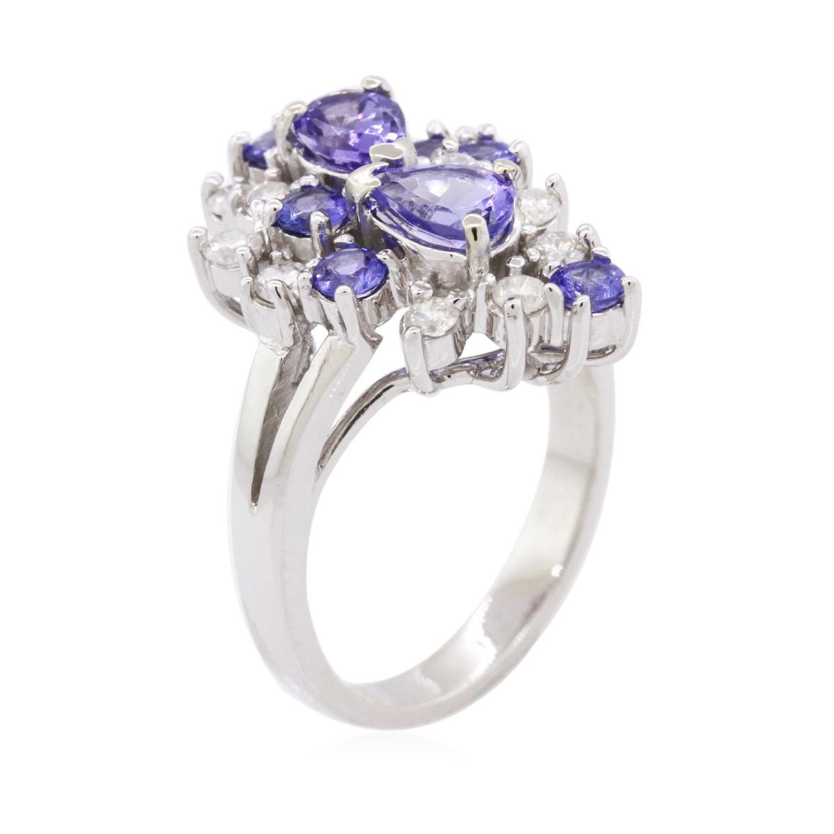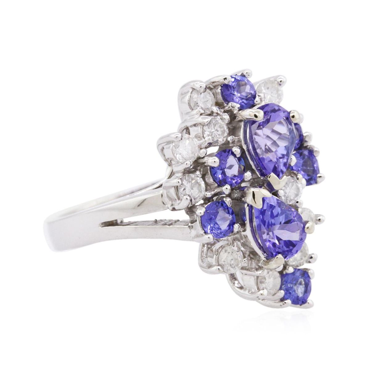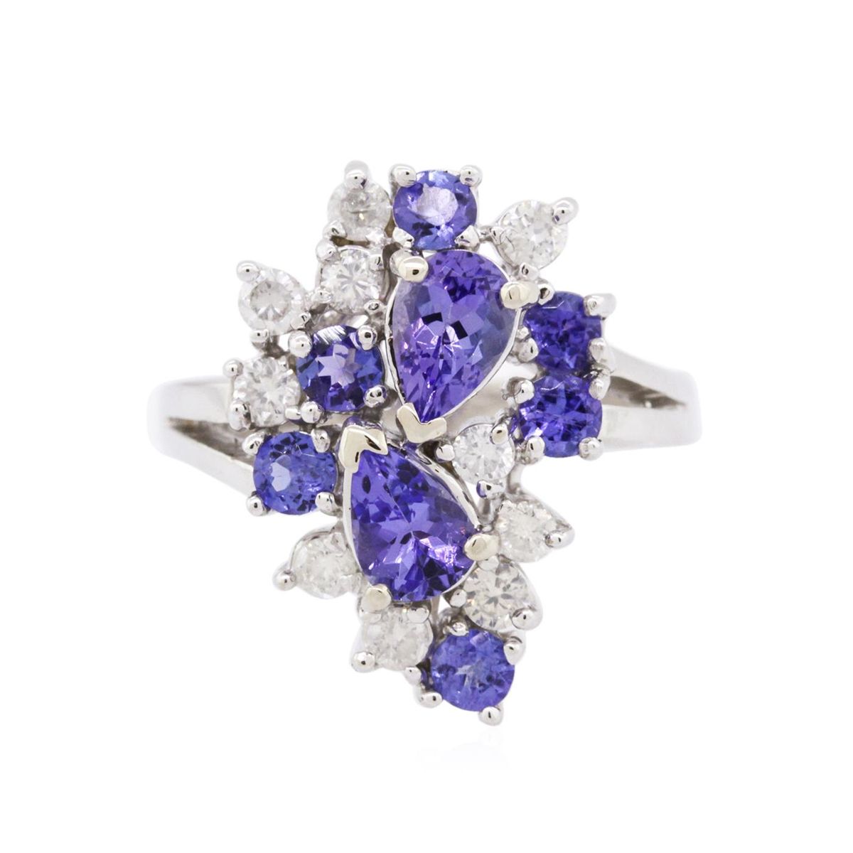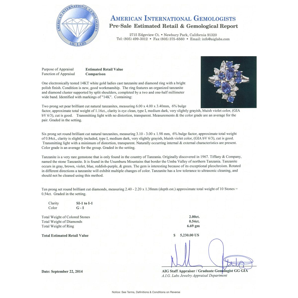 One electronically tested 14KT white gold ladies cast tanzanite and diamond ring with a bright polish finish. The ring features an organized tanzanite and diamond cluster supported by split shoulders, completed by a two and one-half millimeter wide band. Identified with markings of "14K". Condition is new, good workmanship. Containing: Two prong set pear brilliant cut natural tanzanites, measuring 6.00 x 4.00 x 3.40mm, 6% bulge factor, approximate total weight of 1.16ct., clarity is eye clean, type I, medium dark, very slightly grayish, bluish violet color, (GIA bV 6/3), cut is good. Transmitting light with no distortion, transparent. Measurements & the color grade are an average for the pair. Graded in the setting. Six prong set round brilliant cut natural tanzanites, measuring 3.10 - 3.00 x 1.98 mm, 6% bulge factor, approximate total weight of 0.84ct., clarity is slightly included, type I, medium dark, very slightly grayish, bluish violet color, (GIA bV 6/3), cut is good. Transmitting light with a minimum of distortion, transparent. Naturally occurring internal & external characteristics are present. Color grade is an average for the group. Graded in the setting. Tanzanite is a very rare gemstone that is only found in the country of Tanzania. Originally discovered in 1967. Tiffany & Company, named the stone Tanzanite. It is found in the Usumburu Mountains that border the Umba Valley of northern Tanzania. Tanzanite occurs in gray, brown, violet, blue, reddish-purple, & green. The gem is interesting because of its exceptional pleochroism. Rotated in different directions a tanzanite will exhibit multiple changes of color. Tanzanite has a low tolerance to ultrasonic cleaning, and should not be cleaned using this method. Ten prong set round brilliant cut diamonds, measuring 2.40 - 2.20 x 1.38mm (depth est.) approximate total weight of 10 Stones = 0.54ct. Graded in the setting. Clarity: SI-1 to I-1. Color: G - I. Total Weight of Colored Stones 2.00ct. Total Weight of Diamonds 0.54ct. Total Weight of Ring 6.69 grams. AIG Appraised at $5,230.00.