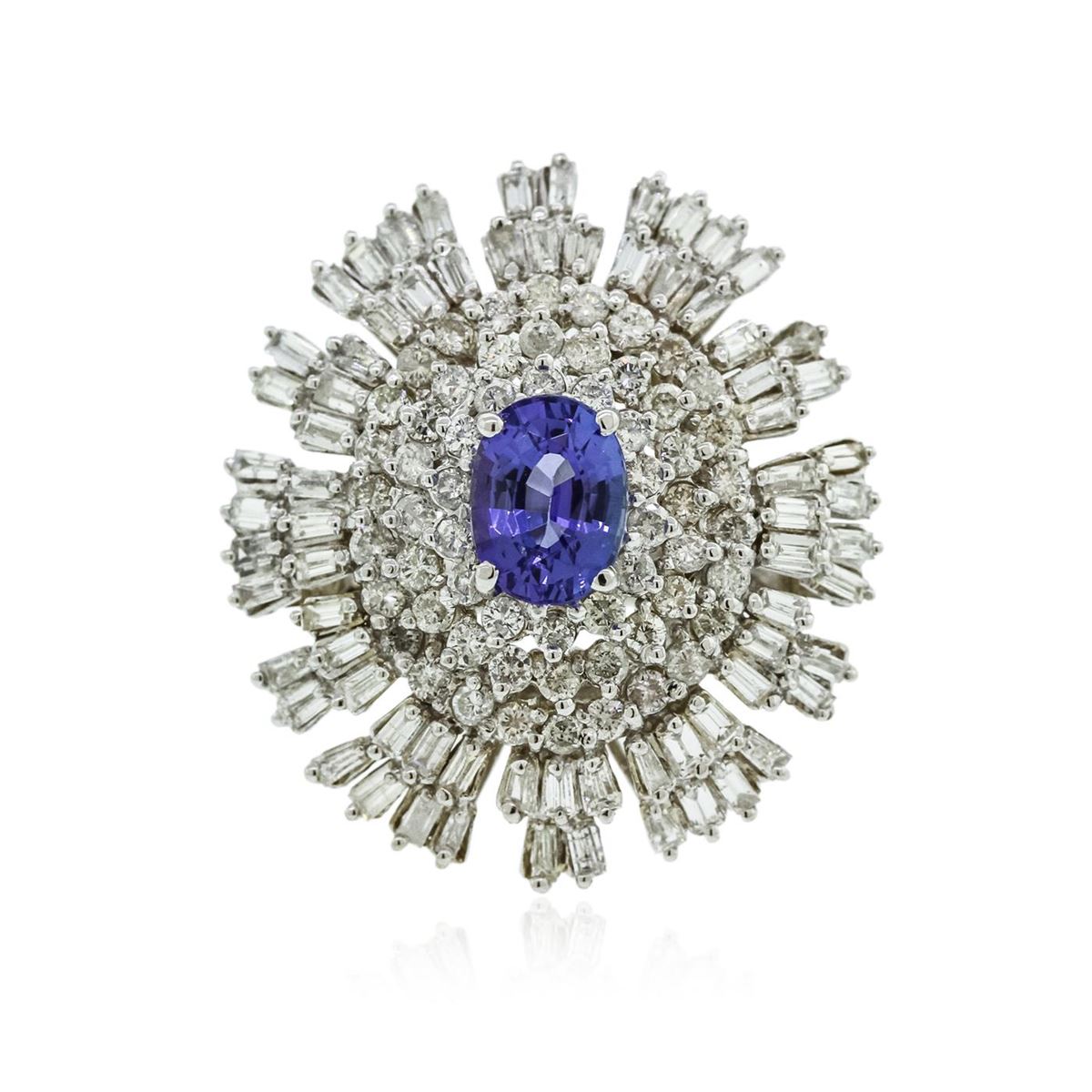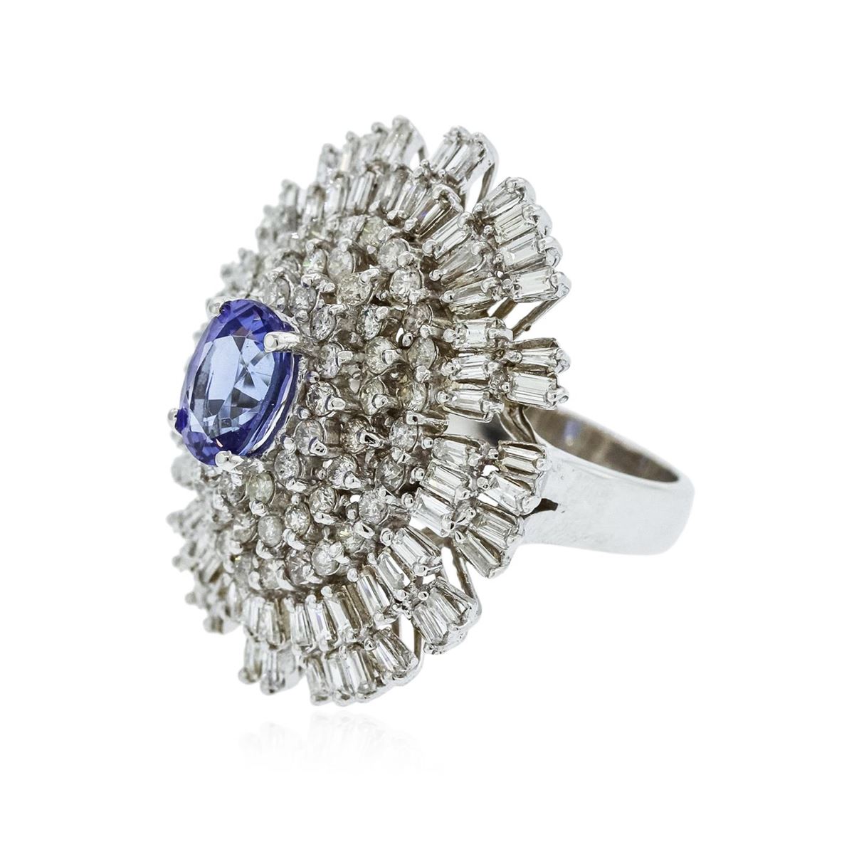 One electronically tested 14KT white gold Ladies combination cast & assembled ballerina ring with a bright polish finish. Identified with markings of "14K". Condition is excellent. Containing: One prong set oval modified brilliant cut natural tanzanite, measuring 8.70 x 6.50 x 5.20mm, approximate weight of 2.01ct., clarity is eye clean, type I, medium, moderately strong, bluish violet color, (GIA bV 5/4), cut is good. Colored gemstones are presumed to have been subjected to commonly used and possible undetectable color/clarity enhancement processes. Sixty-One prong set round brilliant cut diamonds, measuring 1.90 - 1.90 x 1.14mm (depth est.) approximate total weight of 61 Stones = 1.53ct. Clarity of I-1 to I-2, Color of H - J. Seventy-Two prong set baguette cut diamonds, measuring 2.50 x 1.50 x 1.28mm (depth est.) approximate total weight of 72 Stones = 3.16ct. Clarity of SI-1 to I-1, Color of H - J. Total Weight of Colored Stones 2.01ct. Total Weight of Diamonds 4.69ct. Total Weight of Ring 13.00gm. GGL Appraised at $17,785.00.