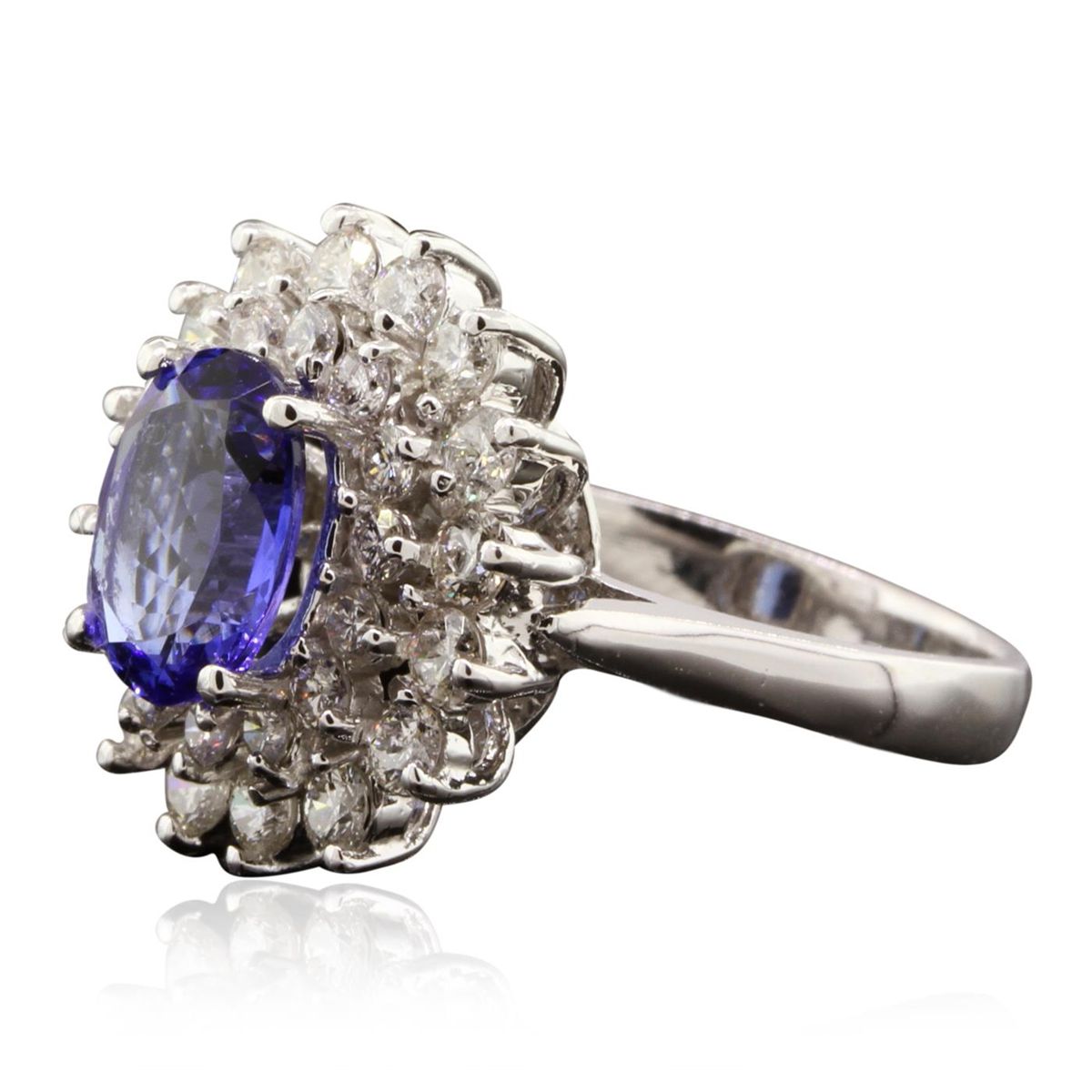 One electronically tested 14KT white gold Ladies combination cast & assembled ring with a bright polish finish. Identified with markings of "14K". Condition is excellent. Containing: One prong set oval modified brilliant cut natural tanzanite, measuring 9.10 x 7.10 x 4.62mm, approximate weight of 2.01ct., clarity is eye clean, type I, medium, moderately strong, violetish blue color, (GIA vB 5/4), cut is good. Colored gemstones are presumed to have been subjected to commonly used and possible undetectable color/clarity enhancement processes. Thirty prong set round brilliant cut diamonds, measuring 2.30 - 1.80 x 1.23mm (depth est.) approximate total weight of 30 Stones = 1.26ct. Clarity of SI-2 to I-1, Color of I - K, Cut is Good. Total Weight of Colored Stones 2.01ct. Total Weight of Diamonds 1.26ct. Total Weight of Ring 5.60gm. GGL Appraised at $7,840.00.