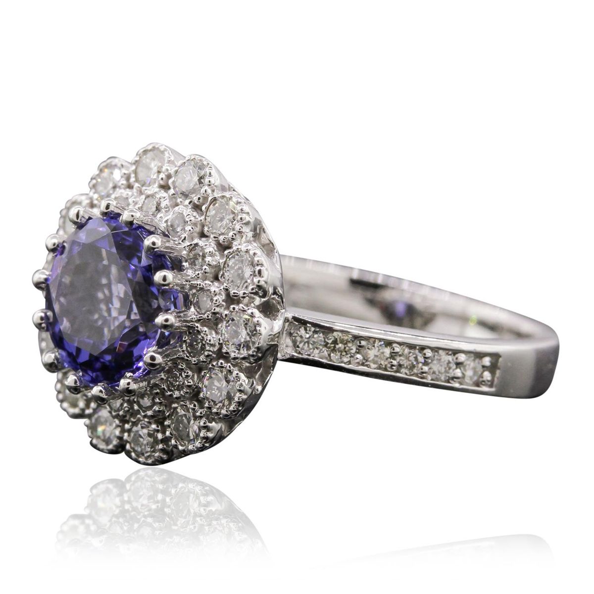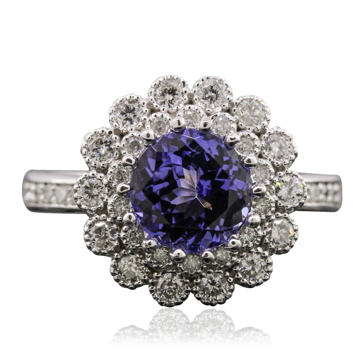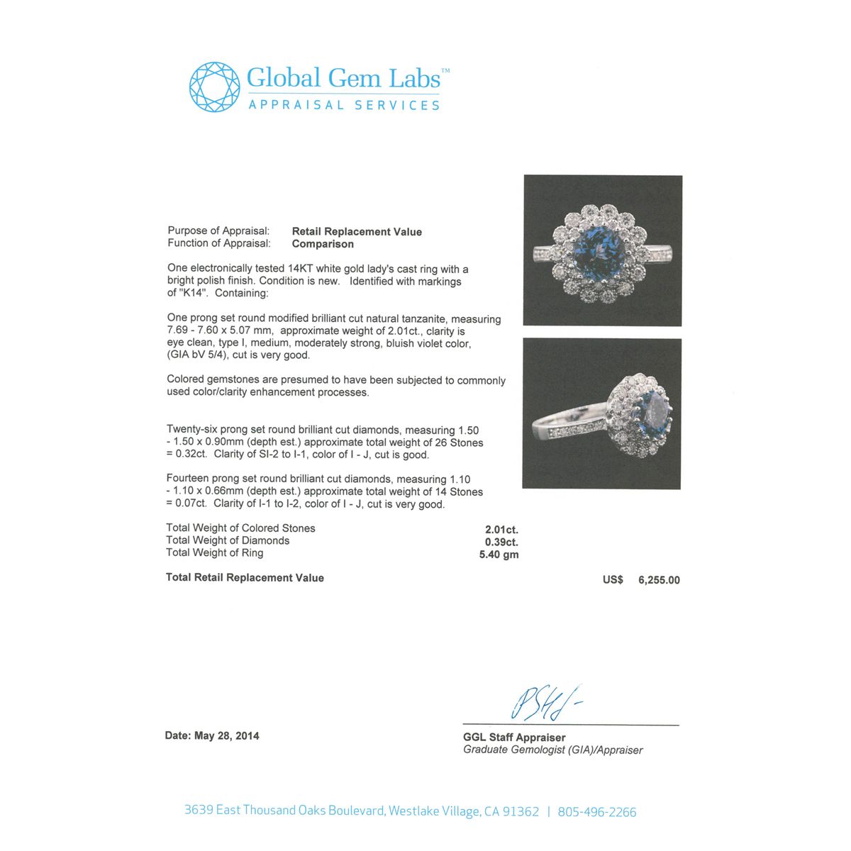 One electronically tested 14KT white gold Ladies cast ring with a bright polish finish. Condition is new. Identified with markings of "K14". Containing: One prong set round modified brilliant cut natural tanzanite, measuring 7.69 - 7.60 x 5.07 mm, approximate weight of 2.01ct., clarity is eye clean, type I, medium, moderately strong, bluish violet color, (GIA bV 5/4), cut is very good. Colored gemstones are presumed to have been subjected to commonly used color/clarity enhancement processes. Twenty-Six prong set round brilliant cut diamonds, measuring 1.50 - 1.50 x 0.90mm (depth est.) approximate. Total Weight of 26 Stones = 0.32ct. Clarity: SI-2 to I-1. Color: I - J, Cut is Good. Fourteen prong set round brilliant cut diamonds, measuring 1.10 - 1.10 x 0.66mm (depth est.) approximate. Total Weight of 14 Stones = 0.07ct. Clarity: I-1 to I-2. Color: I - J, Cut is Very Good. Total Weight of Colored Stones 2.01ct. Total Weight of Diamonds 0.39ct. Total Weight of Ring 5.40 Grams. GGL Appraised at $6,255.00.