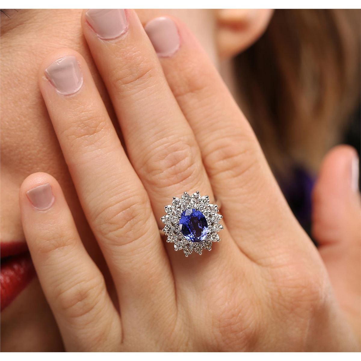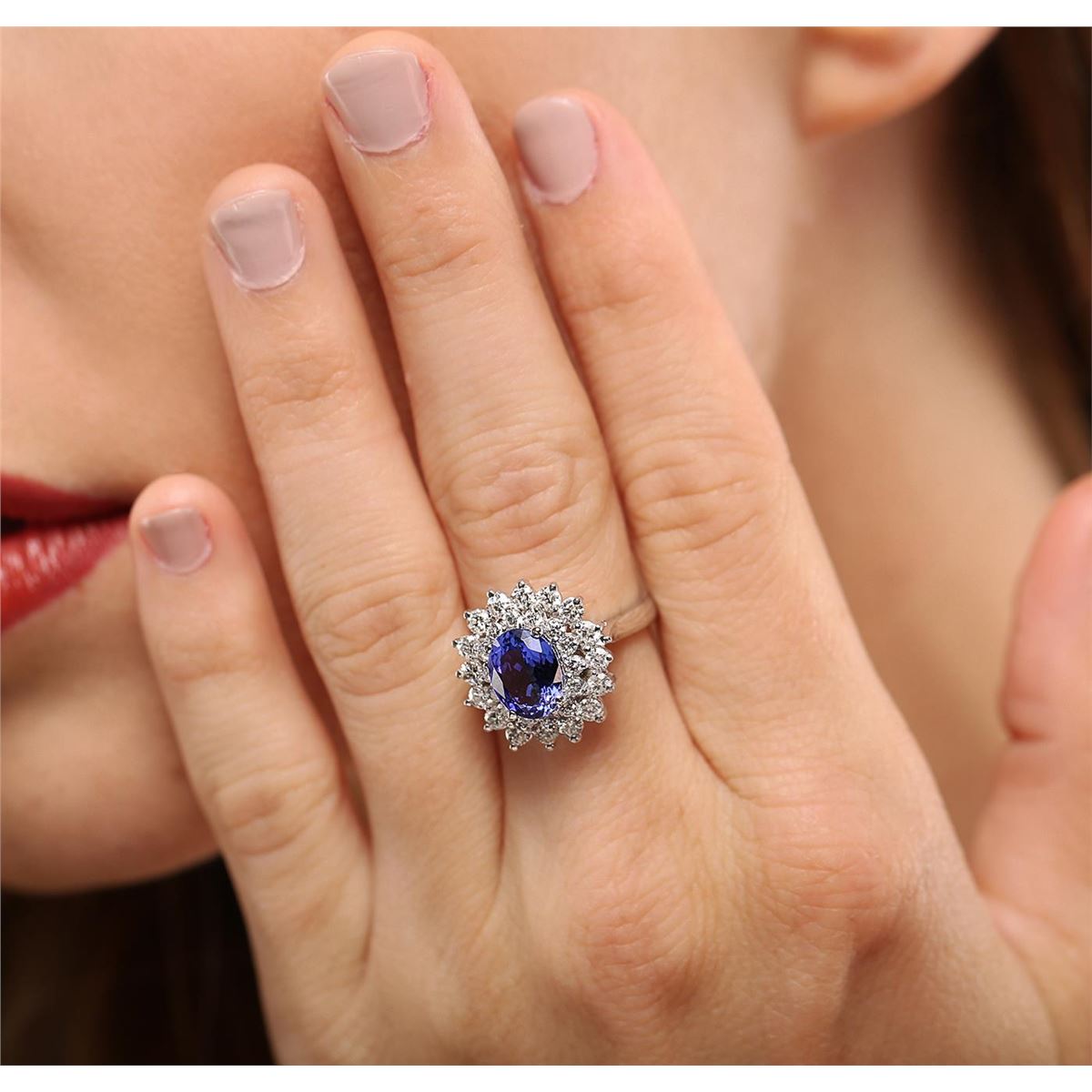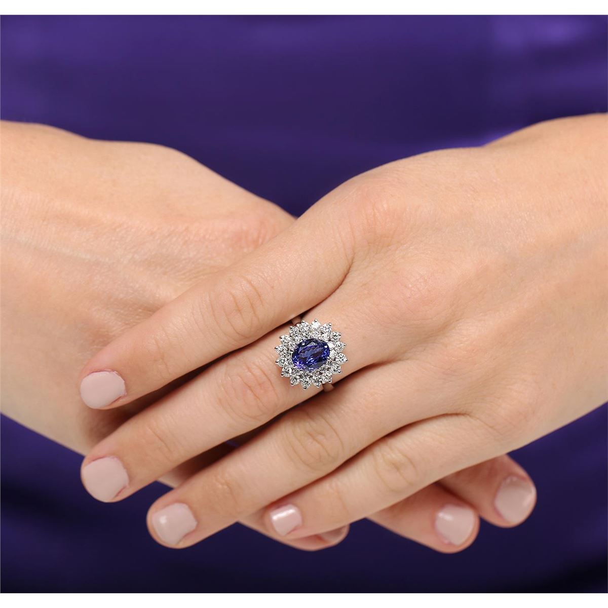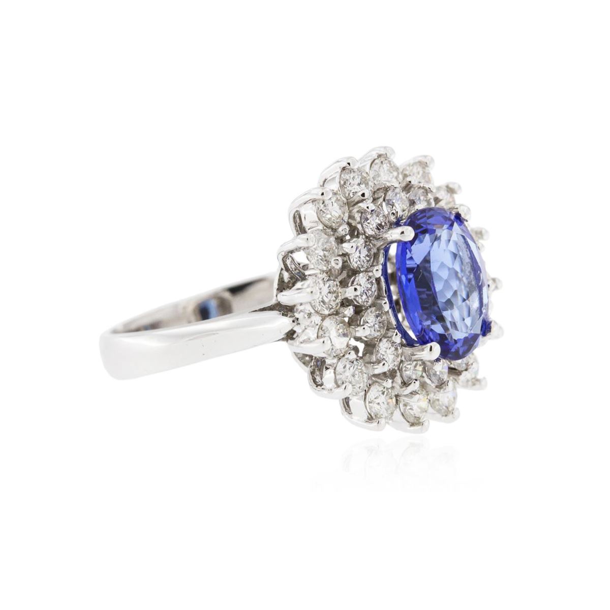 One electronically tested 14KT white gold Ladies combination cast & assembled ring with a bright polish finish. Identified with markings of "14K". Condition is excellent. Containing: One prong set oval modified brilliant cut natural tanzanite, measuring 9.10 x 7.10 x 4.62mm, approximate weight of 2.01ct., clarity is eye clean, type I, medium, moderately strong, violetish blue color, (GIA vB 5/4), cut is good. Colored gemstones are presumed to have been subjected to commonly used and possible undetectable color/clarity enhancement processes. Thirty prong set round brilliant cut diamonds, measuring 2.30 - 1.80 x 1.23mm (depth est.) approximate total weight of 30 Stones = 1.26ct. Clarity of SI-2 to I-1, Color of I - K, Cut is Good. Total Weight of Colored Stones 2.01ct. Total Weight of Diamonds 1.26ct. Total Weight of Ring 5.60gm. GGL Appraised at $7,840.00.
