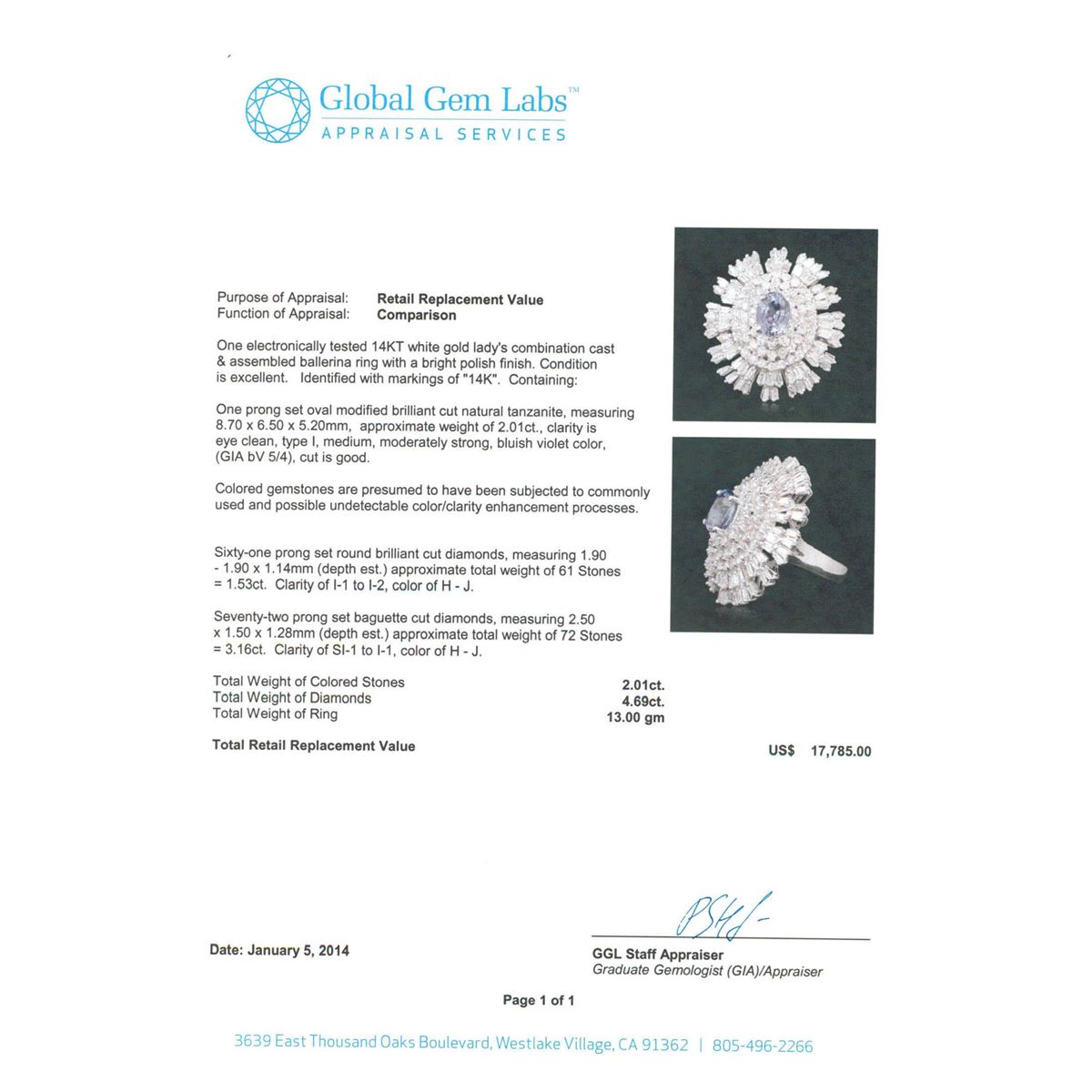 One electronically tested 14KT white gold Ladies combination cast & assembled ballerina ring with a bright polish finish. Identified with markings of "14K". Condition is excellent. Containing: One prong set oval modified brilliant cut natural tanzanite, measuring 8.70 x 6.50 x 5.20mm, approximate weight of 2.01ct., clarity is eye clean, type I, medium, moderately strong, bluish violet color, (GIA bV 5/4), cut is good. Colored gemstones are presumed to have been subjected to commonly used and possible undetectable color/clarity enhancement processes. Sixty-One prong set round brilliant cut diamonds, measuring 1.90 - 1.90 x 1.14mm (depth est.) approximate total weight of 61 Stones = 1.53ct. Clarity of I-1 to I-2, Color of H - J. Seventy-Two prong set baguette cut diamonds, measuring 2.50 x 1.50 x 1.28mm (depth est.) approximate total weight of 72 Stones = 3.16ct. Clarity of SI-1 to I-1, Color of H - J. Total Weight of Colored Stones 2.01ct. Total Weight of Diamonds 4.69ct. Total Weight of Ring 13.00gm. GGL Appraised at $17,785.00.
