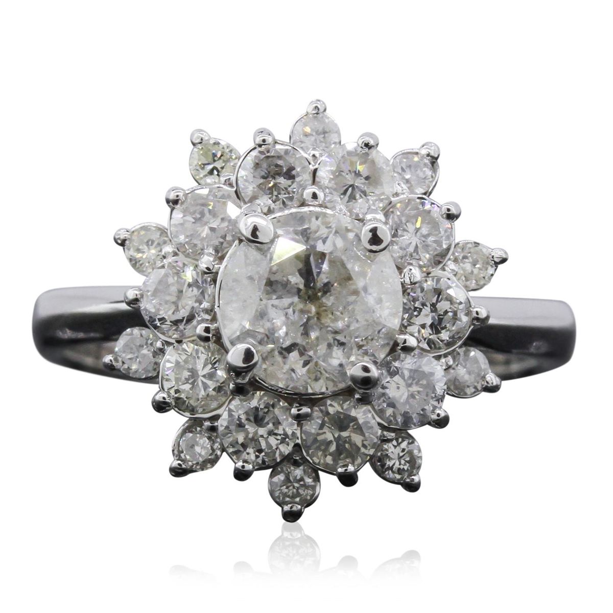 One electronically tested 14KT white gold ladies cast diamond ring with a bright polish finish. Condition is new, good workmanship. The featured diamond is set within a stylized floret bezel supported by tapering shoulders, completed by a three millimeter wide band. Identified with markings of "14K". Containing: One prong set round brilliant cut diamond, measuring 6.15 - 6.10 x 4.15mm (depth est.), 10.00.%. GTCF approximate weight of 1.12ct with a medium blue fluorescence. Graded in the setting. Clarity: I-2. Color: JDepth 67.7%. Table 53.8%. Twenty prong set round brilliant cut diamonds, measuring 2.60 - 1.70 x 1.29mm (depth est.) approximate. Total Weight of 20 Stones = 0.89ct. Graded in the setting. Clarity: I-1 to I-2. Color: H - J. Total Weight of Diamonds 2.01ct. Total Weight of Ring 4.26 grams. AIG Appraised at $11,370.00.