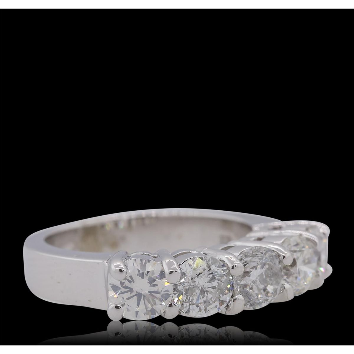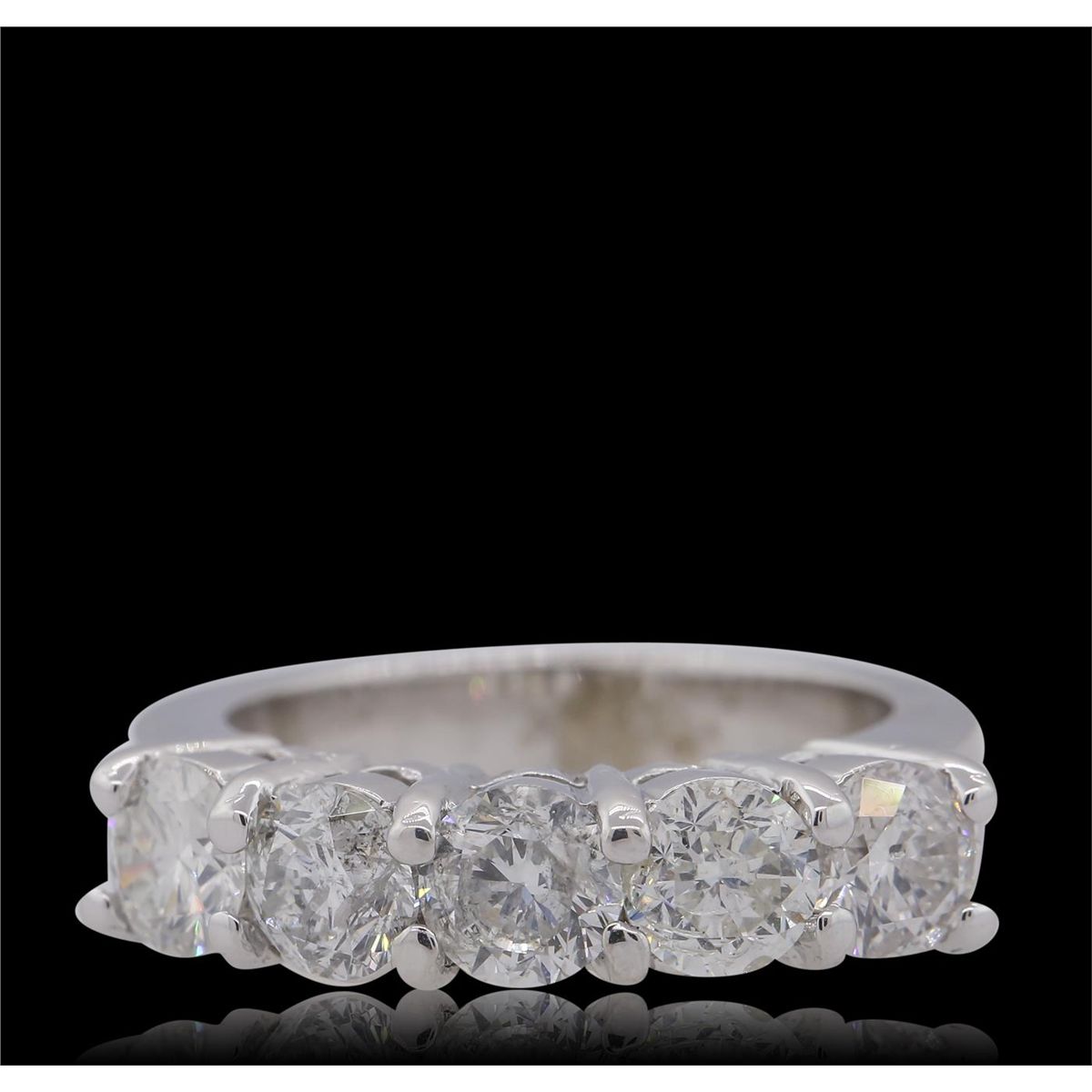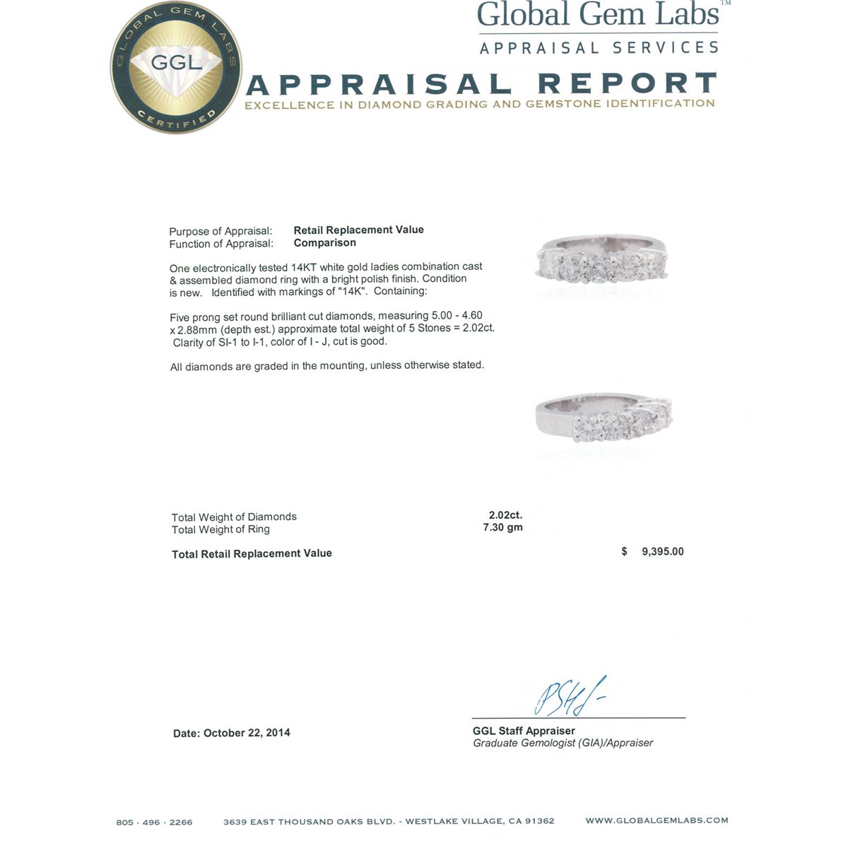 One electronically tested 14KT white gold ladies combination cast & assembled diamond ring with a bright polish finish. Identified with markings of "14K". Condition is new. Containing: Five prong set round brilliant cut diamonds, measuring 5.00 - 4.60 x 2.88mm (depth est.) approximate total weight of 5 Stones = 2.02ct. Clarity: SI-1 to I-1. Color: I - J, Cut is Good. All diamonds are graded in the mounting, unless otherwise stated. Total Weight of Diamonds 2.02ct. Total Weight of Ring 7.30 grams. GGL Appraised at $9,395.00.