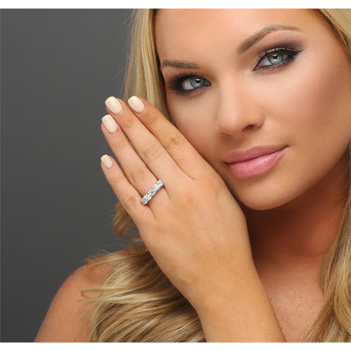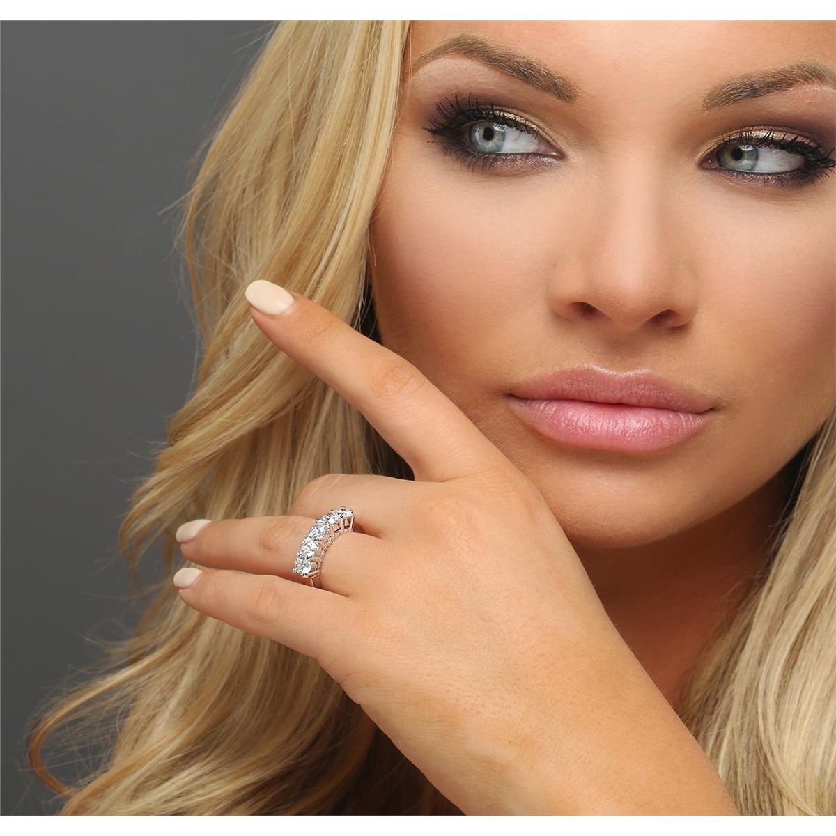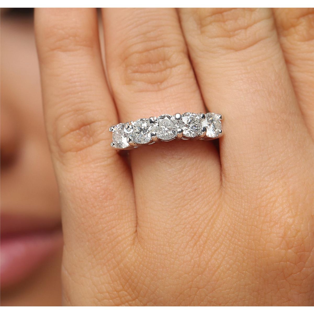One electronically tested 14KT white gold ladies combination cast & assembled diamond ring with a bright polish finish. Identified with markings of "14K". Condition is new. Containing: Five prong set round brilliant cut diamonds, measuring 5.00 - 4.60 x 2.88mm (depth est.) approximate total weight of 5 Stones = 2.02ct. Clarity: SI-1 to I-1. Color: I - J, Cut is Good. All diamonds are graded in the mounting, unless otherwise stated. Total Weight of Diamonds 2.02ct. Total Weight of Ring 7.30 grams. GGL Appraised at $9,395.00.