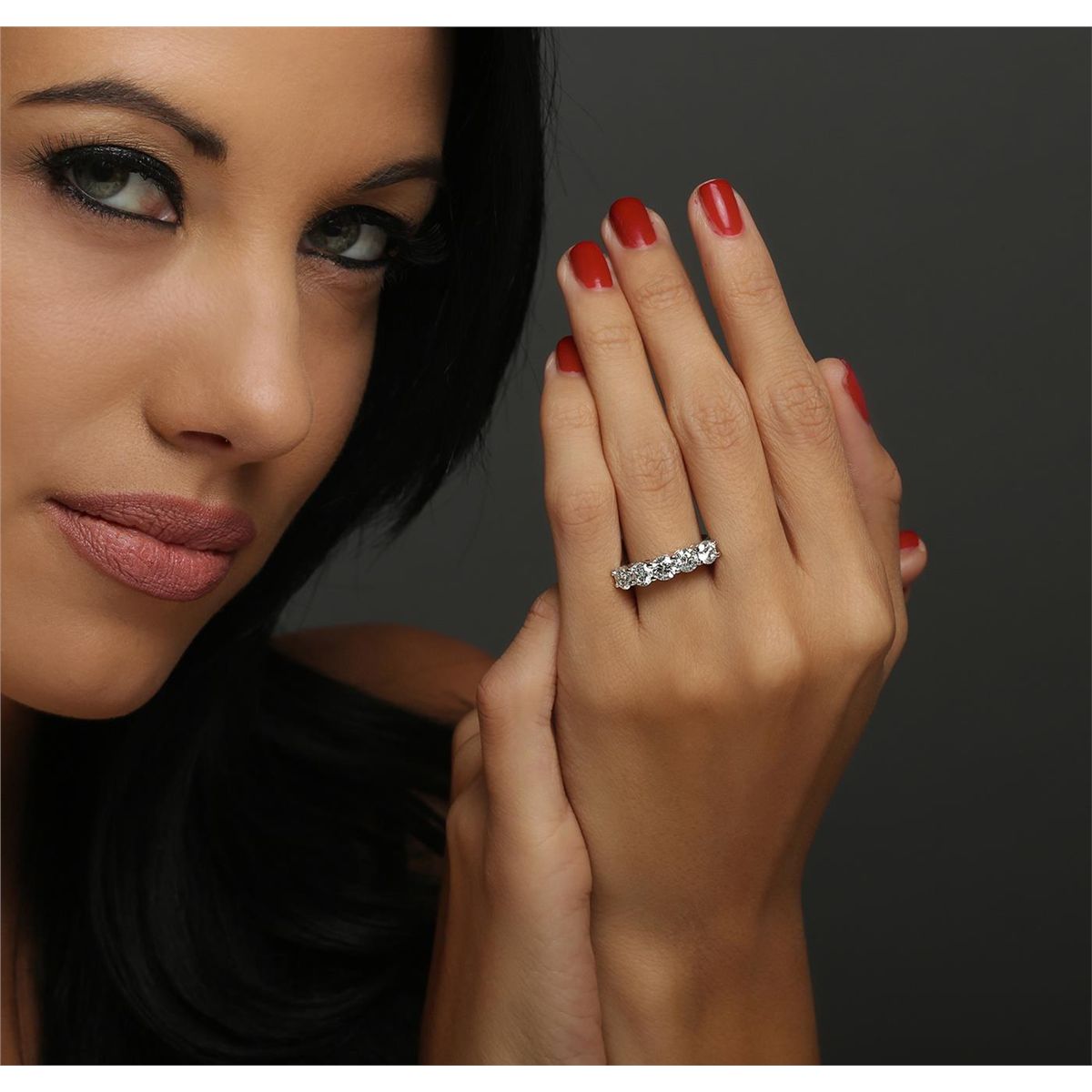 One electronically tested 14KT white gold ladies cast anniversary ring with a bright polish finish. Identified with markings of "14K". Condition is new. Containing: Five prong set round brilliant cut diamonds, measuring 4.80 - 4.80 x 2.88mm (depth est.) approximate total weight of 5 Stones = 2.02ct. Clarity: I-1 to I-2. Color: J, Cut is Good. All diamonds are graded in the mounting, unless otherwise stated. Total Weight of Diamonds 2.02ct. Total Weight of Ring 5.40 grams. GGL Appraised at $8,355.00.