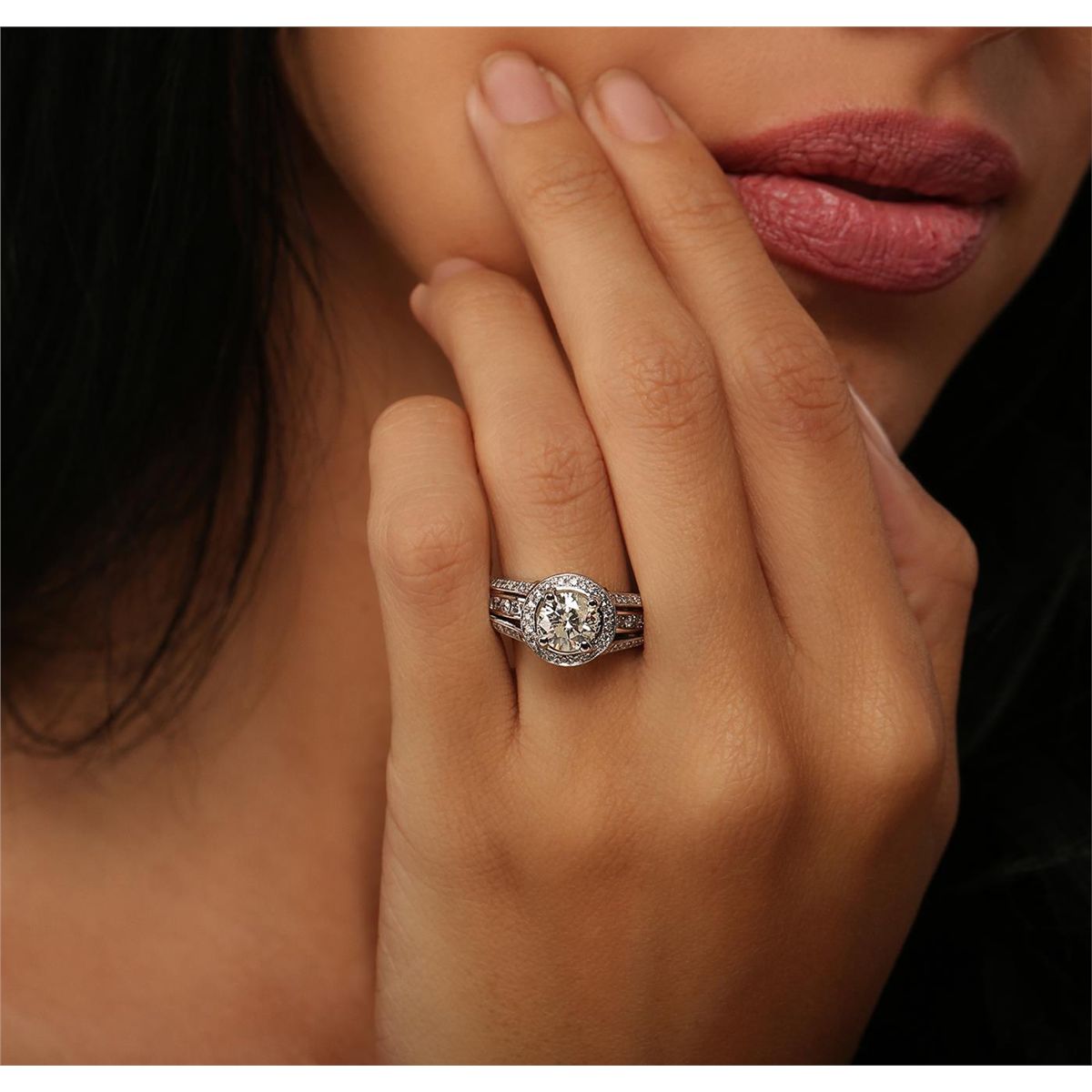 One electronically tested 14KT white gold Ladies combination cast & assembled engagement ring with a bright polish finish. Condition is new. Identified with markings of "14K". Containing: One prong set round brilliant cut diamond, measuring 6.91 - 6.87 x 4.20mm (depth est.) approximate weight of 1.28ct. Clarity: I-1. Color: H, Cut is Good. Seventy-Three prong set round brilliant cut diamonds, measuring 1.40 - 1.40 x 0.84mm (depth est.) approximate. Total Weight of 73 Stones = 0.74ct. Clarity: VS-2 to SI-2. Color: F - G, Cut is Good. EGL USA GEM ID# US 911348403D. All diamonds are graded in the mounting, unless otherwise stated. Total Weight of Diamonds 2.02ct. Total Weight of Engagement Ring 9.80 grams. GGL Appraised at $25,465.00.