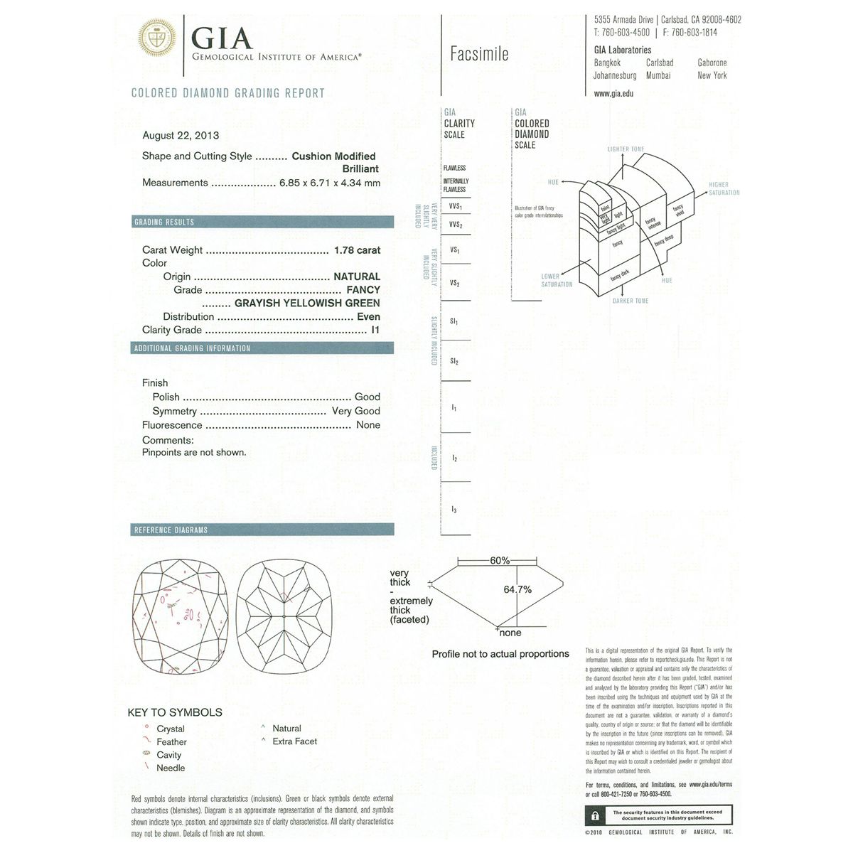 One electronically tested 14KT white gold ladies cast & assembled diamond and yellow sapphire ring. Condition is new, good workmanship. The featured diamond is set within an inner yellow sapphire bezel and an outer diamond bezel, supported by intertwining diamond set shoulders. The ring is completed by a one and one-half millimeter wide band. Bright polish finish with yellow gold accents. Identified with markings of "14K". Containing: One prong set Cushion Modified Brilliant cut diamond, measuring 6.85 x 6.71 x 4.34mm exact weight 1.78ct. GIA Colored Diamond Grading Report attached. Graded loose prior to setting in the GIA Laboratory, Report #1152556405. Clarity I-1. One Hundred Sixteen prong set round brilliant cut diamonds, measuring 0.90 - 0.80 x 0.51mm (depth est.) approximate total weight of 116 Stones = 0.24ct. Graded in the setting. Clarity SI-1 to I-1. Color G - J. Twenty prong set round mixed cut natural yellow sapphires, measuring 1.30 - 1.20 x 0.81 mm, approximate total weight of 0.20ct., clarity is eye clean, type II, medium dark, brownish, yellow color, (GIA Y 6/3), cut is good. Transmitting light with no distortion, transparent. Color grade is an average for the group. Graded in the setting. Total Weight of Colored Stones 0.20 ct. Total Weight of Diamonds 2.02 ct. Total Weight of Ring 3.57 grams. AIG Appraised at $53,830.00.