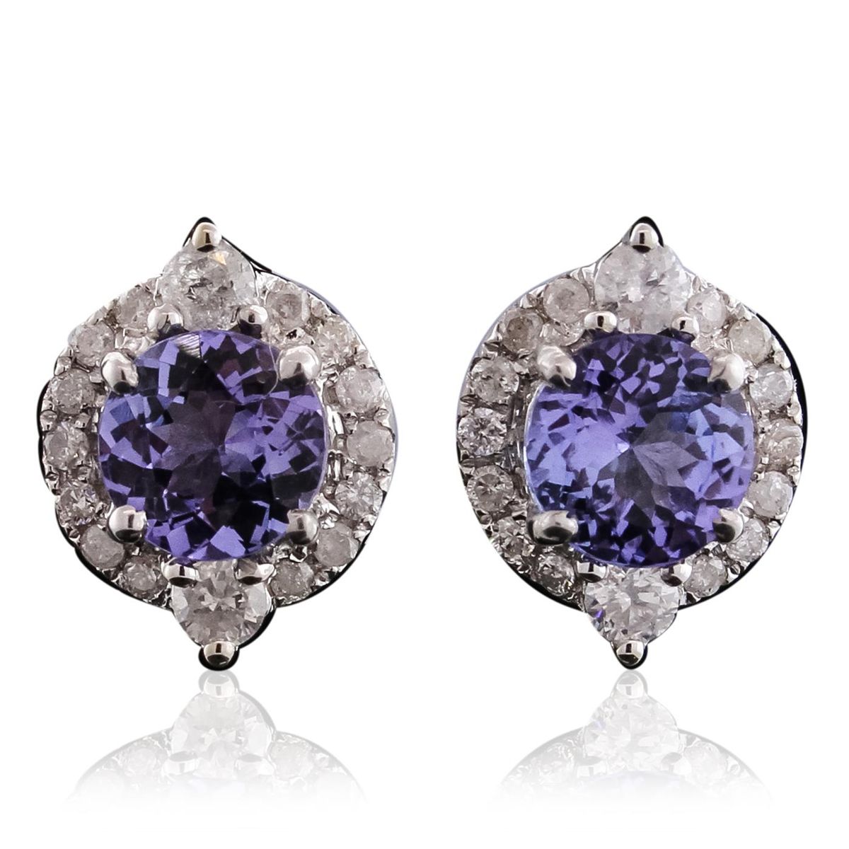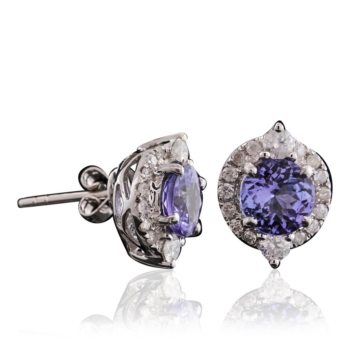 One electronically tested 14KT white gold ladies cast & assembled tanzanite & diamond earrings with standard backs. Each earring features a tanzanite set within a tiered diamond bezel. Trademark is Orianne. Identified with markings of "14K". Condition is new, good workmanship. Containing: Two prong set round mixed cut natural tanzanites, measuring 6.30 - 6.20 x 3.80 mm, approximate total weight of 2.02ct., clarity is eye clean, type I, dark, slightly grayish, bluish violet color, (GIA bV 7/2), cut is good. Measurements are an average for the pair. Transmitting light with no distortion, transparent. Graded in the setting. Tanzanite is a very rare gemstone that is only found in the country of Tanzania. Originally discovered in 1967. Tiffany & Company, named the stone Tanzanite. It is found in the Usumburu Mountains that border the Umba Valley of northern Tanzania. Tanzanite occurs in gray, brown, violet, blue, reddish-purple, & green. The gem is interesting because of its exceptional pleochroism. Rotated in different directions a tanzanite will exhibit multiple changes of color. Tanzanite has a low tolerance to ultrasonic cleaning, and should not be cleaned using this method. Four prong set round brilliant cut diamonds, measuring 2.65 - 2.60 x 1.58mm (depth est.) approximate total weight of 4 Stones = 0.26ct. Graded in the setting. Clarity: I-1 to I-3. Color: H - J Twenty-Eight prong set round brilliant cut diamonds, measuring 1.35 - 1.30 x 0.80mm (depth est.) approximate total weight of 28 Stones = 0.24ct. Graded in the setting. Clarity: I-1 to I-3. Color: H - J. Total Weight of Colored Stones 2.02ct. Total Weight of Diamonds 0.50ct. Total Weight of Earrings 3.27gm. AIG Appraised at $3,630.00.