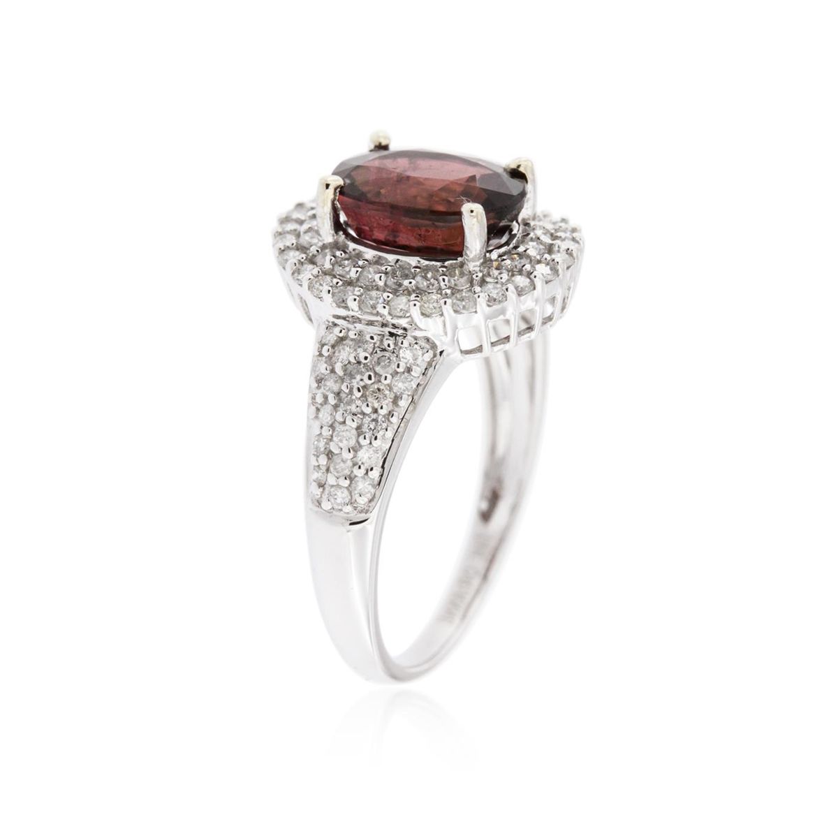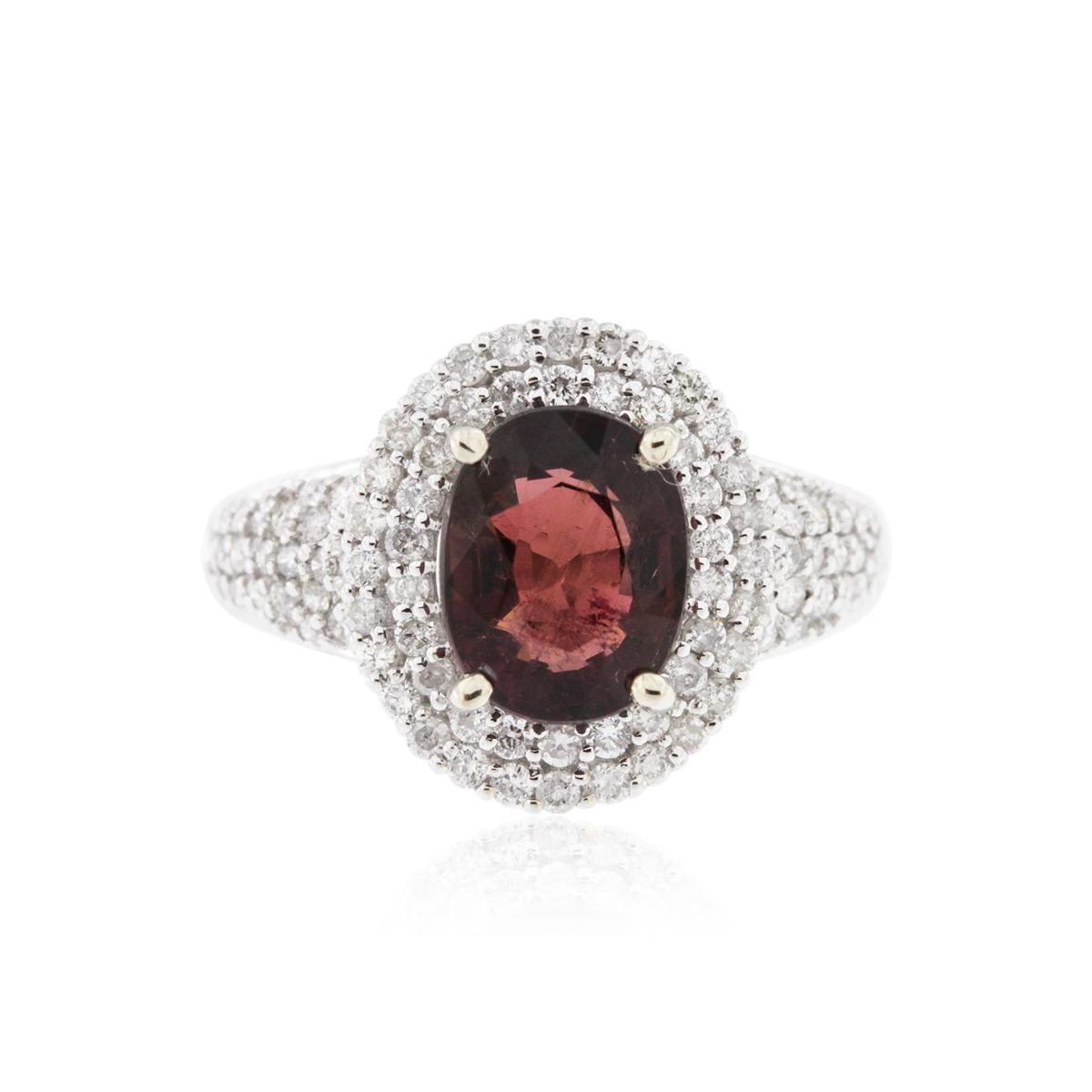 One electronically tested 14KT white gold ladies cast tourmaline and diamond ring with a bright polish finish. Condition is new, good workmanship. The featured tourmaline is set within a tiered diamond bezel supported by tapering diamond set shoulders, completed by a one and one-half millimeter wide band. Trademark is Orianne. Identified with markings of "14K". Containing: One prong set oval mixed cut natural rubellite, measuring 8.73 x 7.10 x 4.90mm, 8%. bulge factor, approximate weight of 2.03ct., clarity is slightly included, type III, medium dark, very slightly brownish, strongly purplish red color, (GIA stpR 6/3), cut is good. Transmitting light with a minimum of distortion, transparent. Naturally occurring internal & external characteristics are present. Graded in the setting. Ninety prong set round brilliant cut diamonds, measuring 1.30 - 1.10 x 0.72mm (depth est.) approximate. Total Weight of 90 Stones = 0.63ct. Graded in the setting. Clarity: SI-2 to I-2. Color: G - I. Total Weight of Colored Stones 2.03ct. Total Weight of Diamonds 0.63ct. Total Weight of Ring 3.75 grams. AIG Appraised at $3,965.00.