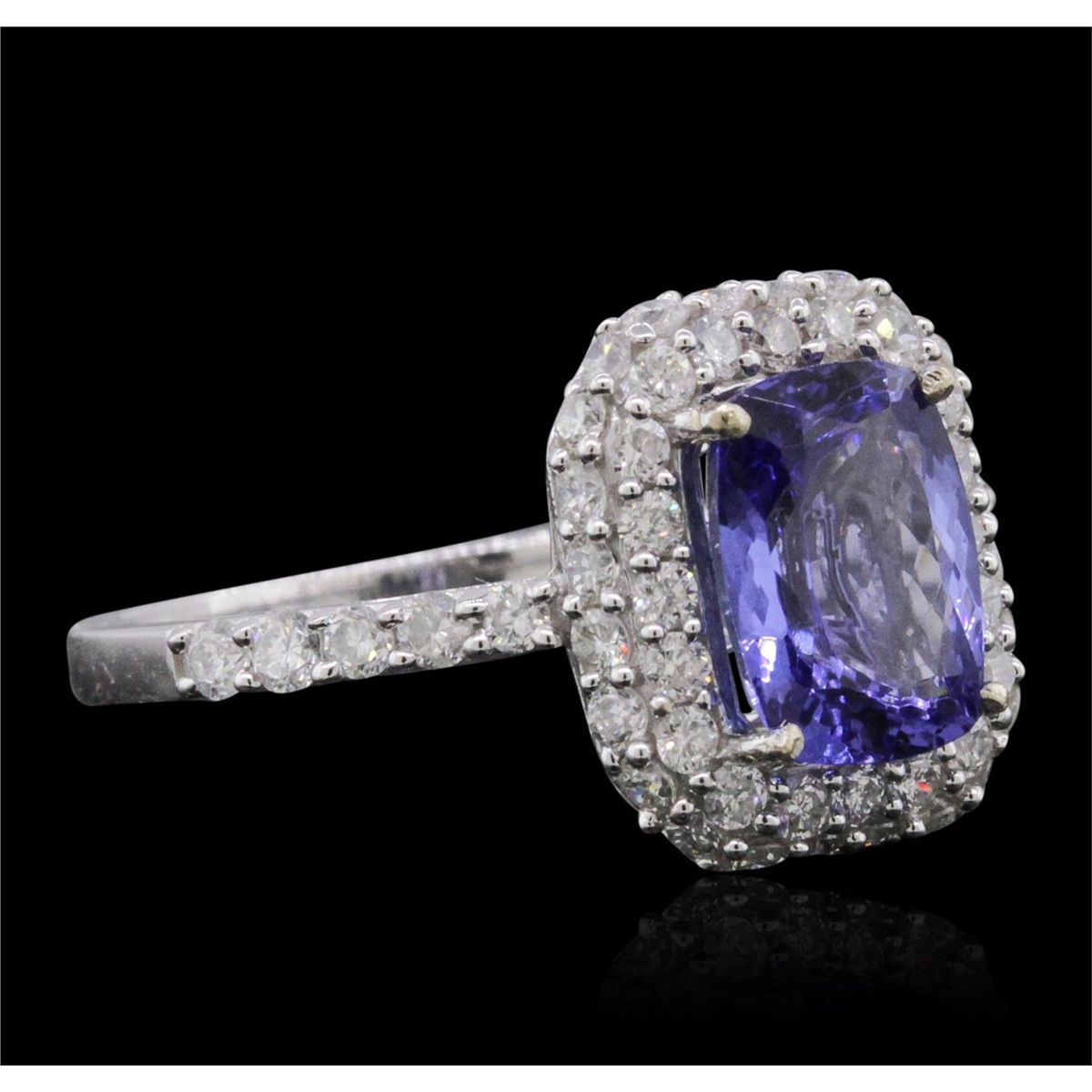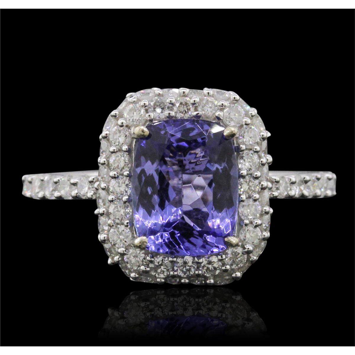 One electronically tested 14KT white gold ladies cast tanzanite & diamond ring with a bright finish. The featured tanzanite is set within a tiered diamond bezel, supported by an elaborate white gold under gallery and diamond set shoulders, completed by a two millimeter wide band. Trademark is Orianne. Identified with markings of "14K". Condition is new, good workmanship. Containing: One prong set rectangular cushion mixed cut natural tanzanite, measuring 8.80 x 6.80 x 4.15mm, 4% bulge factor, approximate weight of 2.03ct., clarity is eye clean, type I, medium dark, very slightly grayish, bluish violet color, (GIA bV 6/3), cut is good. Transmitting light with no distortion, transparent. Graded in the setting. Tanzanite is a very rare gemstone that is only found in the country of Tanzania. Originally discovered in 1967. Tiffany & Company, named the stone Tanzanite. It is found in the Usumburu Mountains that border the Umba Valley of northern Tanzania. Tanzanite occurs in gray, brown, violet, blue, reddish-purple, & green. The gem is interesting because of its exceptional pleochroism. Rotated in different directions a tanzanite will exhibit multiple changes of color. Tanzanite has a low tolerance to ultrasonic cleaning, and should not be cleaned using this method. Fifty-Four prong set round brilliant cut diamonds, measuring 1.50 - 1.40 x 0.88mm (depth est.) approximate total weight of 54 Stones = 0.60ct. Graded in the setting. Clarity: SI-2 to I-1. Color: G - I. Total Weight of Colored Stones 2.03ct. Total Weight of Diamonds 0.60ct. Total Weight of Ring 3.32 grams. AIG Appraised at $6,800.00.