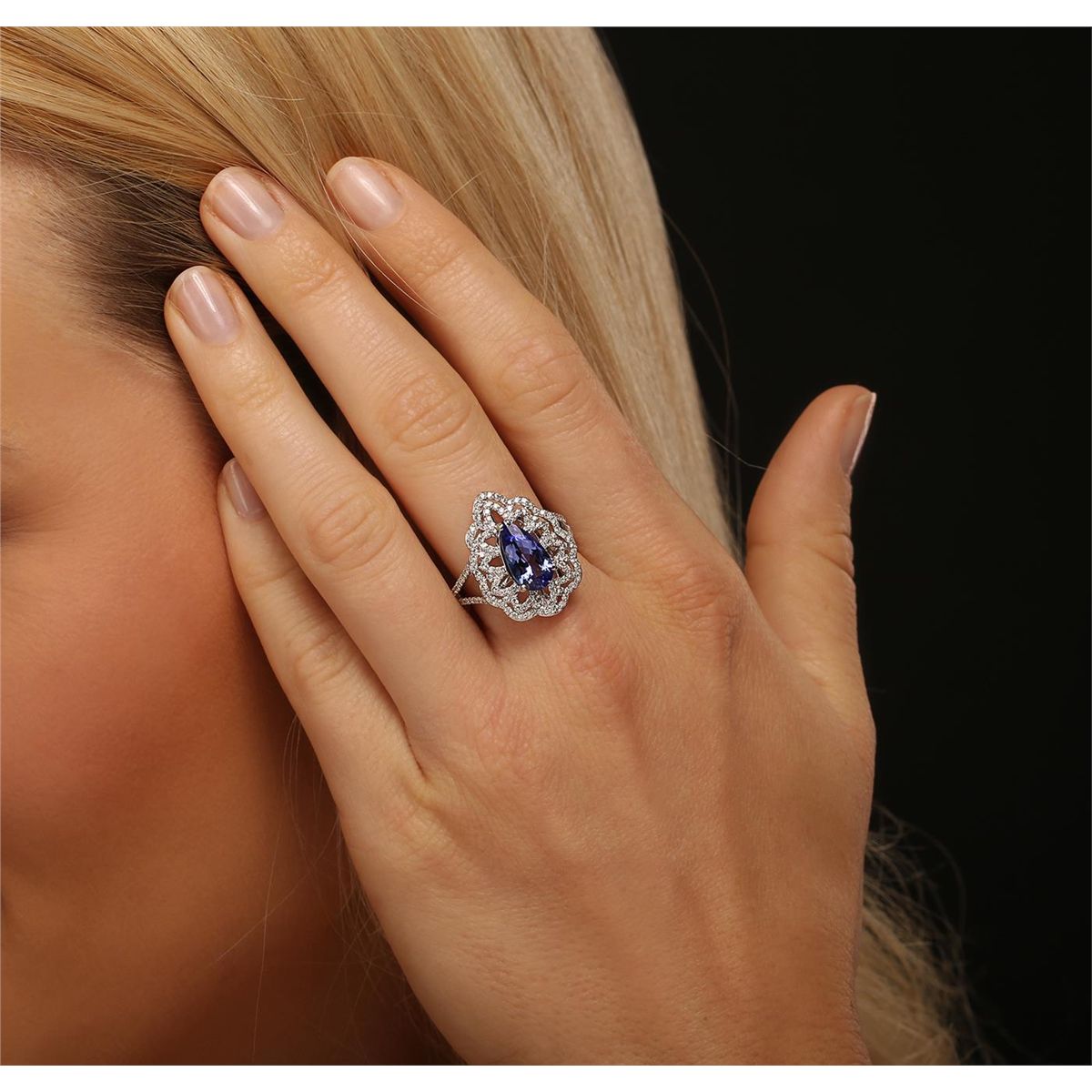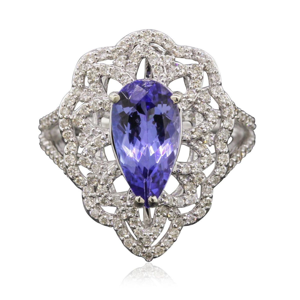 One electronically tested 14KT white gold ladies cast tanzanite and diamond ring with a bright polish finish. The featured tanzanite is set within a diamond lattice gallery supported by diamond set split shoulders, completed by a one and one-half millimeter wide band. Trademark is PMI. Identified with markings of "14K". Condition is new, good workmanship. Containing: One prong set pear mixed cut natural tanzanite, measuring 12.05 x 6.40 x 3.70mm, 6%. bulge factor, approximate weight of 2.03ct., clarity is eye clean, type I, medium dark, moderately strong, bluish violet color, (GIA bV 6/4), cut is good. Transmitting light with no distortion, transparent. Graded in the setting. Tanzanite is a very rare gemstone that is only found in the country of Tanzania. Originally discovered in 1967. Tiffany & Company, named the stone Tanzanite. It is found in the Usumburu Mountains that border the Umba Valley of northern Tanzania. Tanzanite occurs in gray, brown, violet, blue, reddish-purple, & green. The gem is interesting because of its exceptional pleochroism. Rotated in different directions a tanzanite will exhibit multiple changes of color. Tanzanite has a low tolerance to ultrasonic cleaning, and should not be cleaned using this method. One Hundred Forty-Two prong set round brilliant cut diamonds, measuring 1.10 - 1.00. x 0.63mm (depth est.) approximate total weight of 142 Stones = 0.69ct. Graded in the setting. Clarity: VS-2 to SI-2 . Color: G - I. Total Weight of Colored Stones 2.03ct. Total Weight of Diamonds 0.69ct. Total Weight of Ring 5.20 grams. AIG Appraised at $8,595.00.