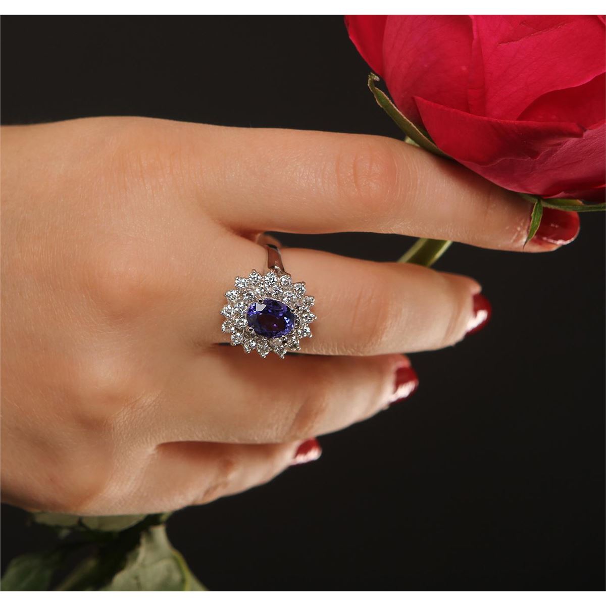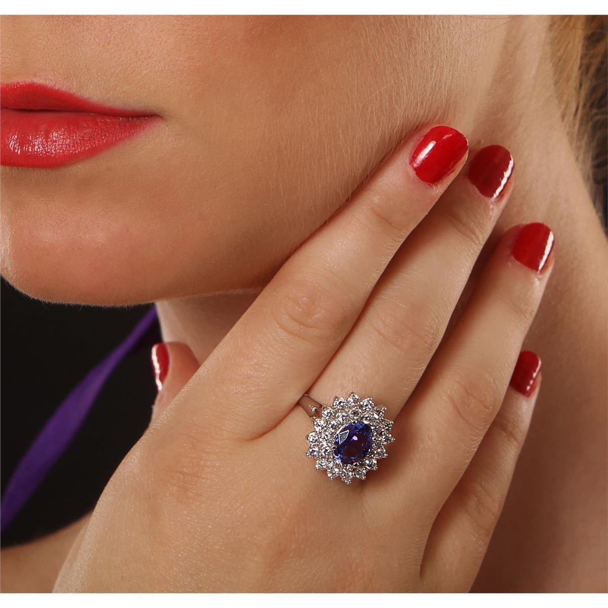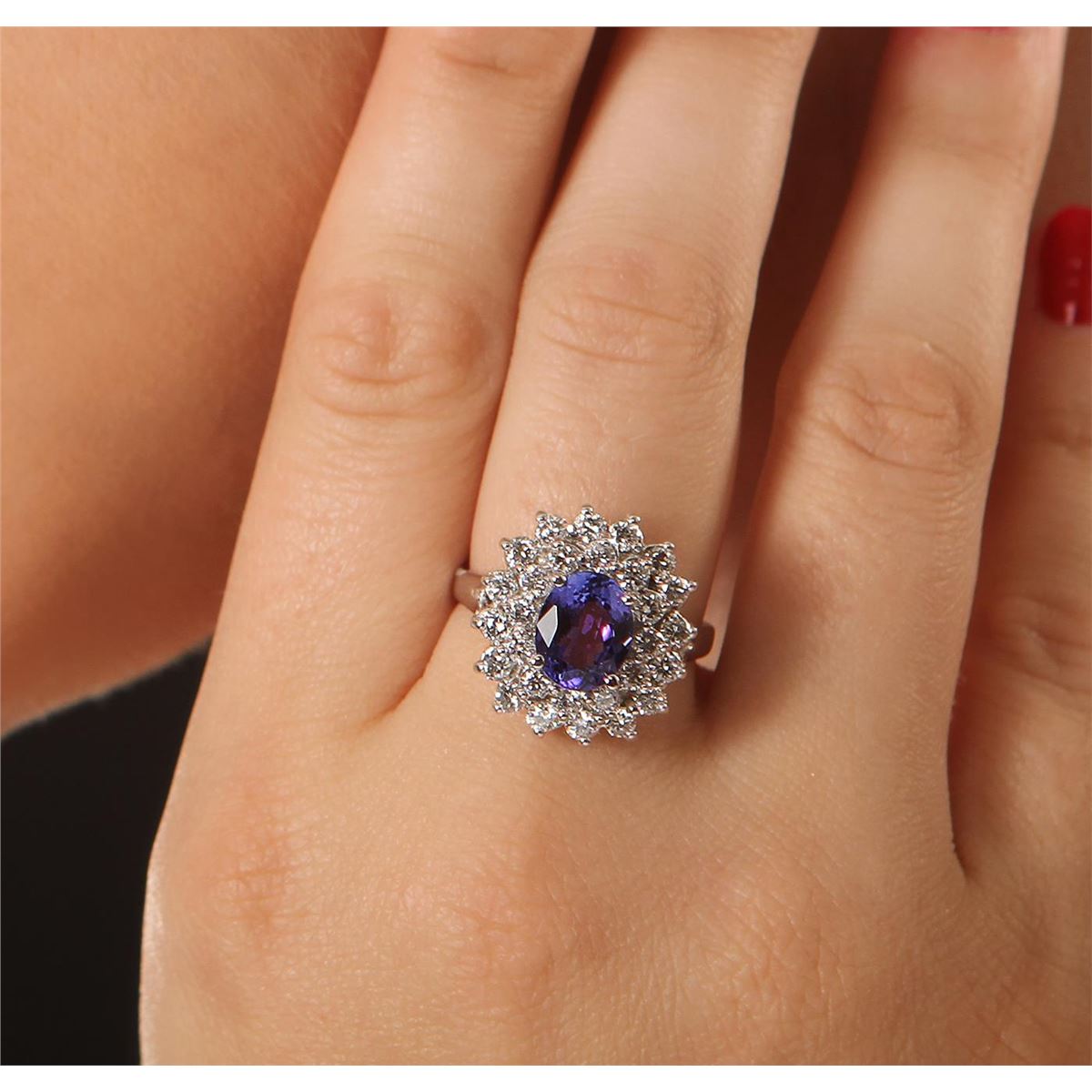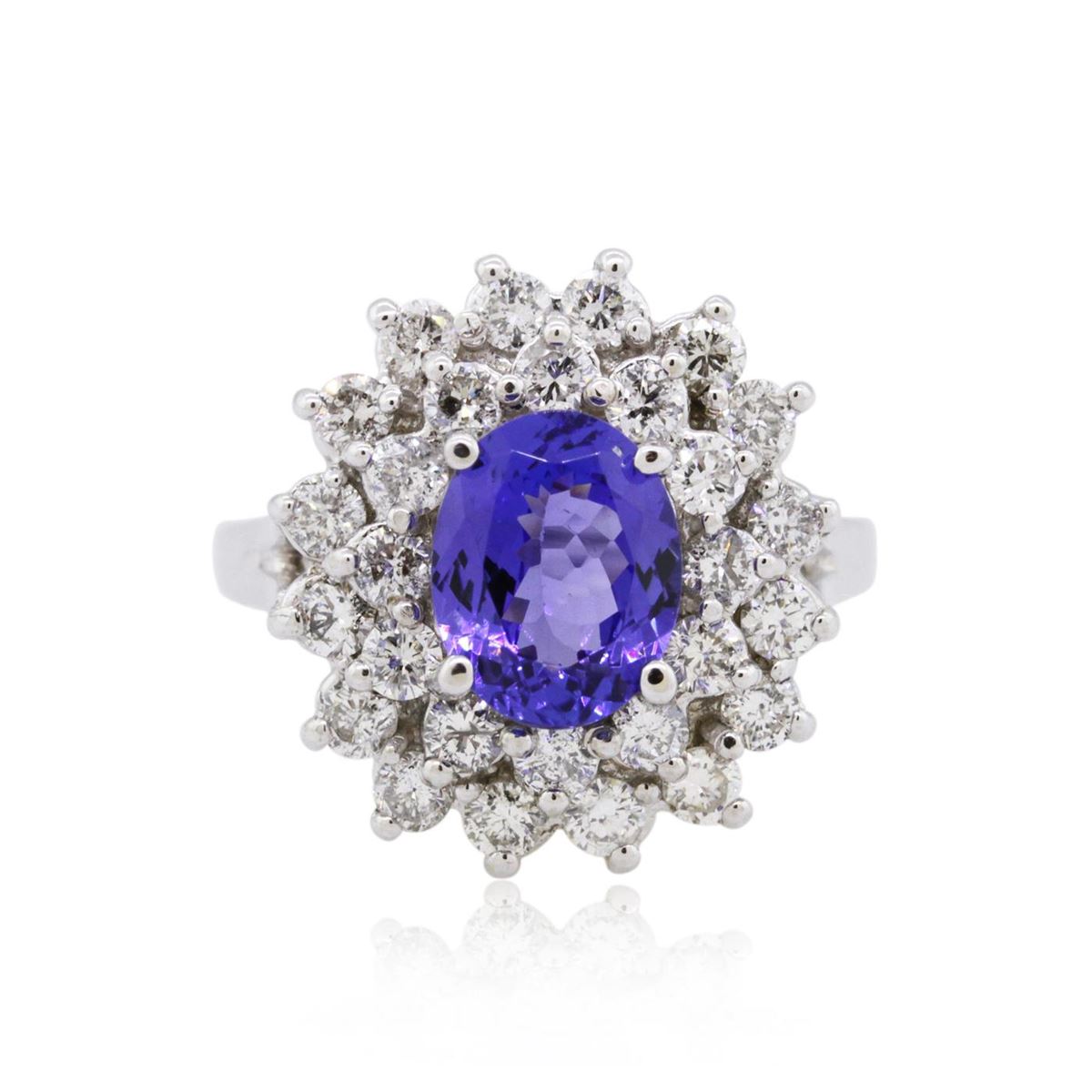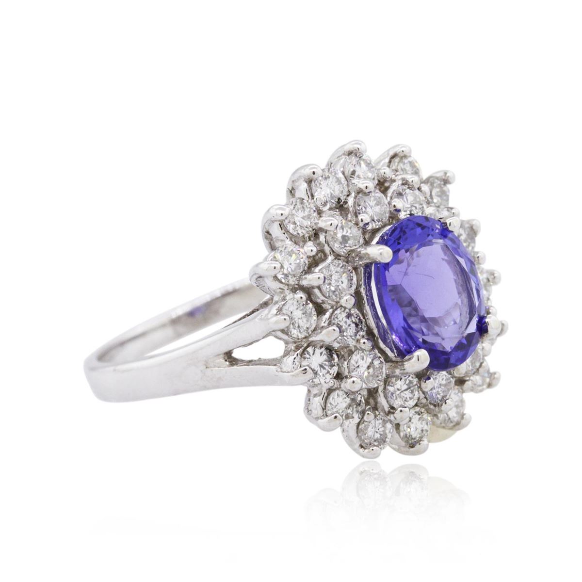 One electronically tested 14KT white gold ladies cast tanzanite and diamond ring with a bright polish finish. Condition is new, good workmanship. The featured tanzanite is set within a floral diamond bezel, supported by split shoulders and completed by a two millimeter wide band. Identified with markings of "14K". Containing: One prong set oval mixed cut natural tanzanite, measuring 8.90 x 7.00 x 4.40mm, 8% bulge factor, approximate weight of 2.03ct., clarity is eye clean, type I, medium, very slightly grayish, bluish violet color, (GIA bV 5/3), cut is good. Transmitting light with no distortion, transparent. Graded in the setting. Tanzanite is a very rare gemstone that is only found in the country of Tanzania. Originally discovered in 1967. Tiffany & Company, named the stone Tanzanite. It is found in the Usumburu Mountains that border the Umba Valley of northern Tanzania. Tanzanite occurs in gray, brown, violet, blue, reddish-purple, & green. The gem is interesting because of its exceptional pleochroism. Rotated in different directions a tanzanite will exhibit multiple changes of color. Tanzanite has a low tolerance to ultrasonic cleaning, and should not be cleaned using this method. Twenty-eight prong set round brilliant cut diamonds, measuring 2.40 - 2.40 x 1.44mm (depth est.) approximate total weight of 28 Stones = 1.39ct. Graded in the setting. Clarity SI-1 to I-1. Color G - I. Total Weight of Colored Stones 2.03ct. Total Weight of Diamonds 1.39ct. Total Weight of Ring 7.40gm. AIG Appraised at $10,115.00.