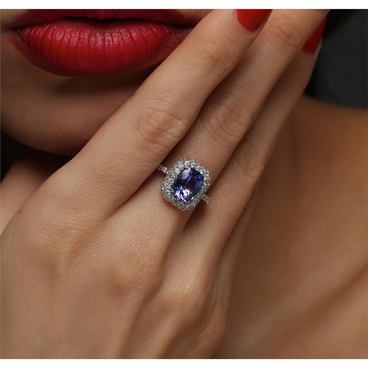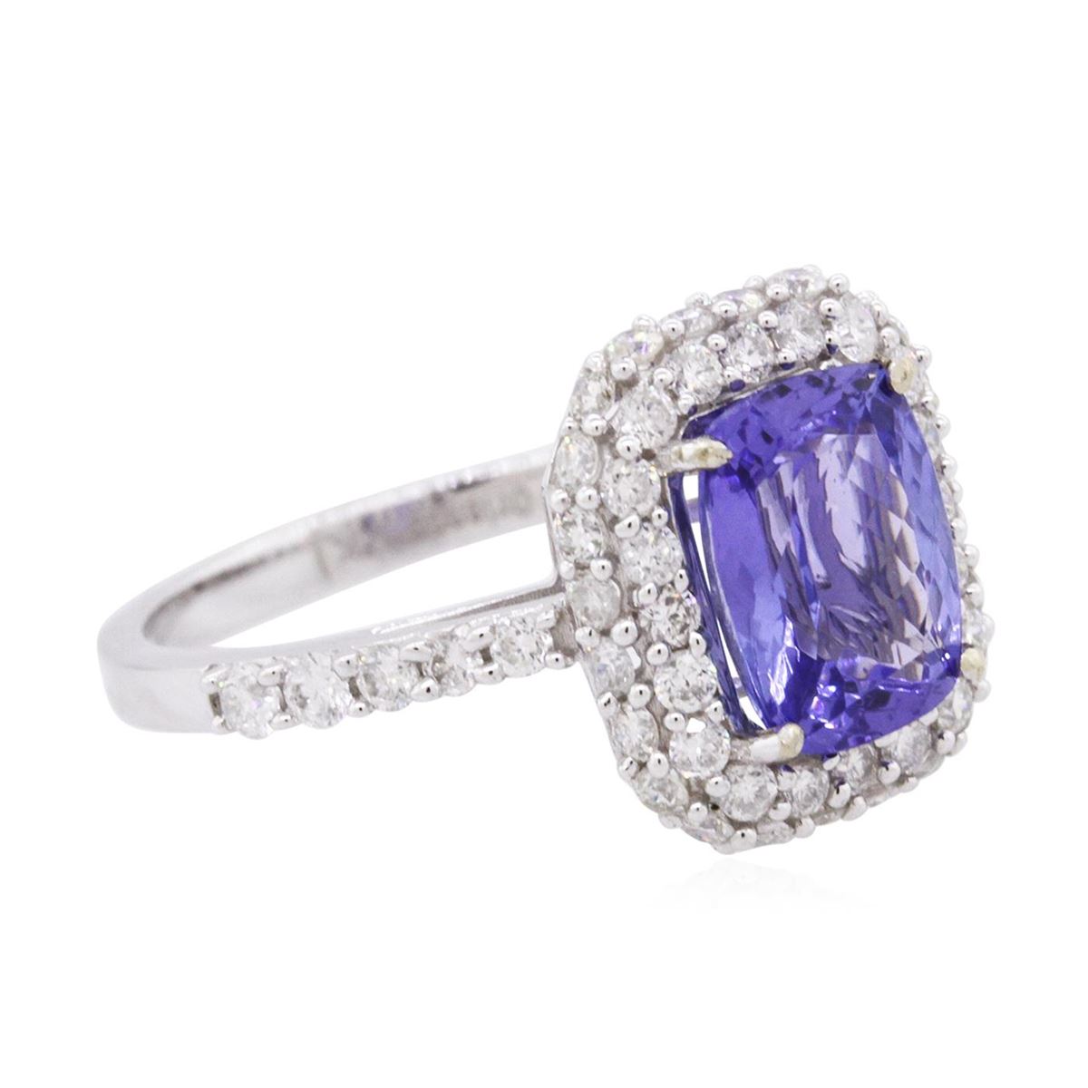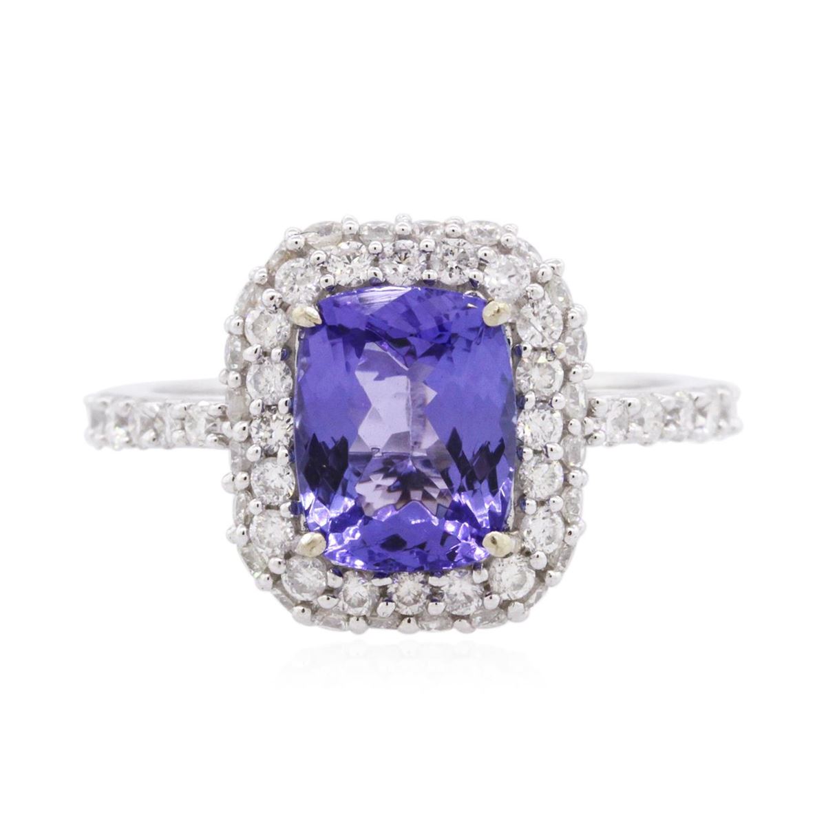 One electronically tested 14KT white gold ladies cast tanzanite & diamond ring with a bright finish. The featured tanzanite is set within a tiered diamond bezel, supported by an elaborate white gold under gallery and diamond set shoulders, completed by a two millimeter wide band. Trademark is Orianne. Identified with markings of "14K". Condition is new, good workmanship. Containing: One prong set rectangular cushion mixed cut natural tanzanite, measuring 8.80 x 6.80 x 4.15mm, 4% bulge factor, approximate weight of 2.03ct., clarity is eye clean, type I, medium dark, very slightly grayish, bluish violet color, (GIA bV 6/3), cut is good. Transmitting light with no distortion, transparent. Graded in the setting. Tanzanite is a very rare gemstone that is only found in the country of Tanzania. Originally discovered in 1967. Tiffany & Company, named the stone Tanzanite. It is found in the Usumburu Mountains that border the Umba Valley of northern Tanzania. Tanzanite occurs in gray, brown, violet, blue, reddish-purple, & green. The gem is interesting because of its exceptional pleochroism. Rotated in different directions a tanzanite will exhibit multiple changes of color. Tanzanite has a low tolerance to ultrasonic cleaning, and should not be cleaned using this method. Fifty-Four prong set round brilliant cut diamonds, measuring 1.50 - 1.40 x 0.88mm (depth est.) approximate total weight of 54 Stones = 0.60ct. Graded in the setting. Clarity: SI-2 to I-1. Color: G - I. Total Weight of Colored Stones 2.03ct. Total Weight of Diamonds 0.60ct. Total Weight of Ring 3.32 grams. AIG Appraised at $6,800.00.
