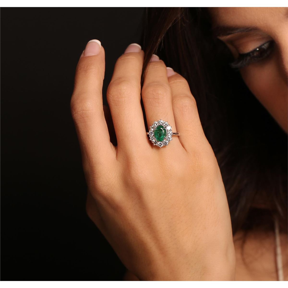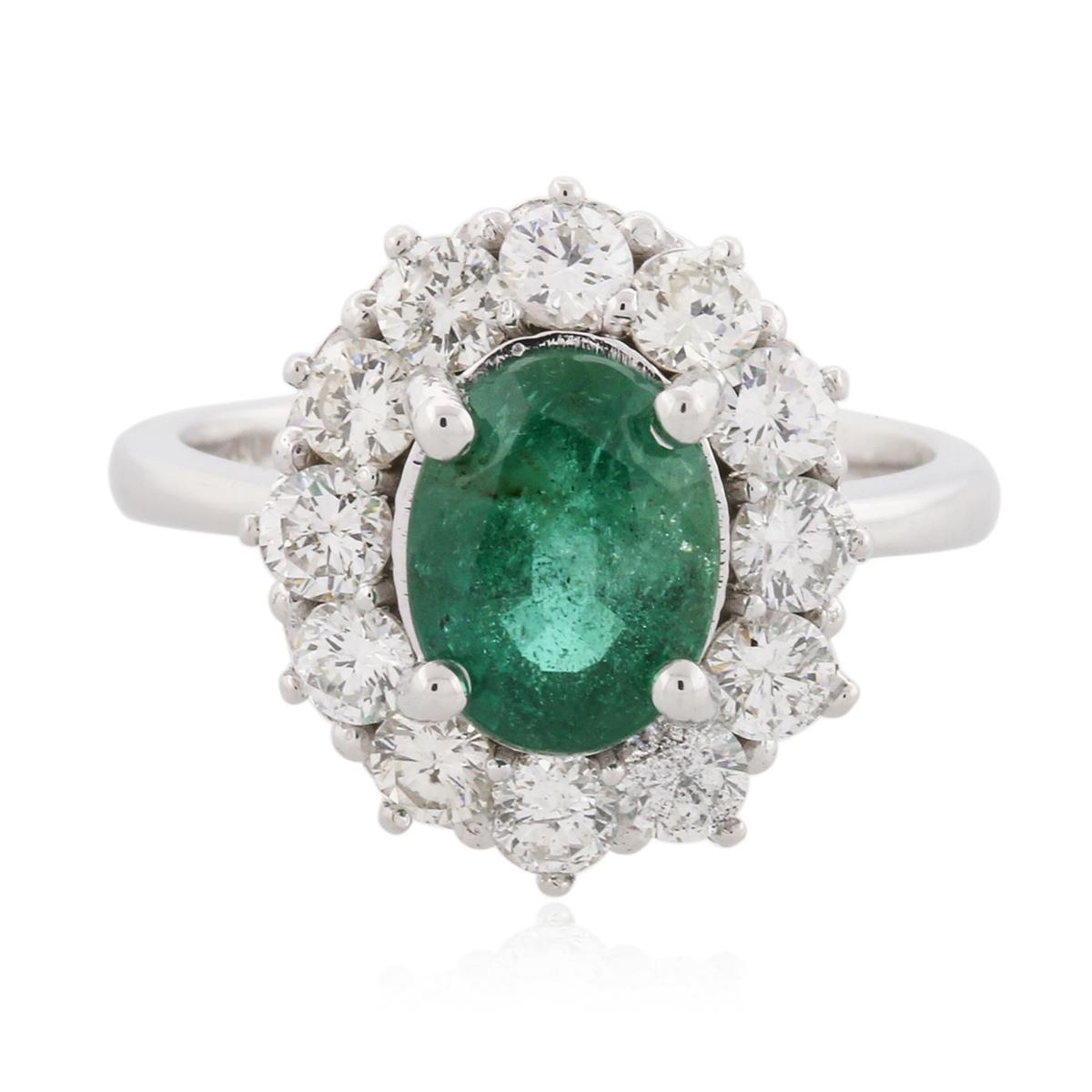Great Condition! One electronically tested 14KT white gold Ladies combination cast & assembled ring with a bright polish finish. Condition is new. Identified with markings of "14K". Containing: One prong set oval modified mixed cut natural emerald, measuring 9.00 x 7.20 x 5.40mm, approximate weight of 2.04ct., clarity is heavily included, type III, medium light, very slightly grayish, very slightly bluish green color, (GIA vslbG 4/3), cut is good. Colored gemstones are presumed to have been subjected to commonly used and possible undetectable color/clarity enhancement processes. Twelve prong set round brilliant cut diamonds, measuring 3.00 - 3.00 x 1.80mm (depth est.) approximate total weight of 12 Stones = 1.26ct. Clarity of I-1 to I-2, Color of I - J, Cut is Good. Total Weight of Colored Stones 2.04ct. Total Weight of Diamonds 1.26ct. Total Weight of Ring 5.10 grams. GGL Appraised at $7,595.00.