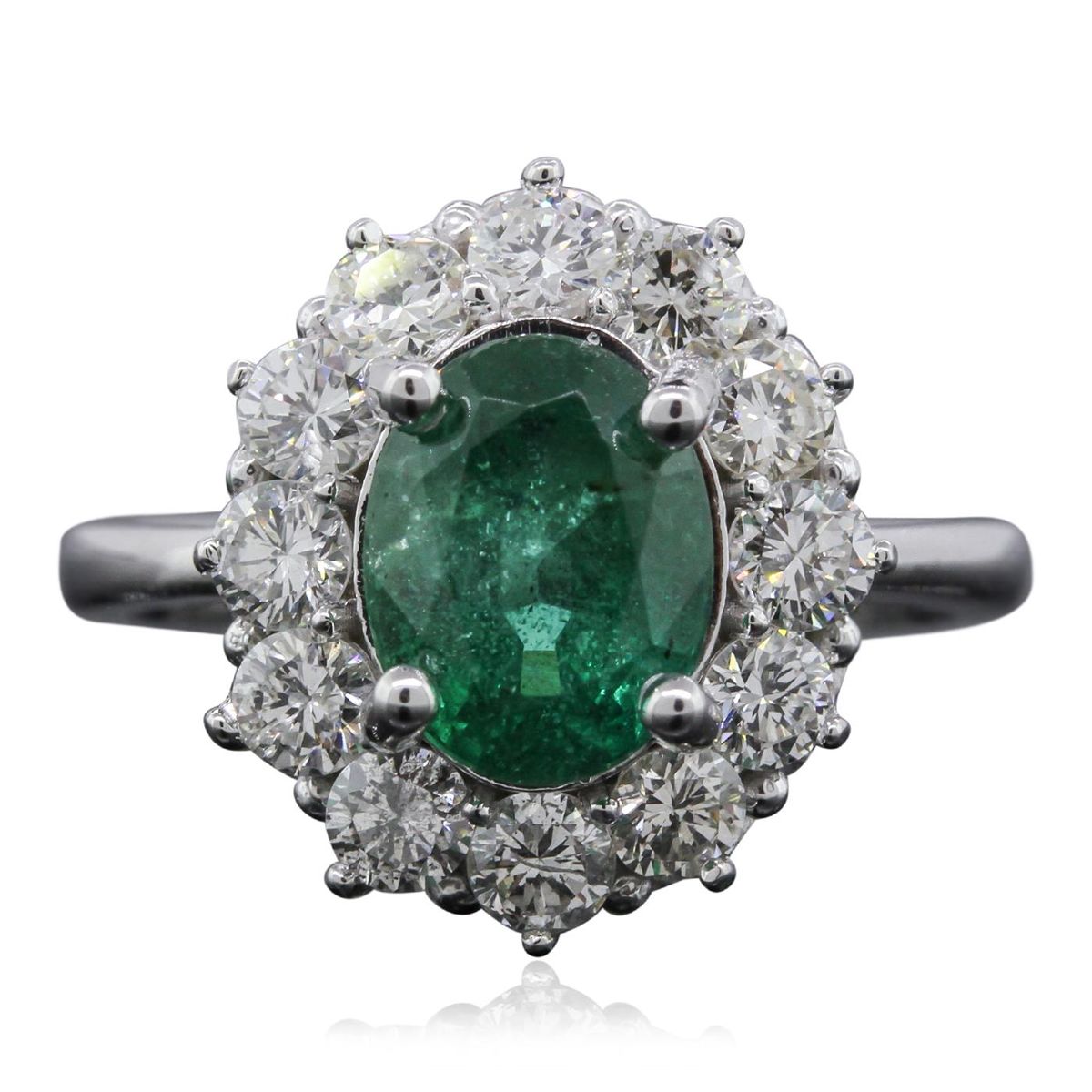Great Condition! One electronically tested 14KT white gold Ladies combination cast & assembled ring with a bright polish finish. Condition is new. Identified with markings of "14K". Containing: One prong set oval modified mixed cut natural emerald, measuring 9.00 x 7.20 x 5.40mm, approximate weight of 2.04ct., clarity is heavily included, type III, medium light, very slightly grayish, very slightly bluish green color, (GIA vslbG 4/3), cut is good. Colored gemstones are presumed to have been subjected to commonly used and possible undetectable color/clarity enhancement processes. Twelve prong set round brilliant cut diamonds, measuring 3.00 - 3.00 x 1.80mm (depth est.) approximate total weight of 12 Stones = 1.26ct. Clarity of I-1 to I-2, Color of I - J, Cut is Good. Total Weight of Colored Stones 2.04ct. Total Weight of Diamonds 1.26ct. Total Weight of Ring 5.10 grams. GGL Appraised at $7,595.00.