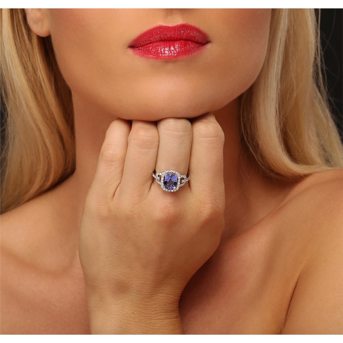 One electronically tested 14KT white gold ladies cast tanzanite and diamond ring with a bright polish finish. Condition is new, good workmanship. The featured tanzanite is set within a diamond bezel supported by diamond set shoulders, completed by a one and one-half millimeter wide band. Trademark is PMI. Identified with markings of "14K". Containing: One prong set rectangular cushion mixed cut natural tanzanite, measuring 9.00 x 6.85 x 3.90mm, 8%. bulge factor, approximate weight of 2.04ct., clarity is eye clean, type I, medium dark, very slightly grayish, bluish violet color, (GIA bV 6/3), cut is good. Transmitting light with no distortion, transparent. Graded in the setting. Tanzanite is a very rare gemstone that is only found in the country of Tanzania. Originally discovered in 1967. Tiffany & Company, named the stone Tanzanite. It is found in the Usumburu Mountains that border the Umba Valley of northern Tanzania. Tanzanite occurs in gray, brown, violet, blue, reddish-purple, & green. The gem is interesting because of its exceptional pleochroism. Rotated in different directions a tanzanite will exhibit multiple changes of color. Tanzanite has a low tolerance to ultrasonic cleaning, and should not be cleaned using this method. Fifty prong set round brilliant cut diamonds, measuring 1.30 - 1.20 x 0.75mm (depth est.) approximate. Total Weight of 50 Stones = 0.45ct. Graded in the setting. Clarity: I-1 to I-3. Color: H - J. Total Weight of Colored Stones 2.04ct. Total Weight of Diamonds 0.45ct. Total Weight of Ring 3.85 grams. AIG Appraised at $6,410.00.