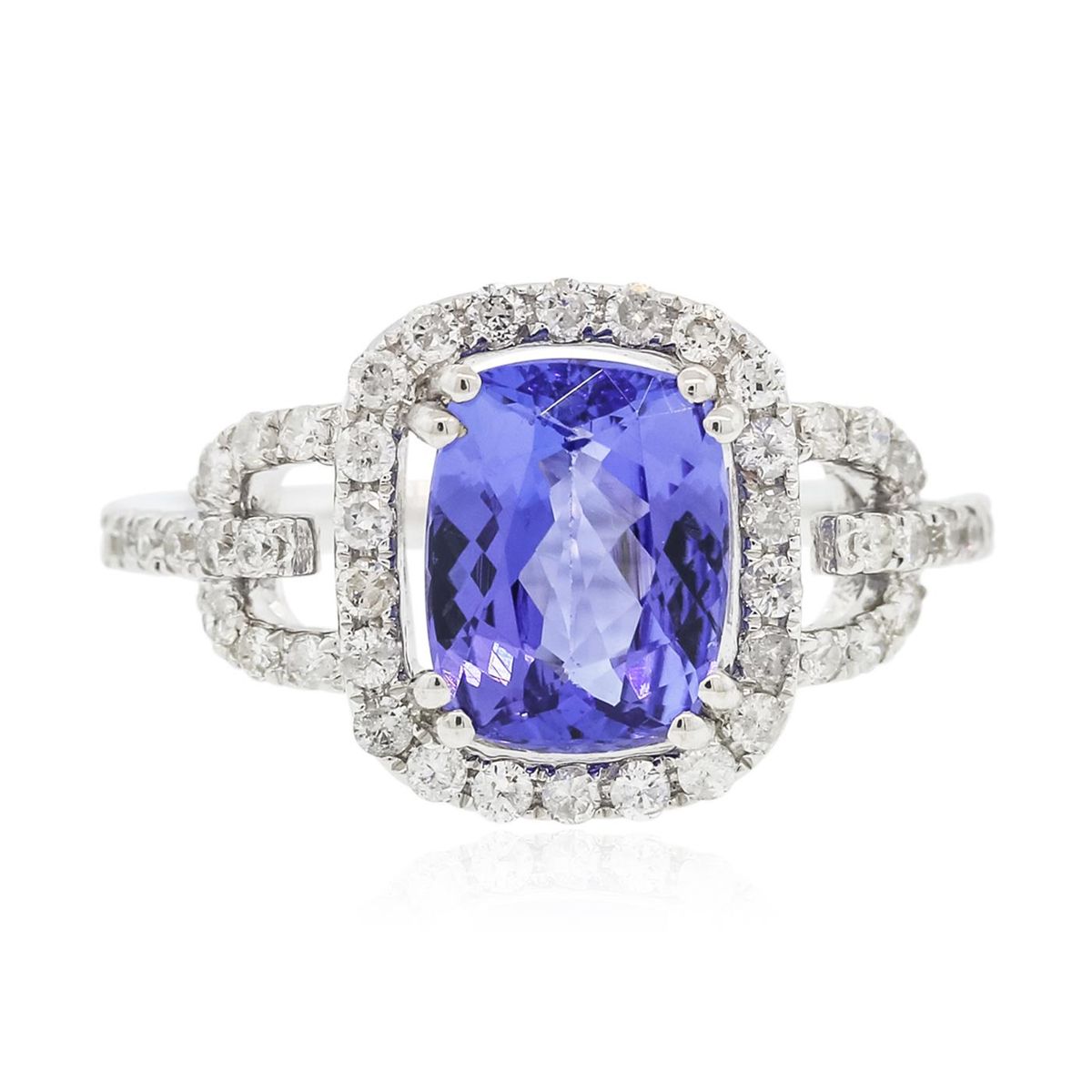 One electronically tested 14KT white gold ladies cast tanzanite and diamond ring with a bright polish finish. Condition is new, good workmanship. The featured tanzanite is set within a diamond bezel supported by diamond set shoulders, completed by a one and one-half millimeter wide band. Trademark is PMI. Identified with markings of "14K". Containing: One prong set rectangular cushion mixed cut natural tanzanite, measuring 9.00 x 6.85 x 3.90mm, 8%. bulge factor, approximate weight of 2.04ct., clarity is eye clean, type I, medium dark, very slightly grayish, bluish violet color, (GIA bV 6/3), cut is good. Transmitting light with no distortion, transparent. Graded in the setting. Tanzanite is a very rare gemstone that is only found in the country of Tanzania. Originally discovered in 1967. Tiffany & Company, named the stone Tanzanite. It is found in the Usumburu Mountains that border the Umba Valley of northern Tanzania. Tanzanite occurs in gray, brown, violet, blue, reddish-purple, & green. The gem is interesting because of its exceptional pleochroism. Rotated in different directions a tanzanite will exhibit multiple changes of color. Tanzanite has a low tolerance to ultrasonic cleaning, and should not be cleaned using this method. Fifty prong set round brilliant cut diamonds, measuring 1.30 - 1.20 x 0.75mm (depth est.) approximate. Total Weight of 50 Stones = 0.45ct. Graded in the setting. Clarity: I-1 to I-3. Color: H - J. Total Weight of Colored Stones 2.04ct. Total Weight of Diamonds 0.45ct. Total Weight of Ring 3.85 grams. AIG Appraised at $6,410.00.