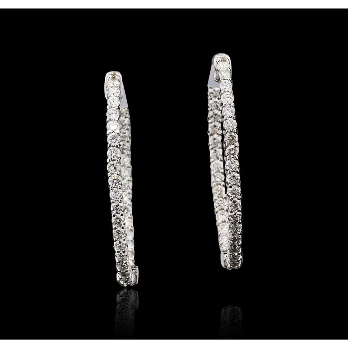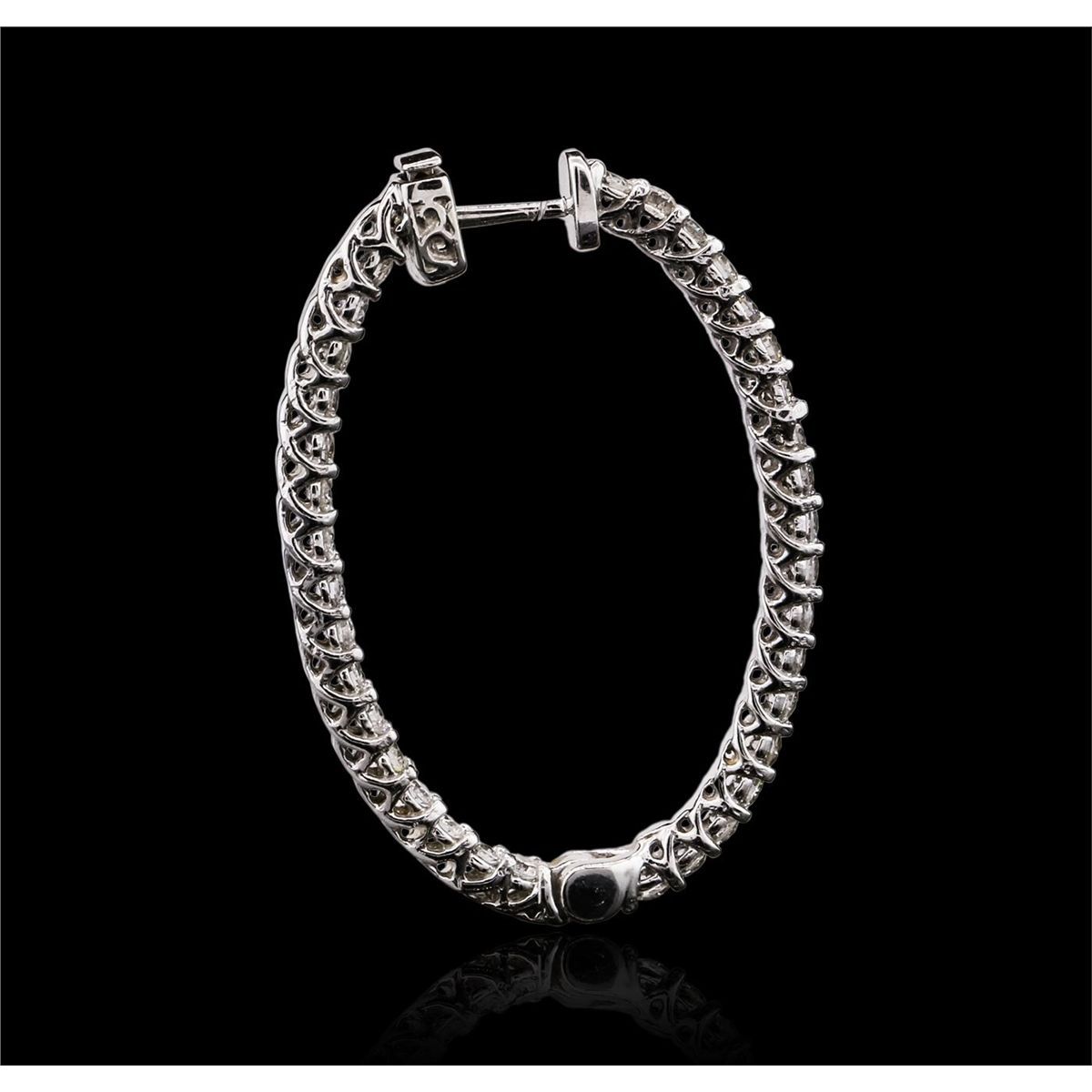 One pair electronically tested 14KT white gold ladies combination cast & assembled hoop earrings with hinged clip backs with a bright polish finish. Identified with markings of "14K". Condition is new. Containing: Seventy prong set round brilliant cut diamonds, measuring 2.00 - 2.00 x 1.20mm (depth est.) approximate total weight of 70 Stones = 2.04ct. Clarity: SI-2 to I-1. Color: I - J, Cut is Good. All diamonds are graded in the mounting, unless otherwise stated. Total Weight of Diamonds 2.04ct. Total Weight of Earrings 9.10 grams. GGL Appraised at $7,120.00.