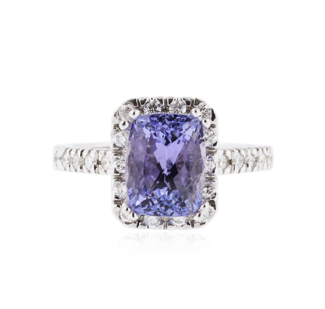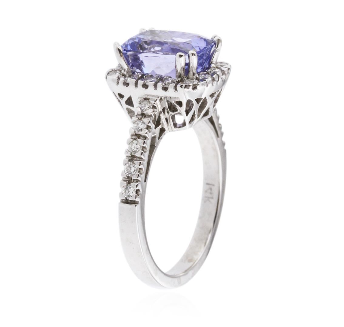 One electronically tested 14KT white gold ladies cast tanzanite and diamond ring with a bright polish finish. Identified with markings of "K14". Condition is new. Containing: One prong set rectangular cushion modified brilliant cut natural tanzanite, measuring 9.00 x 7.00 x 4.13mm, approximate weight of 2.05ct., clarity is eye clean, type I, medium light, very slightly grayish, violet color, (GIA V 4/3), cut is good. Twenty-Six prong set round brilliant cut diamonds, measuring 1.50 - 1.50 x 0.90mm (depth est.) approximate total weight of 26 Stones = 0.32ct. Clarity: SI-2 to I-1. Color: I - J, Cut is Good. Colored gemstones are presumed to have been subjected to commonly used enhancement processes. All diamonds and colored gemstones are graded in the mounting, unless otherwise stated. Total Weight of Colored Stones 2.05ct. Total Weight of Diamonds 0.32ct. Total Weight of Ring 5.50 grams. GGL Appraised at $3,965.00.