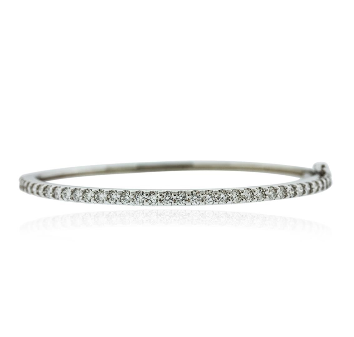 One electronically tested 14KT white gold ladies cast diamond bangle bracelet with a hidden box clasp with safety closer with a bright polish finish. Condition is new. Containing: Thirty-Six prong set round brilliant cut diamonds, measuring 2.50 - 2.50 x 1.50mm (depth est.) approximate total weight of 36 Stones = 2.06ct. Clarity: SI-1 to I-1. Color: H - J, Cut is Good. All diamonds are graded in the mounting, unless otherwise stated. Total Weight of Diamonds 2.06ct. Total Weight of Bangle Bracelet 12.50 grams. GGL Appraised at $6,465.00.