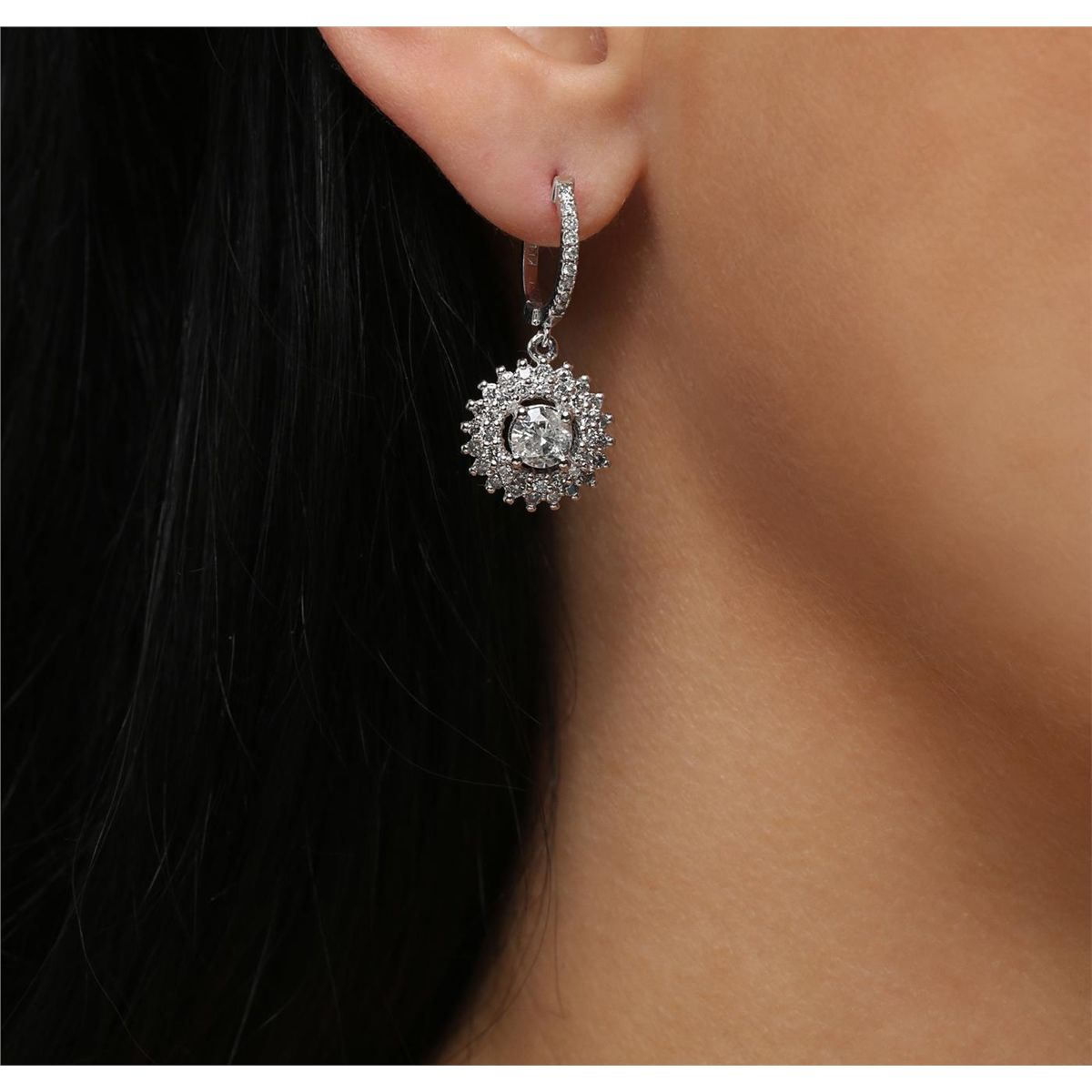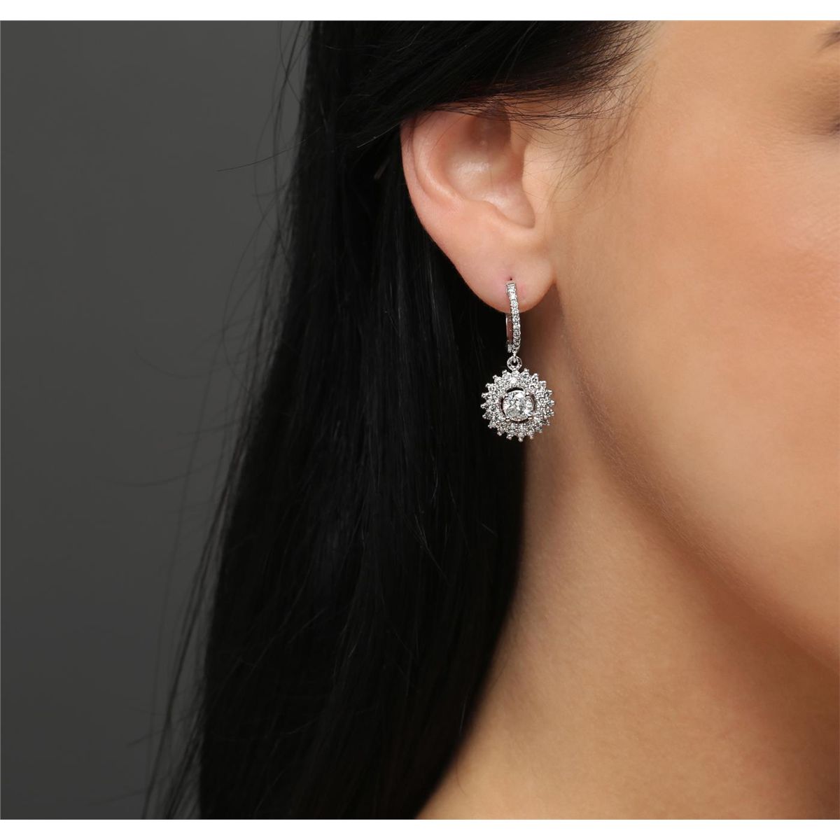One pair electronically tested 14KT white gold Ladies combination cast & assembled earrings with hinged clip backs with a bright polish finish. Condition is new. Identified with markings of "K14". Containing: Two prong set round brilliant cut diamonds, measuring 5.35 - 5.35 x 3.35mm (depth est.) approximate. Total Weight of 2 Stones = 1.17ct. Clarity: I-2. Color: I - J, Cut is Good. Seventy-Two prong set round brilliant cut diamonds, measuring 1.50 - 1.50 x 0.90mm (depth est.) approximate. Total Weight of 72 Stones = 0.89ct. Clarity: I-1 to I-2. Color: I - J, Cut is Good. All grading of diamonds and colored gemstones in this piece of jewelry are graded in the mounting, unless otherwise stated. Total Weight of Diamonds 2.06ct. Total Weight of Earrings 7.00 grams. GGL Appraised at $9,220.00.