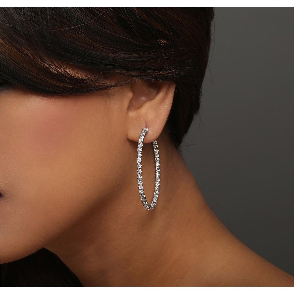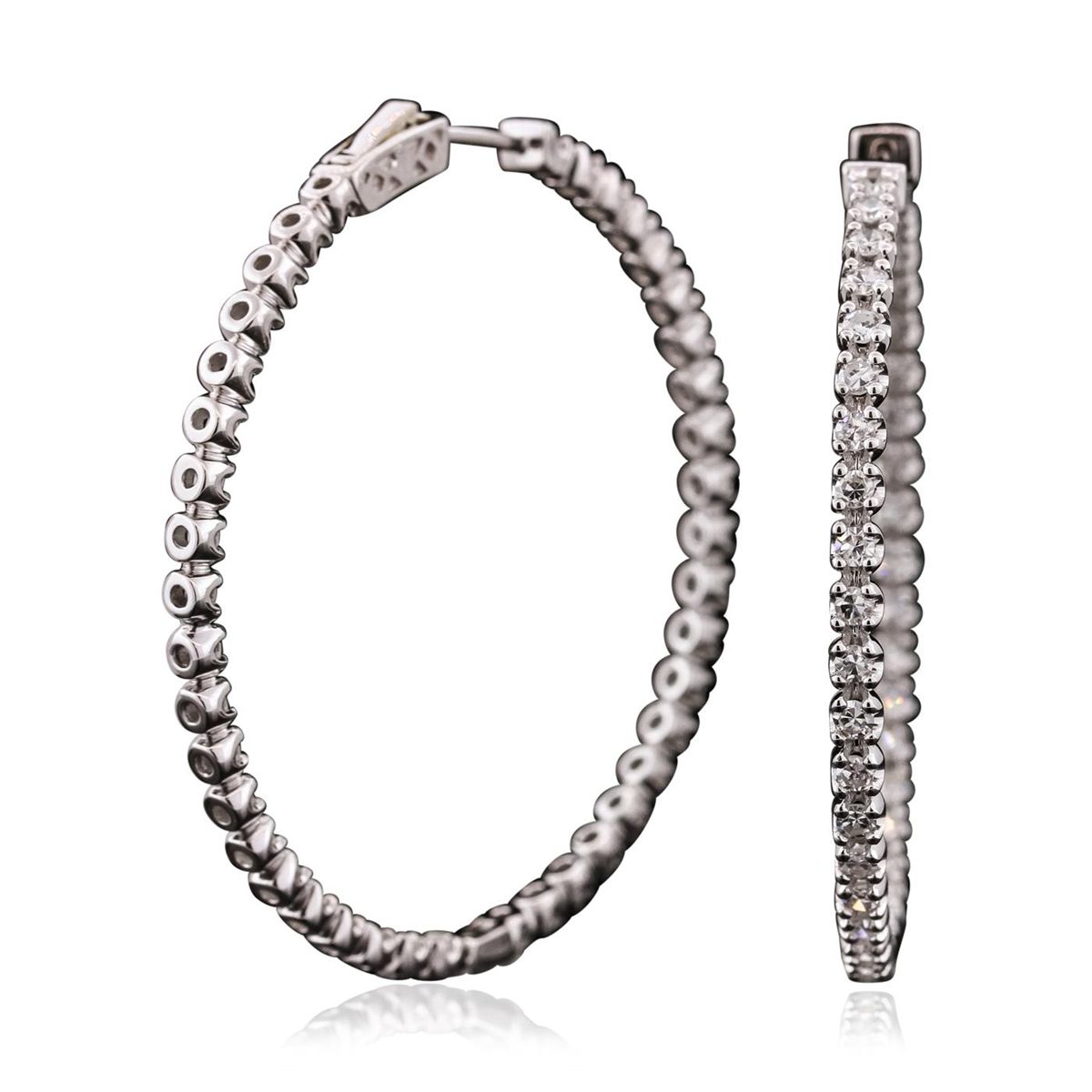 One pair electronically tested 14KT white gold ladies combination cast & assembled diamond hoop earrings with hinged clip backs with a bright polish finish. Identified with markings of "14K". Condition is new. Containing: Eighty-Two prong set single cut diamonds, measuring 1.90 - 1.90 x 1.14mm (depth est.) approximate total weight of 82 Stones = 2.06ct. Clarity: SI-1. Color: I, Cut is Good. All diamonds are graded in the mounting, unless otherwise stated. Total Weight of Diamonds 2.06ct. Total Weight of Earrings 12.70 grams. GGL Appraised at $8,110.00.