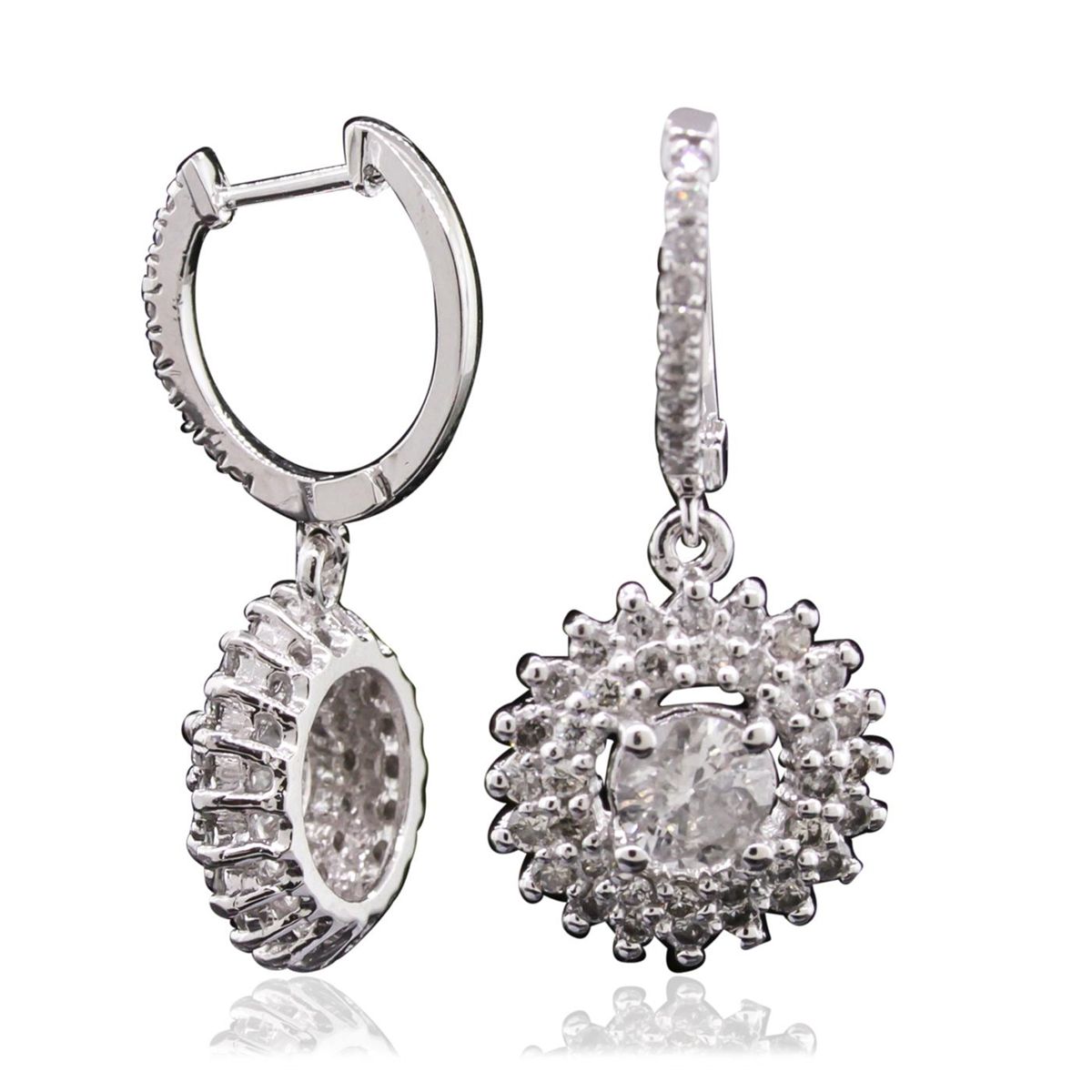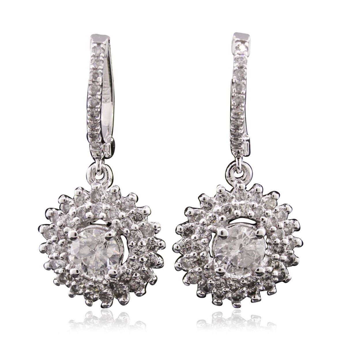 One pair electronically tested 14KT white gold Ladies combination cast & assembled earrings with hinged clip backs with a bright polish finish. Condition is new. Identified with markings of "K14". Containing: Two prong set round brilliant cut diamonds, measuring 5.35 - 5.35 x 3.35mm (depth est.) approximate. Total Weight of 2 Stones = 1.17ct. Clarity: I-2. Color: I - J, Cut is Good. Seventy-Two prong set round brilliant cut diamonds, measuring 1.50 - 1.50 x 0.90mm (depth est.) approximate. Total Weight of 72 Stones = 0.89ct. Clarity: I-1 to I-2. Color: I - J, Cut is Good. All grading of diamonds and colored gemstones in this piece of jewelry are graded in the mounting, unless otherwise stated. Total Weight of Diamonds 2.06ct. Total Weight of Earrings 7.00 grams. GGL Appraised at $9,220.00.
